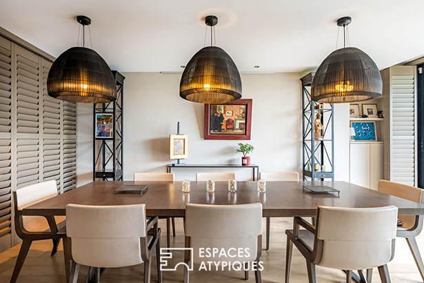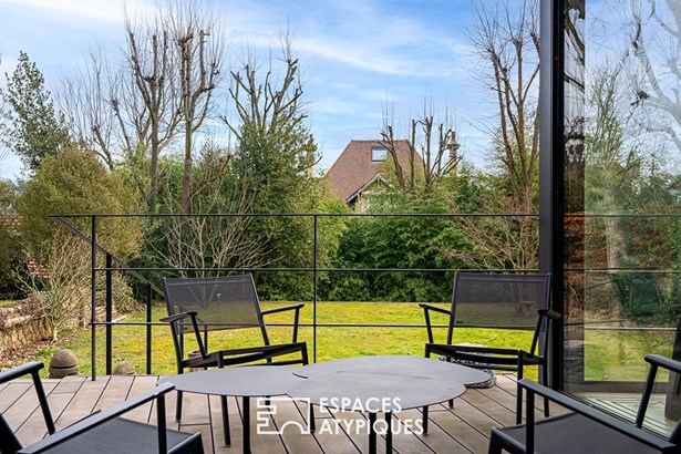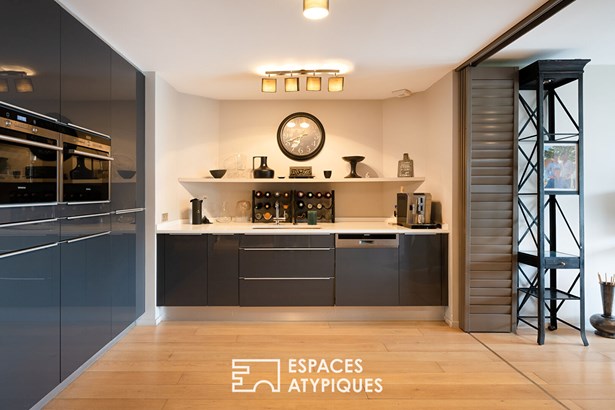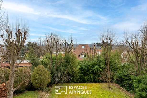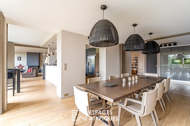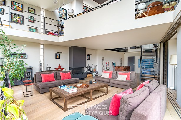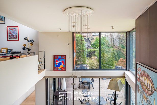 From the entrance, the tone is set with a plunging view of a reception with generous volumes, omnipresent light and optimized layout. The cathedral living room, bathed in light thanks to full-height bay windows, opens onto a huge 80m2 terrace overlooking a vast terraced garden, extremely rare in this area. The fireplace and the movable partitions allow you to modulate the space according to your desires, for warm moments with family or large receptions with friends.