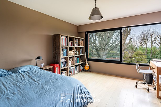 Accessible from the entrance, a large mezzanine office overlooking the living room is ideal for teleworking or a privileged reading space.