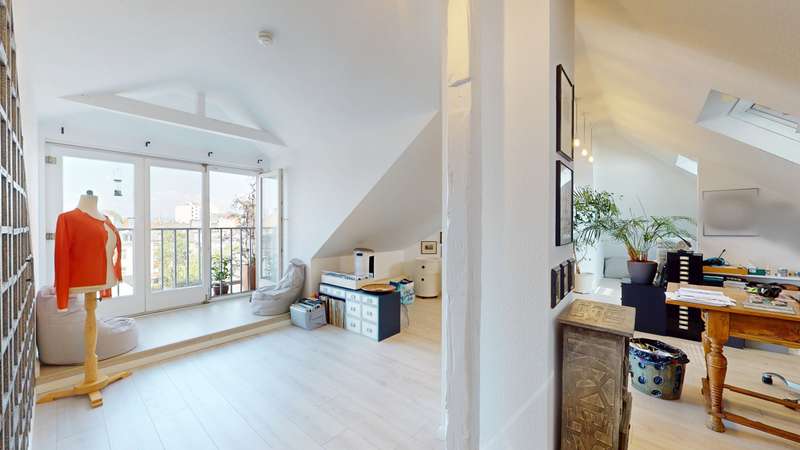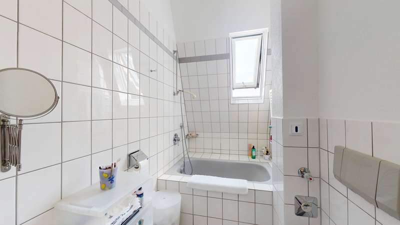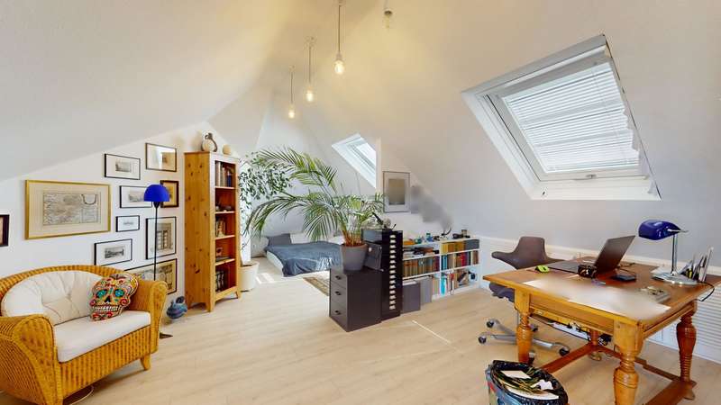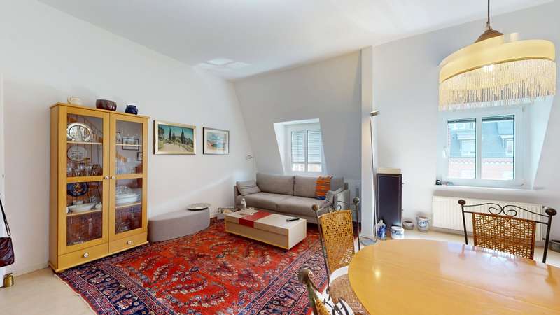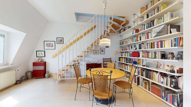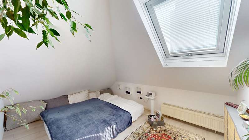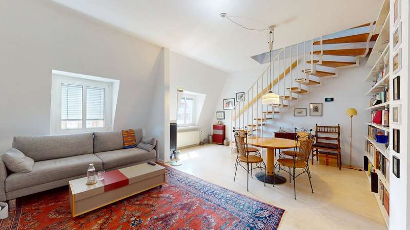 This exceptional maisonette apartment with two and a half rooms is in a prime location in Frankfurt's Nordend, close to the Alleenring and Matthias-Beltz-Platz. The apartment, which was completely renovated in 2020, is on the 4th floor of an old building that was stylishly refurbished in 1990 and has a converted attic studio with skyline views. On the 4th floor there is a large living/dining/sleeping area, a daylight bathroom with bathtub and a cozy kitchen with kitchenette, which is equipped with modern electrical appliances. A spacious staircase leads to the open-plan studio with a lounge area and floor-to-ceiling windows leading to a French balcony. From there you have a wonderful view of the Frankfurt skyline. The apartment has various built-in units. It is ideal for couples and discerning singles looking for a city apartment in a quiet, upmarket neighborhood with excellent infrastructure.