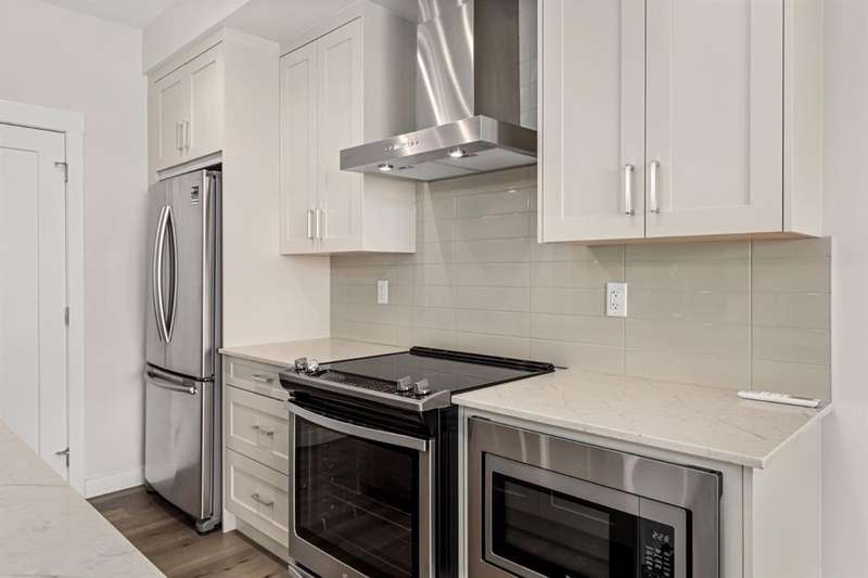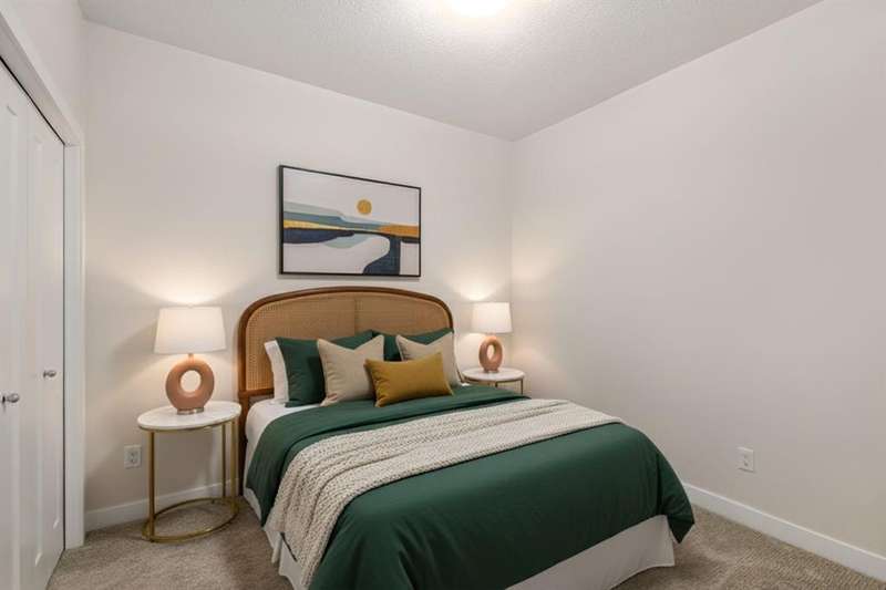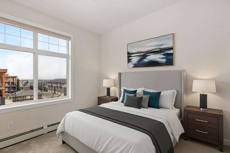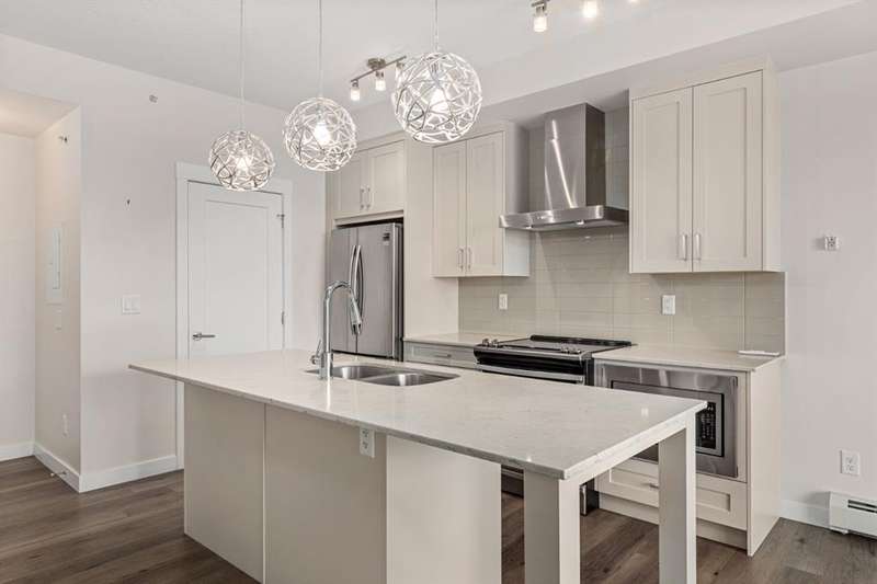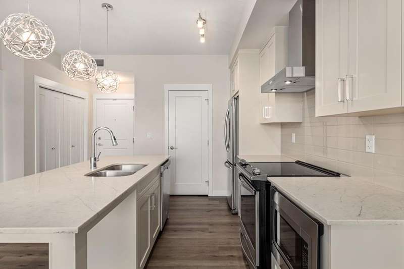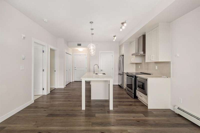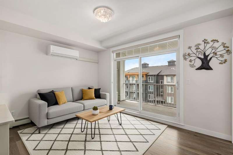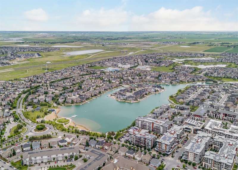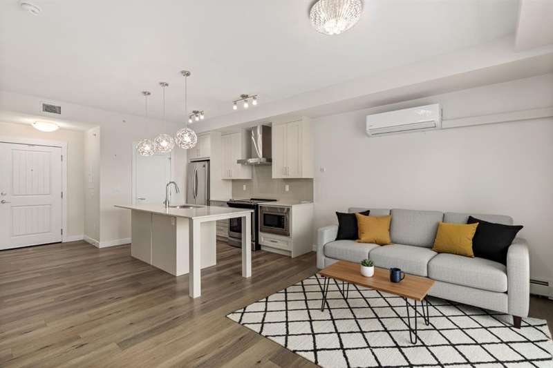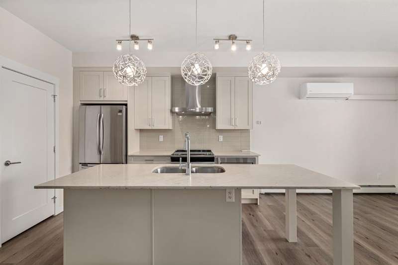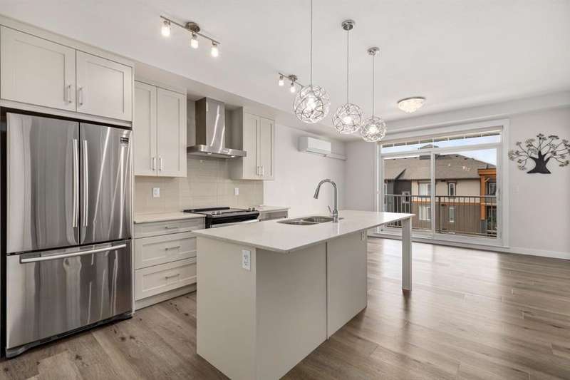 Experience luxury living in a fully upgraded almost 700 square foot top-floor unit in the prestigious lake community of Auburn Bay. Step into this bright, beautifully designed 2 bed 2 bath condo that embodies high quality and functional living with thoughtful design, soaring ceilings, and an open-concept layout. Boasting a modern chef’s kitchen with sleek quartz countertops, custom tile backsplash, stainless steel appliances including a chimney style hood fan, and a spacious island that doubles as your dining table, prep station, or home office hub. Step outside and onto the convenient covered West-facing balcony, with peaceful mountain views and a BBQ gas hookup—perfect for sipping coffee or evening relaxation.The primary suite includes double room closet and a spa-inspired ensuite with vanities, and glass shower. For maximum privacy, the other bedroom can be found on the opposite end of the unit, with an additional ensuite and roomy closet, perfect for guests or roommates. Additional highlights include luxury vinyl plank flooring, A/C, full-size washer/dryer in a dedicated laundry room with pantry, and a titled underground parking stall with attached storage locker. This pet-friendly complex is steps from Auburn Bay Lake, walking trails, schools, CO-OP, restaurants, public transit, and South Health Campus. It is also located mere minutes from the Seton YMCA and quick access to both Deerfoot and Stoney Trail for an easy commute. Whether you're buying your first home or investing, this pristine, well-located condo offers incredible value in a thriving community.