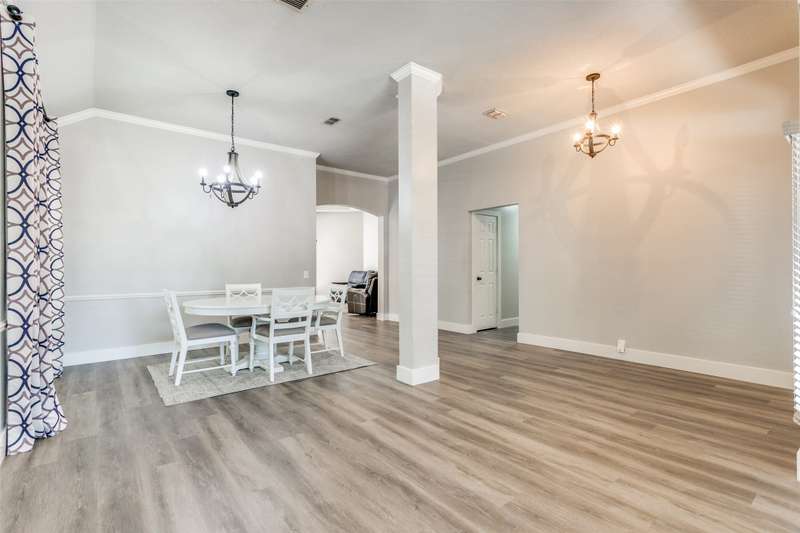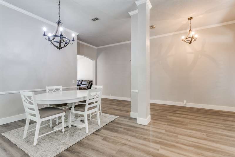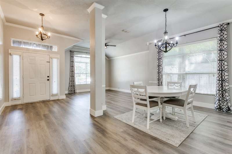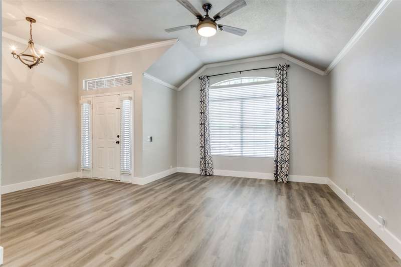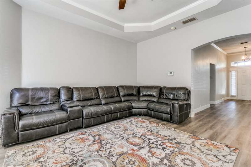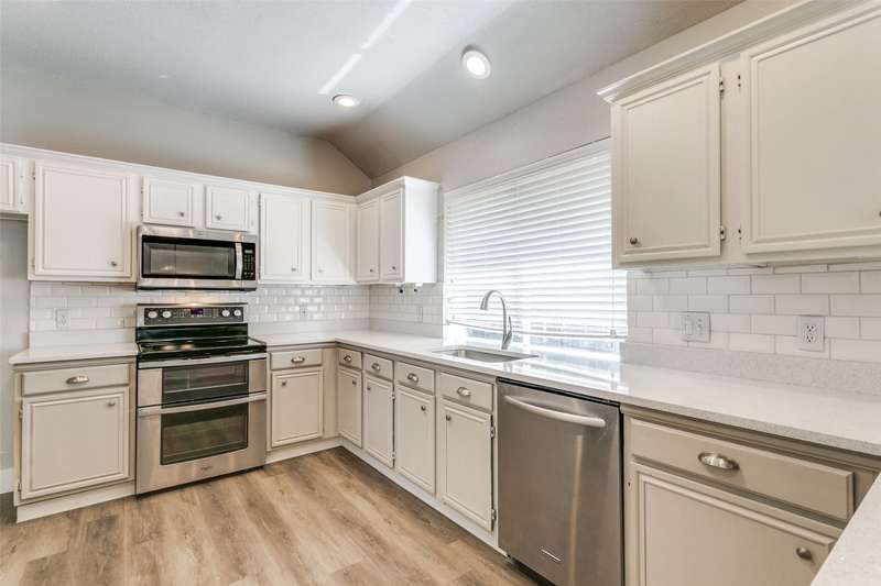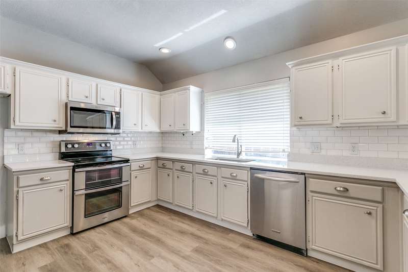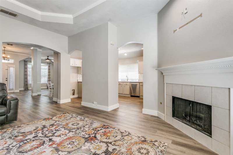WELCOME HOME! You're going to fall in love with this well cared for home that's nestled in a great neighborhood and backs up to a private Greenbelt. This gem is conveniently located close to TWO amazing Parks and close to the highly desirable Green Valley Elementary. From the moment that you walk in, you're greeted with a light and bright open feel with a flexible floorplan. Features include high ceilings, crown molding, chair rail molding in formal dining, tall baseboards throughout, ceiling fans, and 2 inch blinds. Beautiful recent updates and improvements that were completed in the past few years starting in 2018; Professionally painted kitchen cabinets, Quartz countertops added in kitchen, Subway tile backsplash, Interior paint, popcorn ceilings removed throughout except in bedrooms, tile accent wall added in laundry room. 2024 Gas water heater replaced, 2025 Flooring replaced throughout to wood look laminate, All the baseboards, Both bathrooms plus the hallway painted, Primary bath cabinets painted, shower remodeled, added Quartz countertops, primary bath faucets, and the hallway bathroom completely remodeled with quartz countertops, walk in shower, paint, hardware, faucets, mirrors, lighting, plus the Microwave and kitchen disposal!! Wood Fascia was professionally replaced on the back of house and chimney, and all of exterior was painted May 30th, 2025. Other quality and desirable features include stainless steel appliances, double oven, both gas and electric stub in laundry room, large walk-in primary closet, double sinks, garden tub, and so much more! Spacious rooms, and the 4th bedroom would make a perfect study, nursey, or multipurpose flex space. Set up your entertaining retreat or play area on the Huge 39X20 back patio! A must see home!