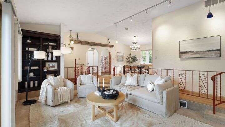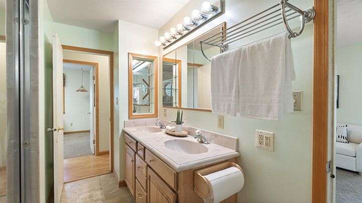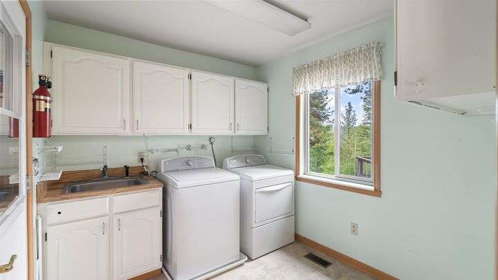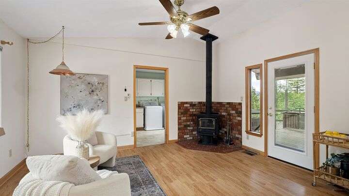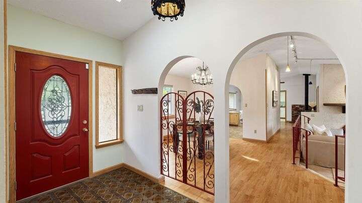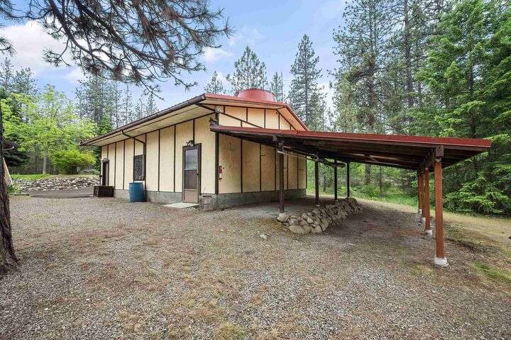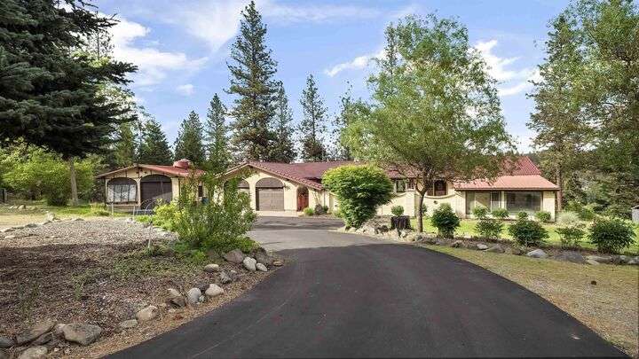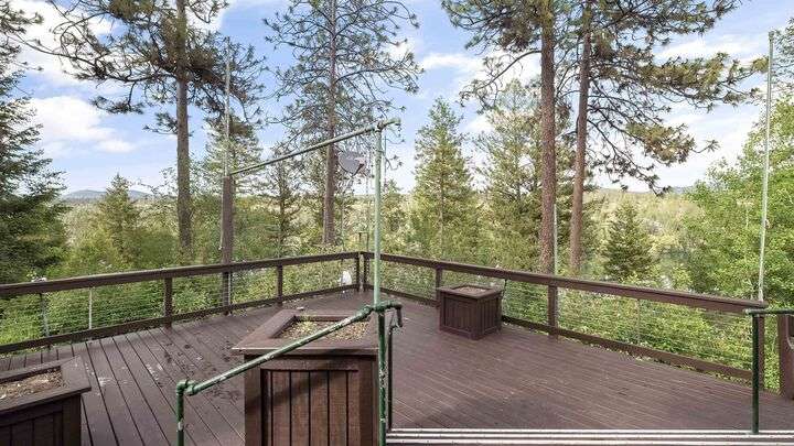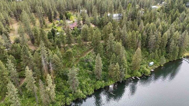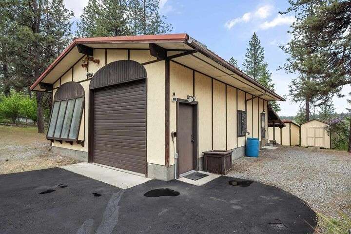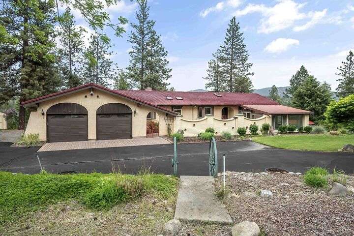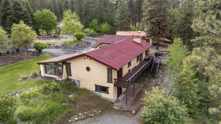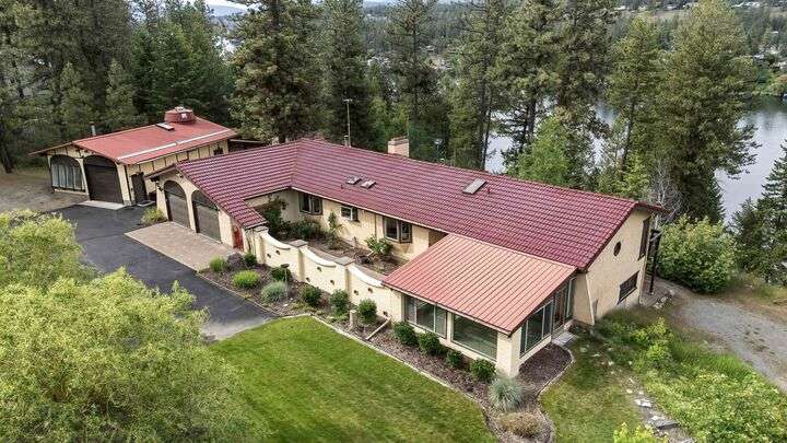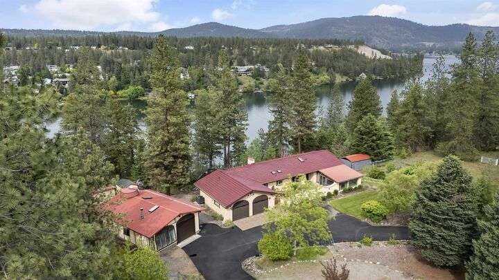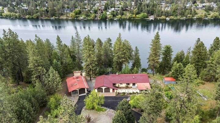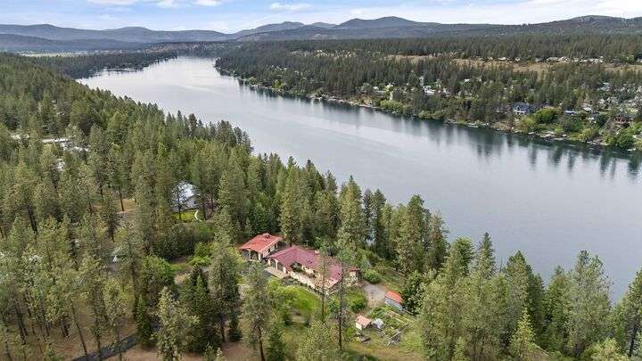 Nestled on 5 private acres of Primary Lake Spokane waterfront, this one-owner, custom-built chalet-style home offers a rare opportunity to enjoy peaceful lakefront living. Designed with main floor living in mind, the home welcomes you with panoramic lake views from the home and expansive deck. The main level features a large primary bedroom with direct access to the deck and a shared en-suite bath, a second bedroom or office, and a convenient laundry/mudroom. The daylight walkout basement is complete with a generous family room, an additional bedroom, full bath, and a mechanical/storage room. Outside, an oversized attached two-car garage is complemented by a finished and insulated 24x36 shop. A gated, paved entrance and circular driveway add to the appeal. Take the path down to the water to enjoy lake activities on the private dock. With a strong producing well, a garden and orchard this lakefront retreat is the perfect blend of serenity, functionality, and natural beauty. Only 15 min to town!