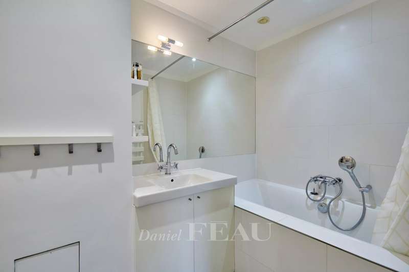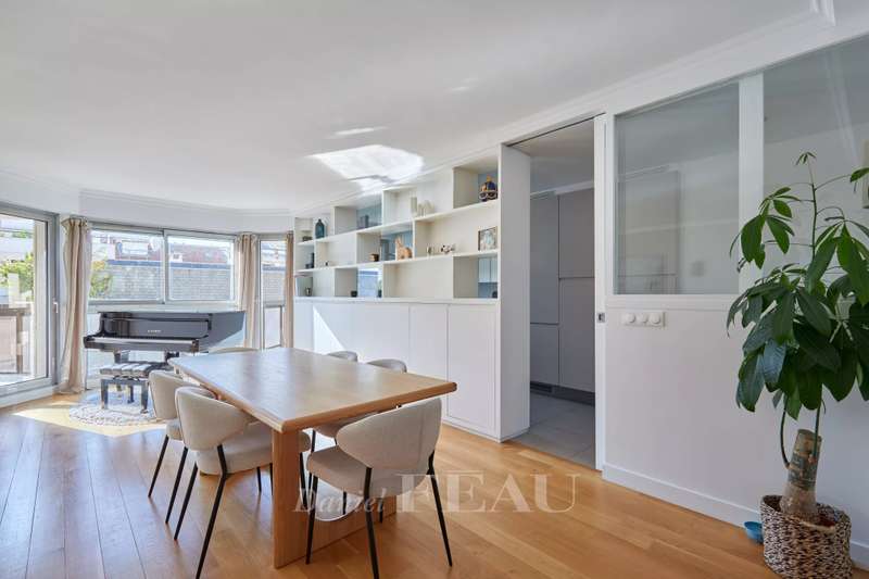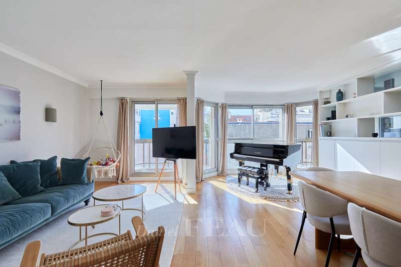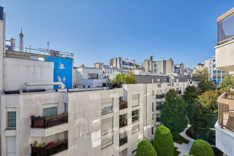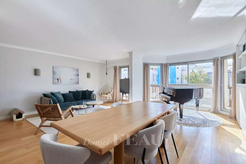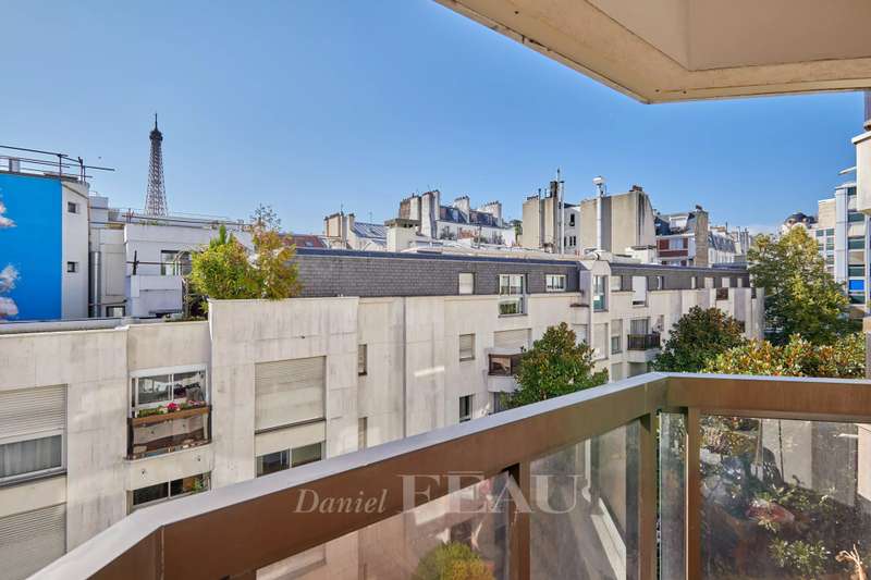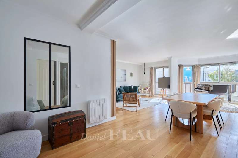 Saint Dominique/Gros Caillou neighbourhood. This apartment in very good condition is on the 4th floor of a peaceful relatively recent residence. Offering about 146 sqm of floor space and 137.57 sqm of living space as defined by the Carrez Law, it includes a living/reception room, a dining room, a kitchen opening onto west-facing balconies commanding a view of the Eiffel Tower, a master bedroom with a bathroom opening onto a fully south-facing terrace, two further bedrooms, a bathroom, a utility room and two wc. With a parking space and two cellars.