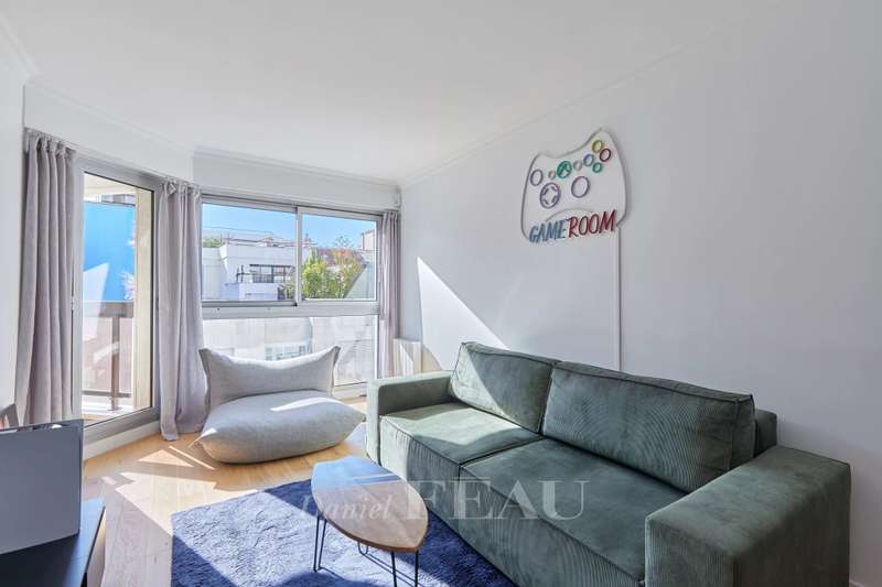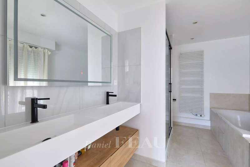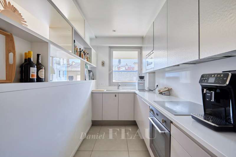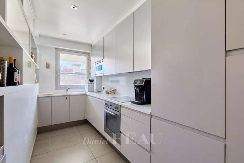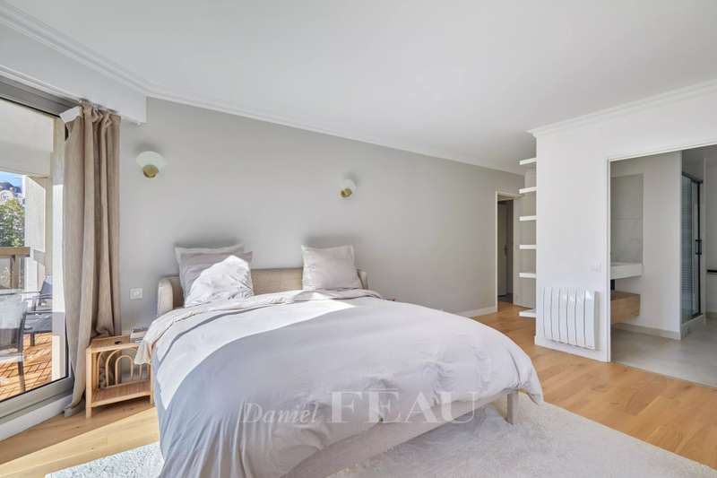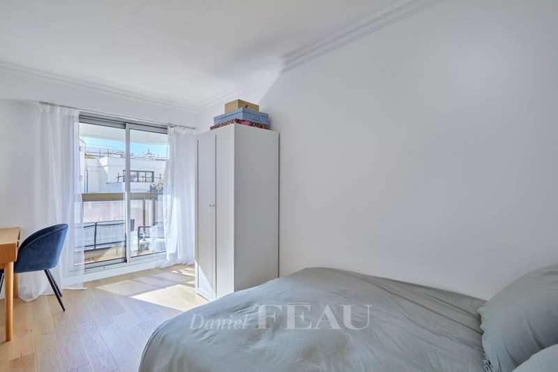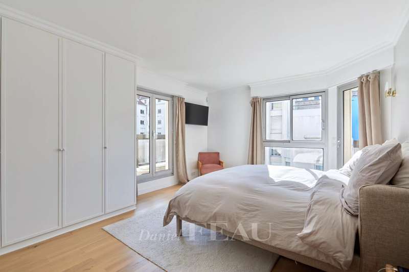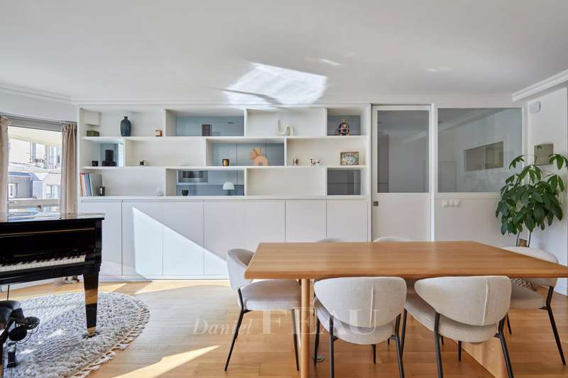Saint Dominique/Gros Caillou neighbourhood. This apartment in very good condition is on the 4th floor of a peaceful relatively recent residence. Offering about 146 sqm of floor space and 137.57 sqm of living space as defined by the Carrez Law, it includes a living/reception room, a dining room, a kitchen opening onto west-facing balconies commanding a view of the Eiffel Tower, a master bedroom with a bathroom opening onto a fully south-facing terrace, two further bedrooms, a bathroom, a utility room and two wc. With a parking space and two cellars.