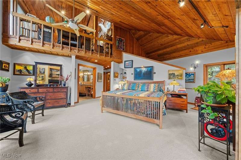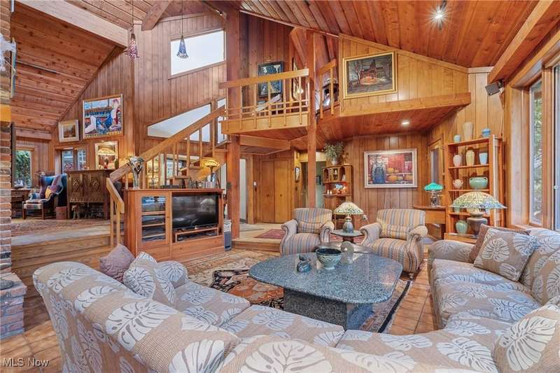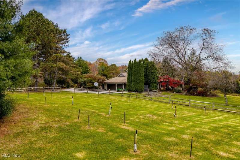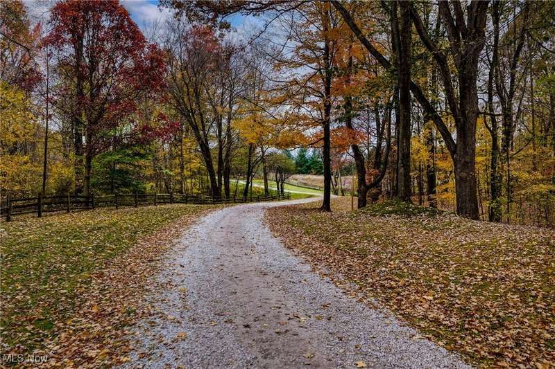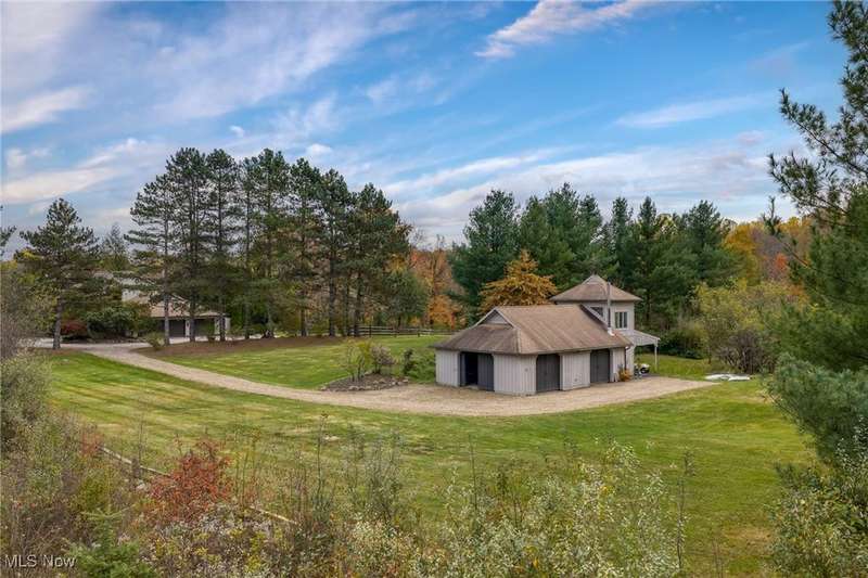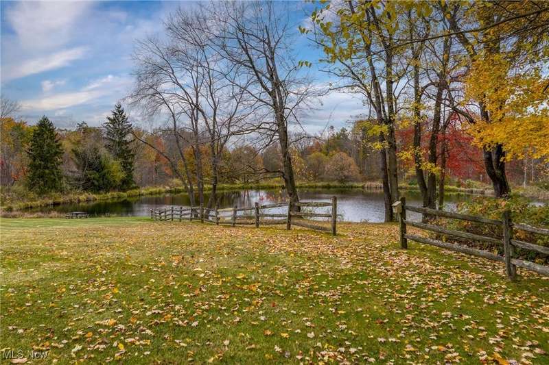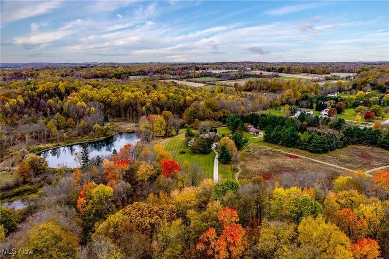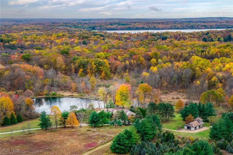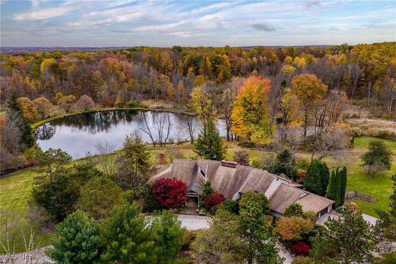 Here is your opportunity to own one of the last large parcels of land in Geauga County. This stunning 60+ acre property is truly breathtaking with the main house overlooking a picturesque pond and stunning meadow. A long private driveway through the woods opens onto a circular motor court and the custom designed home with a unique rustic/modern flair! This one of a kind home has an effortless indoor/outdoor flow with walls of windows overlooking the gorgeous grounds. A two story vaulted great room, chef's kitchen, and a generous dining room, flow seamlessly together and make entertaining effortless. The first floor owner's wing is its own retreat with a private sitting room, intimate bedroom area, expansive bathroom, and walk-in dressing room. For your guests or family, there are two second floor bedrooms in a private wing offering total and complete privacy. You will love admiring the wildlife and breathtaking views from the expansive deck which provides amazing outdoor entertaining space. There is an additional outbuilding on the property which is an amazing space with a second story artist studio. This can also be a fantastic private office or exercise studio. If you're a dog lover, there are three air-conditioned kennels with indoor/outdoor access. This incredible property is perfect for an equestrian or someone who seeks total privacy in one of the most breathtaking settings imaginable.