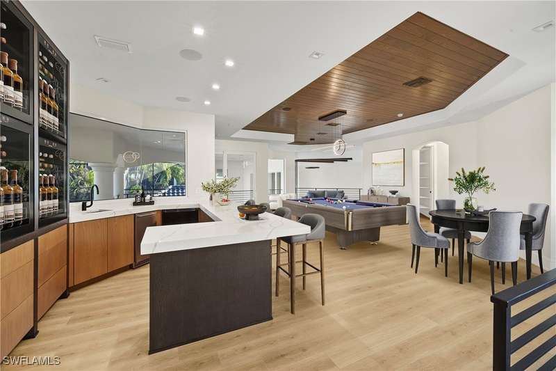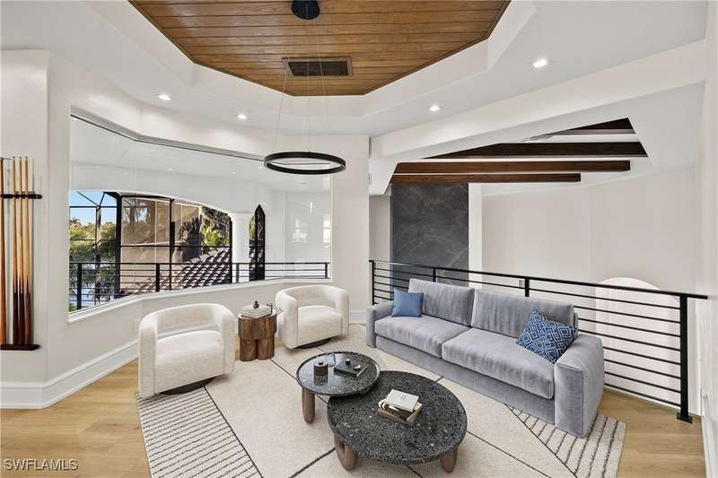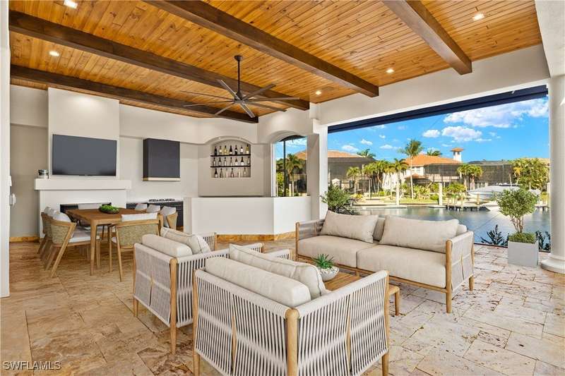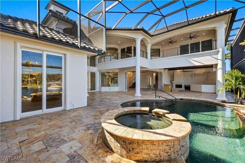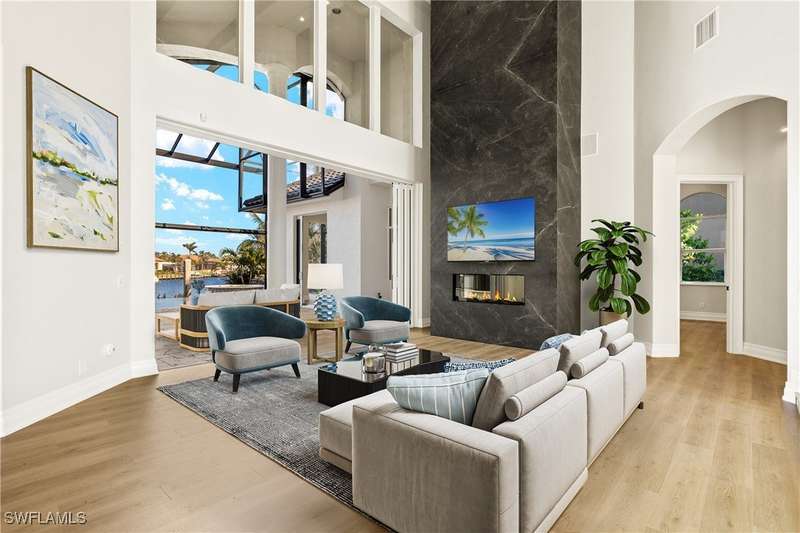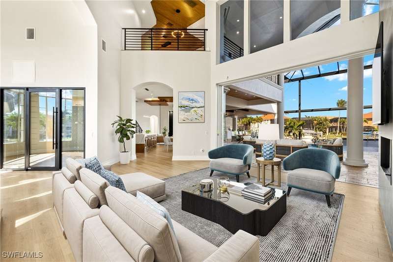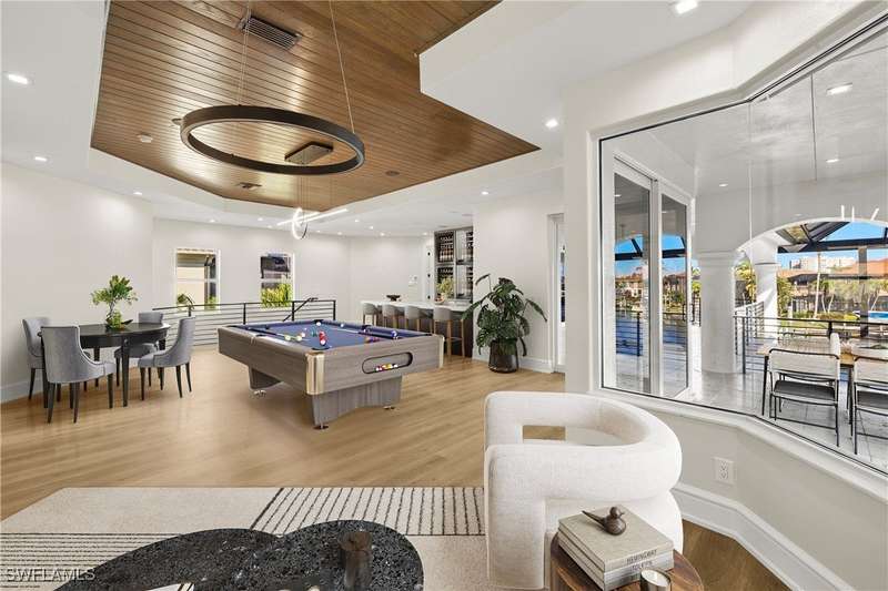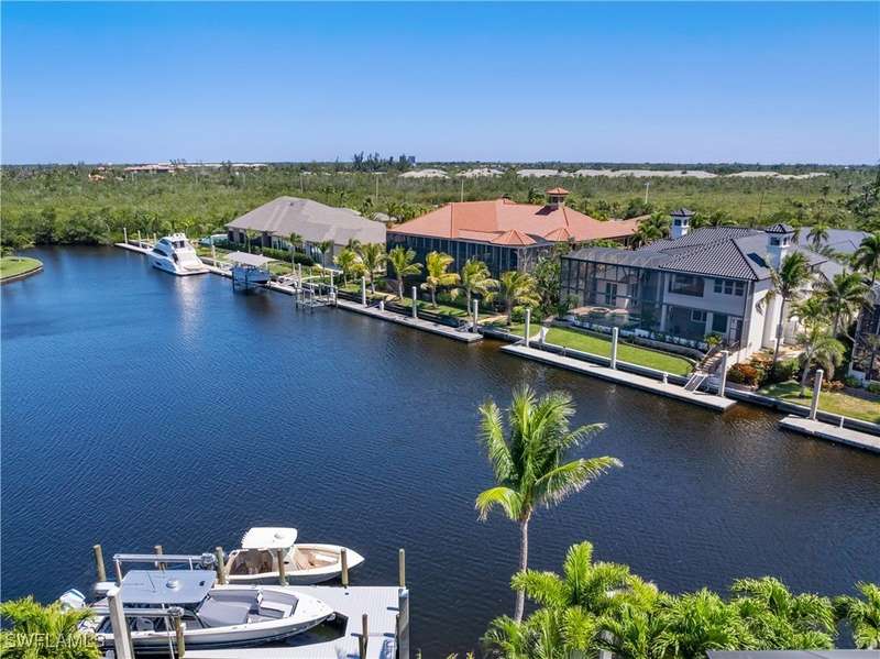 Experience unparalleled waterfront luxury in the prestigious deep-water boating community of Palmetto Point. This exquisite move-in ready residence has been completely reimagined, blending coastal contemporary elegance with upscale finishes and thoughtful design. Inside, an open floor plan with soaring ceilings and expansive windows fills the space with natural light, offering breathtaking views of intersecting canals and stunning western sunsets. The floating ceiling detail adds architectural interest, while light wood tones are beautifully balanced with deeper accents for a sophisticated aesthetic. The gourmet kitchen is a chef's dream, featuring Wolf appliances, sleek countertops, and custom cabinetry. A temperature-controlled wine room provides the perfect space for collectors. Each of the four ensuite bedrooms offers comfort and privacy, while a media/billiards room ensures entertainment for all. Step outside to a resort-style outdoor living space, complete with wood beamed ceilings, built-in BBQ, two spas, and a large pool-all designed for ultimate relaxation. A concrete floating dock accommodates a 95'+ yacht, making this an exceptional retreat for boating enthusiasts. Additional features include a new roof, elevator, A/C workshop, and a three-car garage. This is truly waterfront living at its finest. Don't miss your opportunity to own this extraordinary home in one of SWFL's most coveted boating communities!
