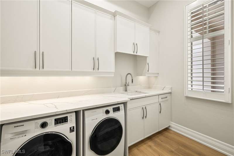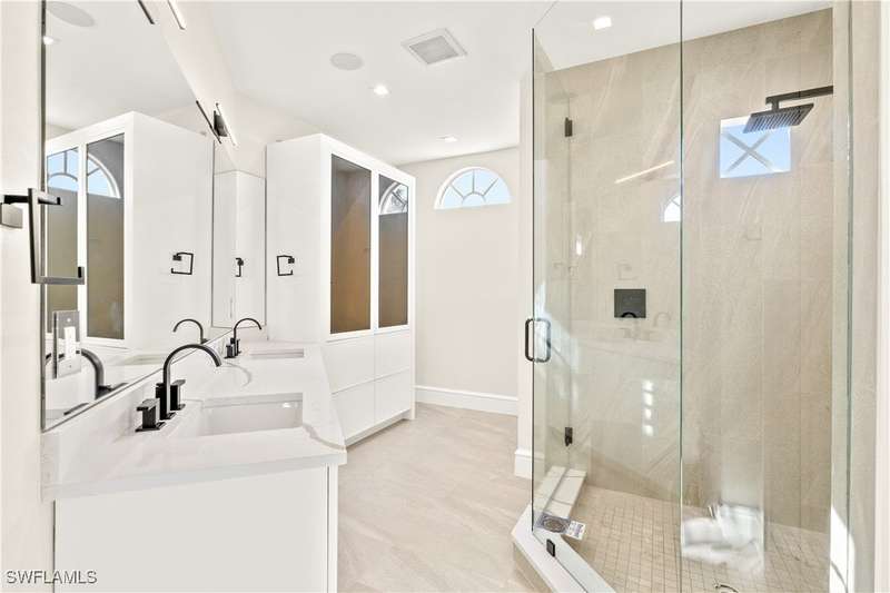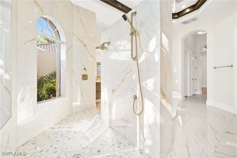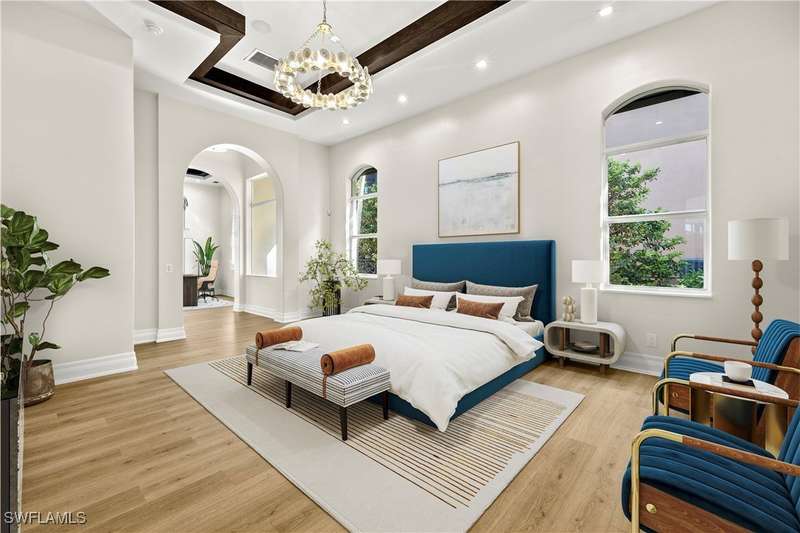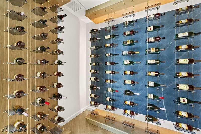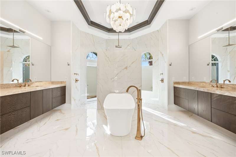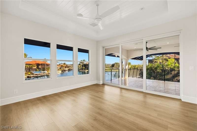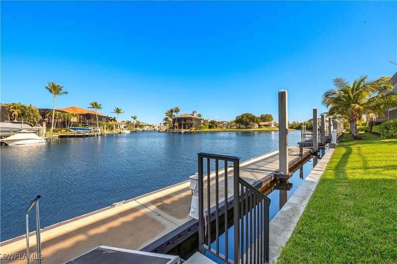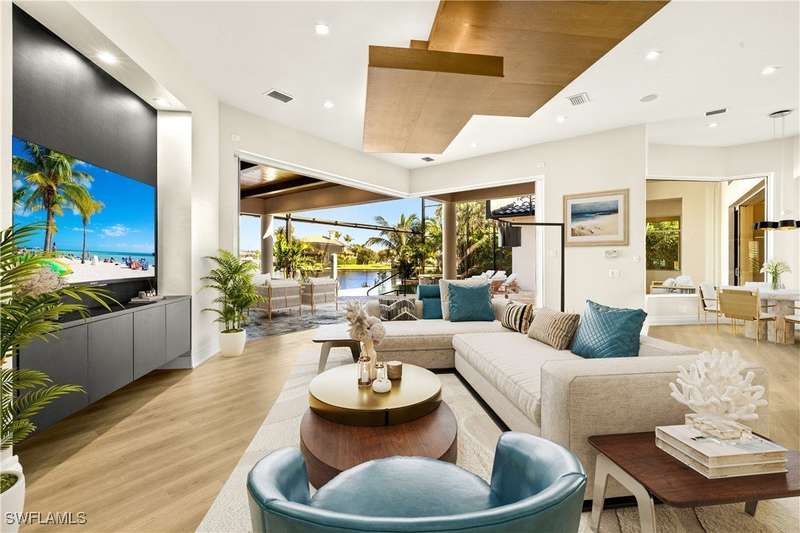 Experience unparalleled waterfront luxury in the prestigious deep-water boating community of Palmetto Point. This exquisite move-in ready residence has been completely reimagined, blending coastal contemporary elegance with upscale finishes and thoughtful design. Inside, an open floor plan with soaring ceilings and expansive windows fills the space with natural light, offering breathtaking views of intersecting canals and stunning western sunsets. The floating ceiling detail adds architectural interest, while light wood tones are beautifully balanced with deeper accents for a sophisticated aesthetic. The gourmet kitchen is a chef's dream, featuring Wolf appliances, sleek countertops, and custom cabinetry. A temperature-controlled wine room provides the perfect space for collectors. Each of the four ensuite bedrooms offers comfort and privacy, while a media/billiards room ensures entertainment for all. Step outside to a resort-style outdoor living space, complete with wood beamed ceilings, built-in BBQ, two spas, and a large pool-all designed for ultimate relaxation. A concrete floating dock accommodates a 95'+ yacht, making this an exceptional retreat for boating enthusiasts. Additional features include a new roof, elevator, A/C workshop, and a three-car garage. This is truly waterfront living at its finest. Don't miss your opportunity to own this extraordinary home in one of SWFL's most coveted boating communities!
