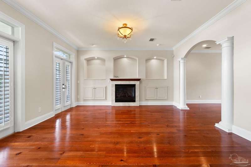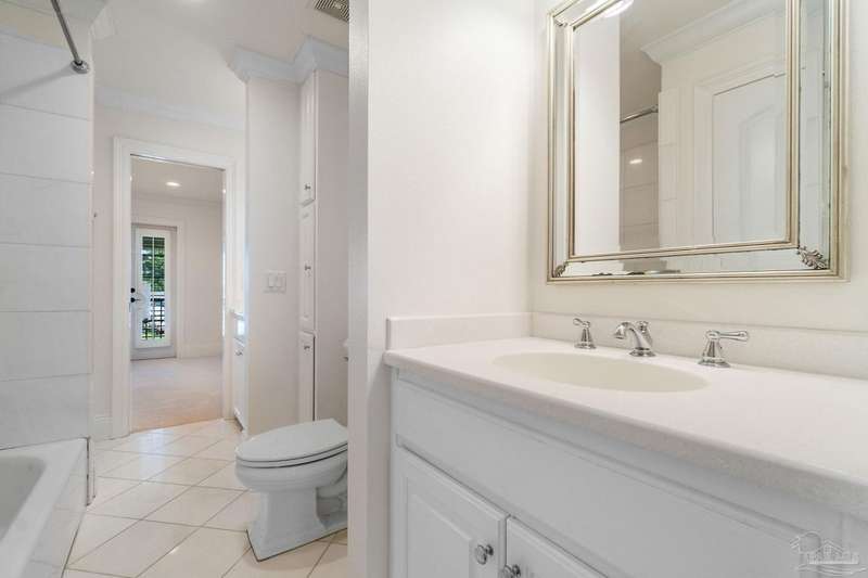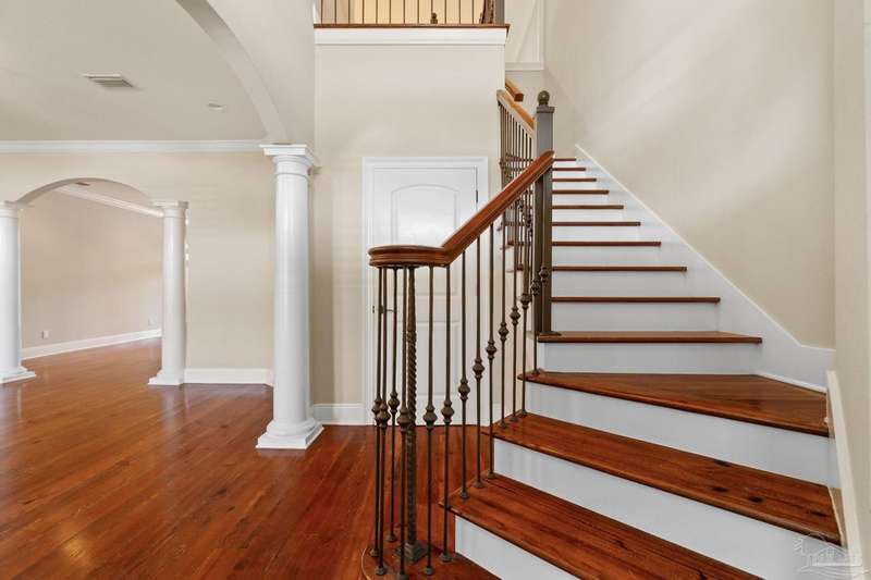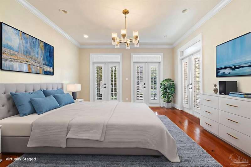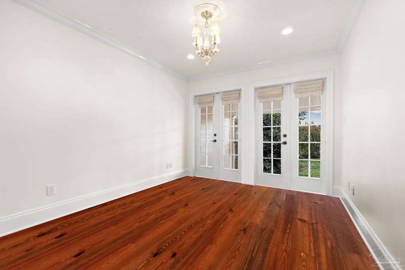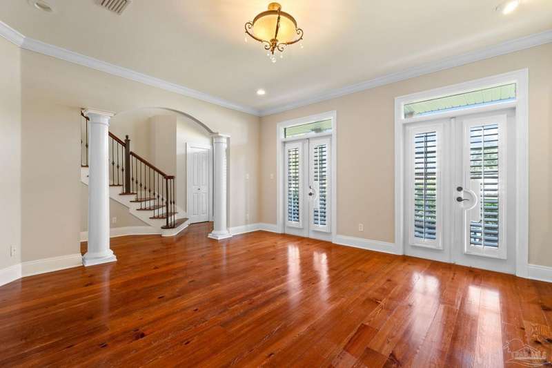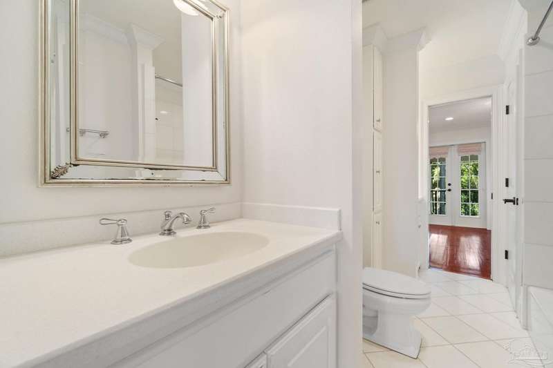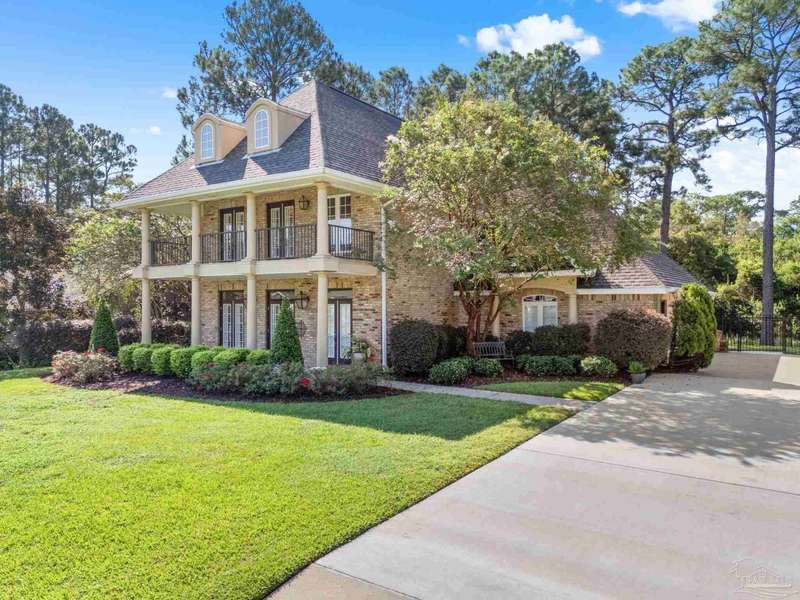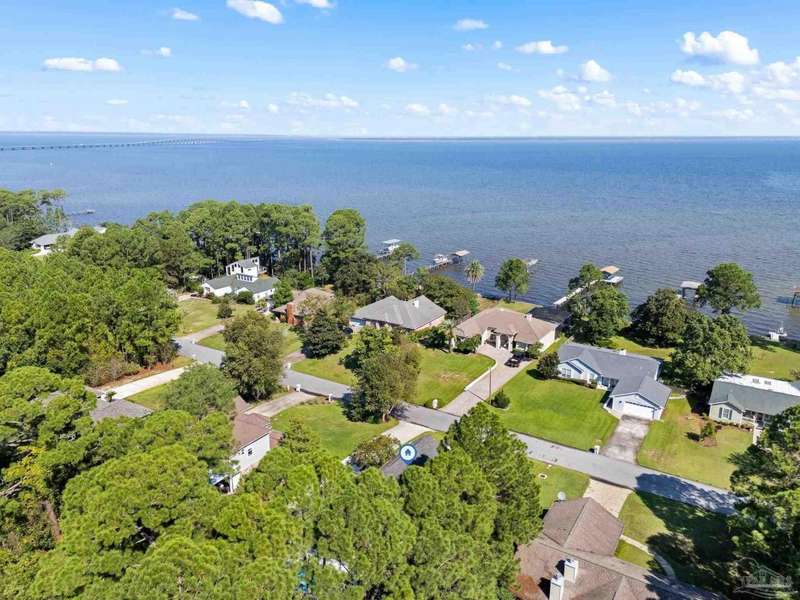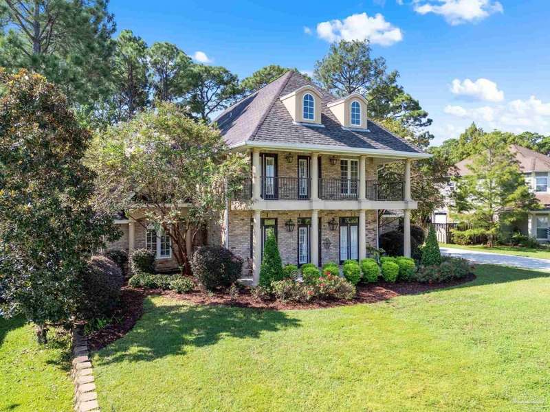 This classic Colonial-style pool home in Paradise Bay combines timeless charm with smart updates-and it comes with Bay views and a brand-new 2024 roof. Set on a quiet street in the Paradise Bay neighborhood, this home is full of character, space, and thoughtful design. From the reclaimed Chicago brick exterior to the private backyard with a Gunite pool, everything here feels welcoming and move-in ready. Inside, wide-plank pine hardwood floors, arched doorways, custom lighting, and architectural details create a warm, inviting atmosphere. The main living areas are bright and open, with large windows that let in tons of natural light. The kitchen is a true showstopper with a 26-foot island, Travertine countertops, cherry shaker cabinets, and high-end KitchenAid Architect Series appliances-including a 48' commercial-grade dual oven with an 8-burner gas cooktop, canopy hood, wine fridge, and more. Whether you're cooking for two or entertaining a crowd, there's plenty of space to work and gather. The main-level primary suite is tucked away for privacy and features a spa-like bathroom with dual vanities, a jetted tub, separate shower with frameless glass, and two walk-in closets. Upstairs, the guest bedrooms share a Jack-and-Jill bath and offer great flexibility for a home office, gym, or space for visitors-plus pool or Bay views from nearly every room. The oversized garage has tons of extra space for storage or a workshop. Located just minutes from top-rated schools, shopping, dining, medical centers, and Pensacola Beach-and only steps from the private community beach park-this one checks all the boxes for comfort, convenience, and coastal living.