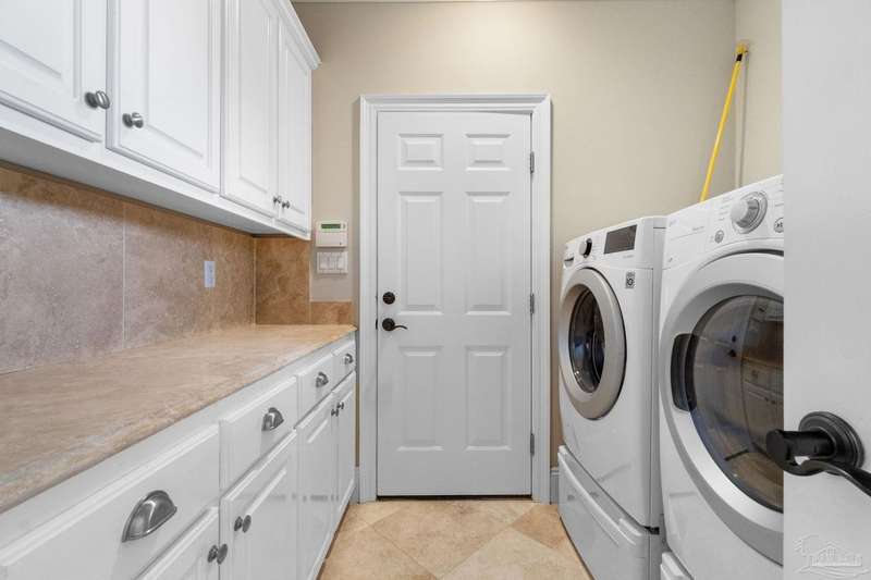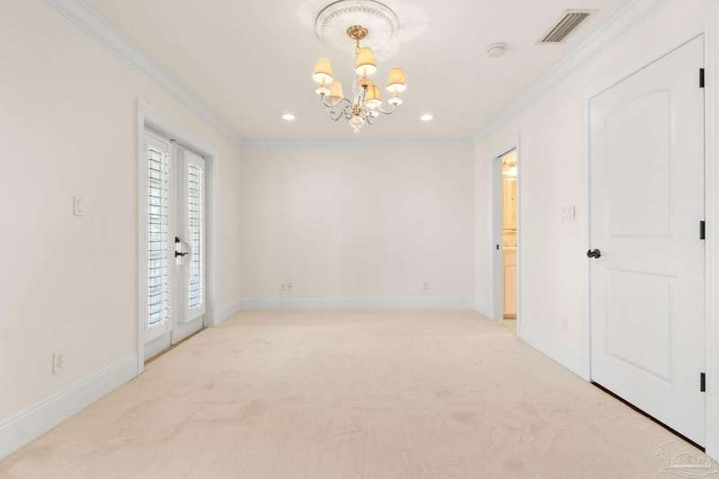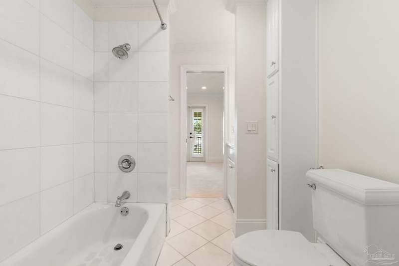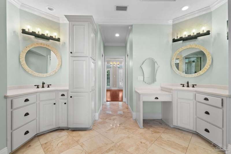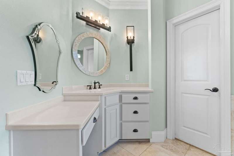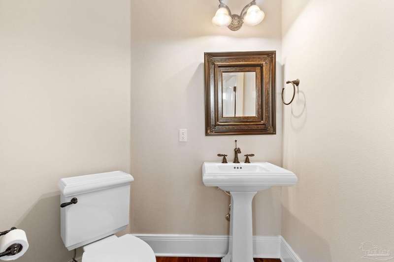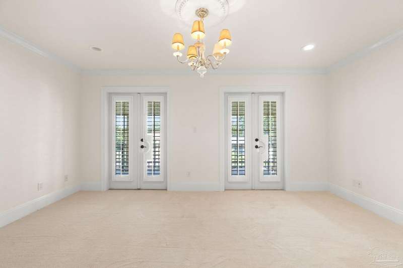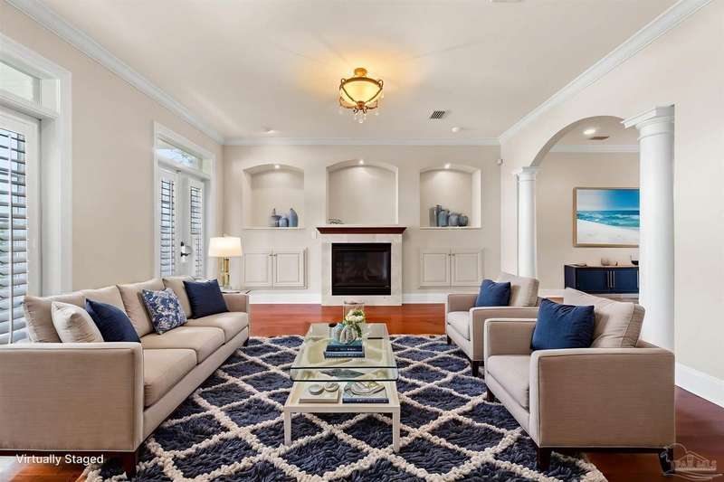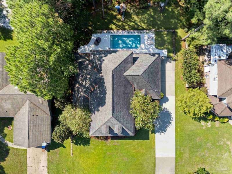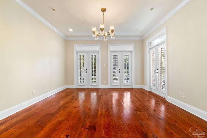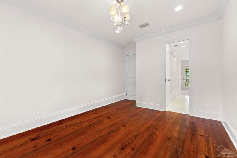 This classic Colonial-style pool home in Paradise Bay combines timeless charm with smart updates-and it comes with Bay views and a brand-new 2024 roof. Set on a quiet street in the Paradise Bay neighborhood, this home is full of character, space, and thoughtful design. From the reclaimed Chicago brick exterior to the private backyard with a Gunite pool, everything here feels welcoming and move-in ready. Inside, wide-plank pine hardwood floors, arched doorways, custom lighting, and architectural details create a warm, inviting atmosphere. The main living areas are bright and open, with large windows that let in tons of natural light. The kitchen is a true showstopper with a 26-foot island, Travertine countertops, cherry shaker cabinets, and high-end KitchenAid Architect Series appliances-including a 48' commercial-grade dual oven with an 8-burner gas cooktop, canopy hood, wine fridge, and more. Whether you're cooking for two or entertaining a crowd, there's plenty of space to work and gather. The main-level primary suite is tucked away for privacy and features a spa-like bathroom with dual vanities, a jetted tub, separate shower with frameless glass, and two walk-in closets. Upstairs, the guest bedrooms share a Jack-and-Jill bath and offer great flexibility for a home office, gym, or space for visitors-plus pool or Bay views from nearly every room. The oversized garage has tons of extra space for storage or a workshop. Located just minutes from top-rated schools, shopping, dining, medical centers, and Pensacola Beach-and only steps from the private community beach park-this one checks all the boxes for comfort, convenience, and coastal living.