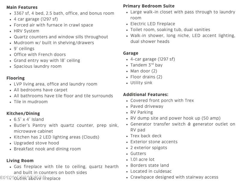 This beautifully crafted 3,367 sq. ft. home offers an exceptional blend of beauty and comfort. Featuring 4 spacious bedrooms, 2.5 bathrooms, a dedicated office, and a large bonus room, this thoughtfully designed layout is perfect for both everyday living and entertaining. Step in the grand entryway with an 18' ceiling, then into the open-concept living area where the gas fireplace is framed by floor-to-ceiling tile, a quartz hearth, and custom built-in lower cabinets with quartz countertops on either side. The kitchen is a chef's dream with quartz countertops, a butler's pantry including a prep sink, and a large kitchen island. Enter the mudroom from the 1297 sq. ft. four-car garage, complete with a man door, utility sink and two floor drains. The luxurious primary suite features a tray ceiling, electric LED fireplace, expansive walk-in closet with direct access to the laundry room, and a spa-like bath with dual vanities, a soaking tub, and a walk-in shower with dual shower heads and LED accent lighting. Additional interior highlights include an HRV system, 9' ceiling throughout, quartz windowsills, and a generously sized laundry room. Outside, enjoy low-maintenance living with a covered Trex front porch, Trex back deck, and RV parking with an RV dump site, 50-amp power, and a generator transfer switch with outlet. Beautiful stone exterior accents, rain gutters, and a serene location at the back of a cul-de-sac with the back property bordering state land. This home is truly one of a kind. Buyer may still have time to select some finishes and/or features. Reach out to the listing licensees for an estimated completion date and construction updates. Total Builder's Package available to all Buyers prior to Closing: - As-Built Survey - DEC Septic Documentation - One Year Builder's Warranty - PUR 101 (Energy Rating) - PUR 102 (Summary of Building Inspections) - Notice of Completion Recorded