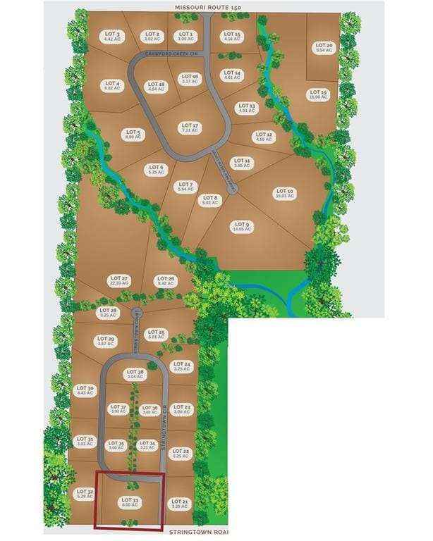 Welcome to Crawford Creek Estates. Jackson Counties NEWEST Premier Rural Acreage Community. Crawford Creek Estates Consists of 236 acres featuring 38 Private Estate sized acreage lots with hardwired broadband internet and 360-degree breathtaking views. These 38 lots range in size starting at 3 acres and vary all the way up to 22 acres and provide the unique opportunity for you to BUY NOW and BUILD LATER. Crawford Creek Estates highlights a variable topography which allows for flat, daylight, and walkout foundations. Running through the middle of this scenic 236 acres includes Crawford Creek itself which showcases its natural beauty with an abundance of wildlife, mature timber, and the comforting soundscape of rural Jackson County. Each one of our lots entail many features to attract a plethora of buyers. This scenic community is included in the Lees Summit School district, and is just a short drive to shopping, schools, and other modern-day conveniences. We look forward to assisting you with calling Crawford Creek Estates Home.