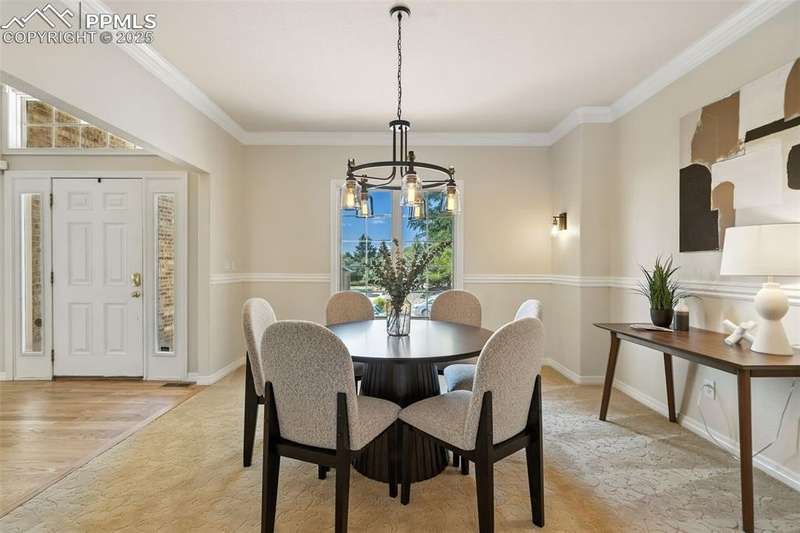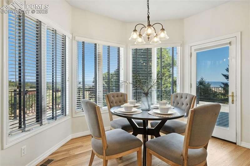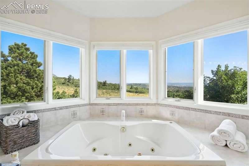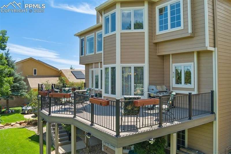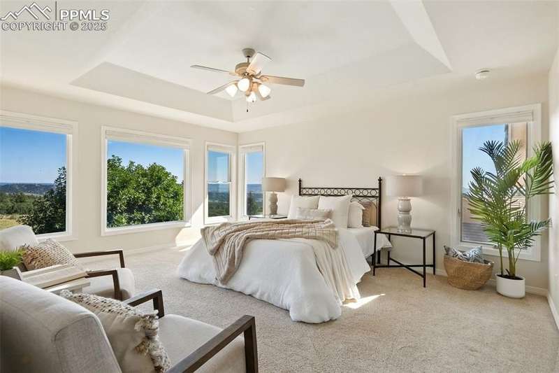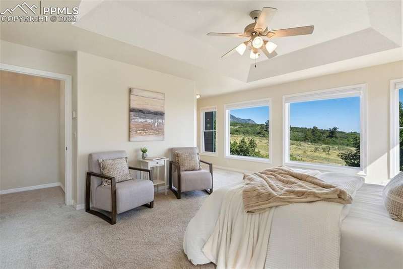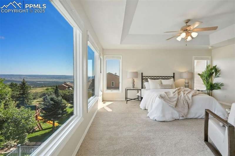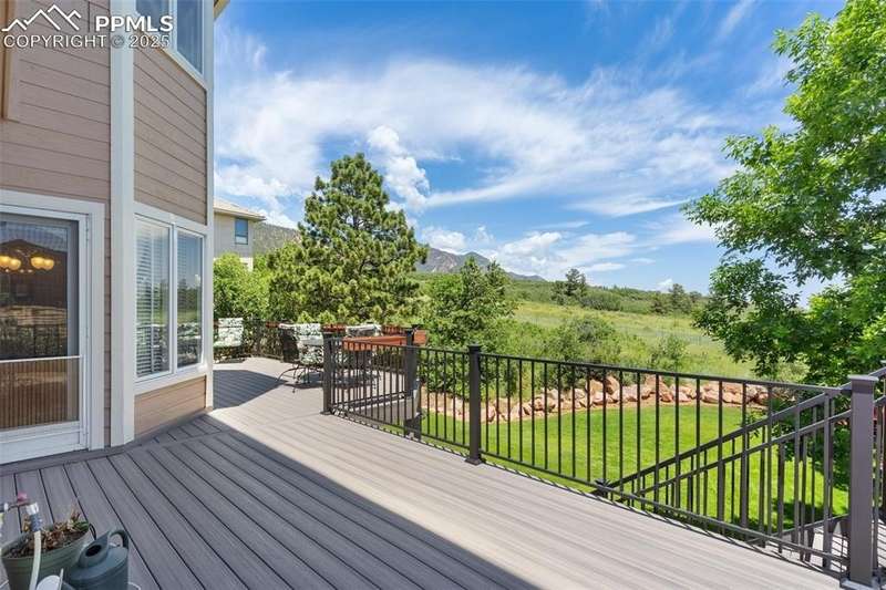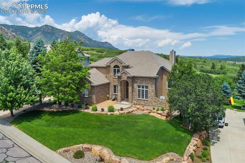 Your Dream Home Awaits! Nestled in the highly sought-after Peregrine neighborhood in NW Colorado Springs, this extraordinary 6-bedroom, 5-bath residence redefines luxury living with its sweeping mountain and city views. Spanning 4,507 square feet, the home perfectly balances elegance and functionality in one of Academy District 20’s most desirable communities. Freshly painted throughout, this home welcomes you with soaring ceilings, hardwood floors, and a dramatic staircase. The spacious dining and living rooms set the tone for gatherings, while the sun-filled family room (don’t miss the sizable hidden storage!) impresses with oversized windows, a cozy gas fireplace, and captivating views of the city, mountains and Air Force Academy. The kitchen is a true entertainer’s delight, offering stone countertops, sleek cabinetry, and an island designed for conversation and function. The floor plan shines with thoughtful touches, including a private office just off the staircase and expansive windows framing views in every direction. Upstairs, the primary suite is a retreat with breathtaking panoramas, a spa-like 5-piece en suite, and walk-in closet. A junior primary with updated bath, two additional bedrooms with a shared Jack & Jill bath, plus tasteful updates throughout elevate the home. The walk-out basement offers two more bedrooms, a full bath, and a large recreation room ready for movie nights, workouts, or hosting guests. Outside, a newer 40x20 composite deck provides the perfect vantage point for enjoying both mountain views and city lights. The lot is a rare find, backing to the AFA for maximum privacy while offering usable yard space for play, gardening, or relaxation. Additional features include updated light fixtures, central AC, security system, and oversized 3-car garage with storage. With neighborhood parks, ASD20 schools, and a prime Peregrine location, this home is more than a place to live—it’s a lifestyle. Don’t miss the chance to make it yours!