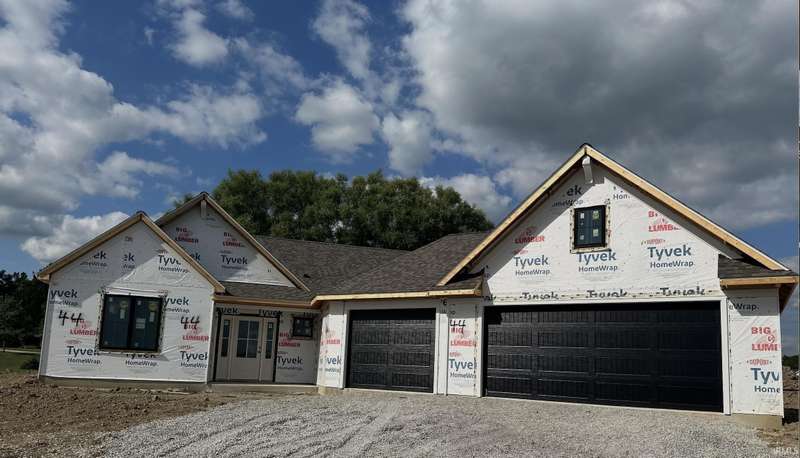 Stunning New Construction in Orchard Hills. Introducing an exquisite single-story home by Bob Buescher Homes, set to be completed in early January 2026. Nestled on a serene cul-de-sac at lot #44, this residence is thoughtfully designed to maximize views and provide an inviting atmosphere. Spanning 2,052 square feet, this open concept, split-bedroom floor plan features three spacious bedrooms, 2.5 bathrooms, and a dedicated office/den, making it ideal for both relaxation and productivity. As you enter, you're greeted by a foyer leading to a private office with a striking cathedral ceiling. The heart of the home is the expansive great room, boasting a 12-foot vaulted ceiling anchored by a beautiful gas fireplace, perfect for cozy gatherings. The seamless flow from the great room to the dining area and kitchen enhances the spacious feel. The kitchen is a chef’s dream, featuring an impressive 8x3 island with a sink, double wastebasket, and dishwasher, complemented by custom maple cabinetry in a light true brown stain and Viatera Velo quartz countertops. An oversized pantry offers ample storage space for all your culinary needs. Retreat to the generously sized primary suite, where luxury meets comfort. The primary bathroom is a true oasis, equipped with a double vanity featuring cultured marble tops, a linen cabinet, and a custom tiled walk-in shower with zero-entry access. Enjoy the convenience of a private water room and an oversized walk-in closet. Bedrooms two and three are located on the opposite side of the home, ensuring privacy and comfort for family or guests. A well-appointed laundry room is conveniently located off the garage, along with a half bath for guests. The home’s thoughtful design includes no wasted space, enhancing functionality throughout. Additional highlights include luxury vinyl plank flooring in the foyer, great room, dining area, kitchen, laundry, and main hall, with plush carpeting in all bedrooms and the office. The exterior is equally impressive, showcasing a weather wood roof, bone-colored shakes and siding, complemented by white gutters and stylish black clad and black garage doors. The stunning Southern Limestone stonework from Prestige adds a touch of elegance and sophistication to the facade. With a spacious 897 square foot oversized three-car garage and an inviting rear covered porch, this home offers both space and style for modern living. Don’t miss the opportunity to make this stunning new construction your forever home!