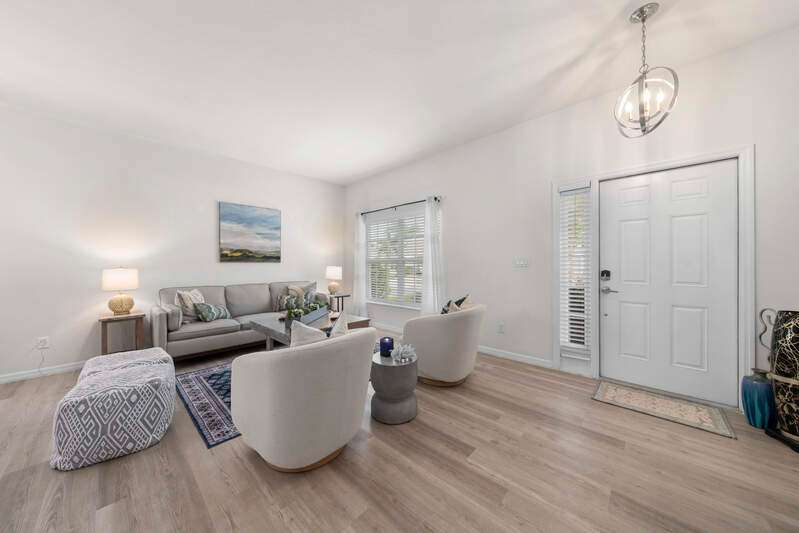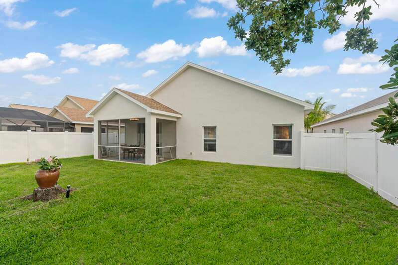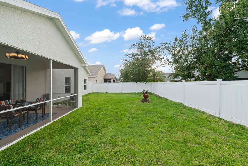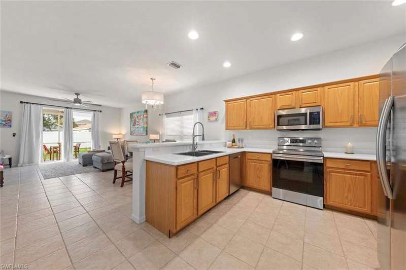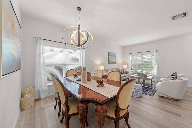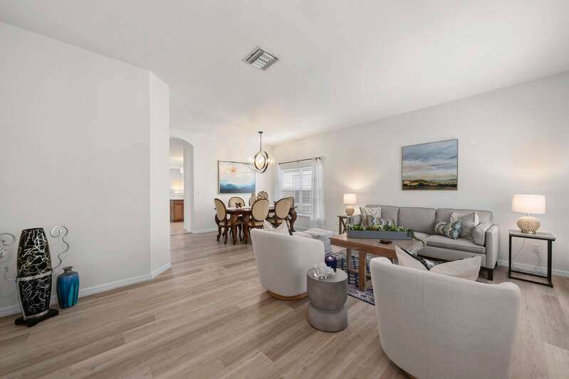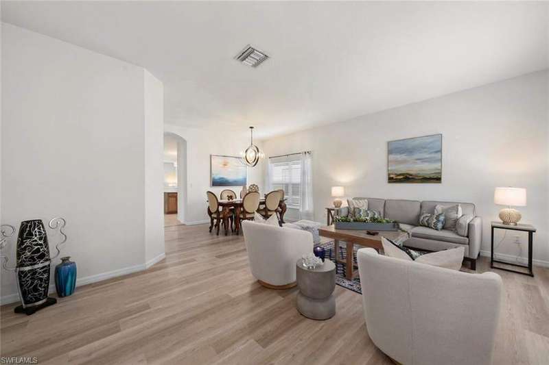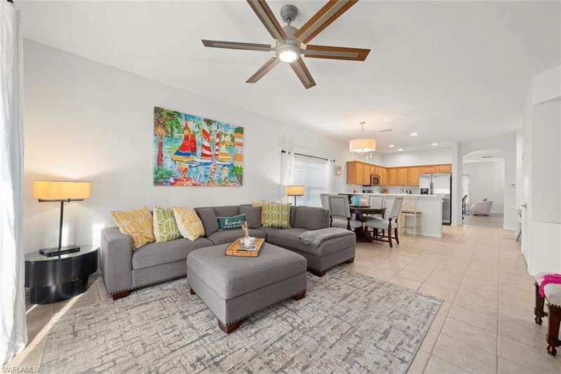 Every Home Has a Story - Welcome to 9795 Gladiolus Bulb Loop, where thoughtful design meets everyday ease. Lovingly maintained and nearly 2,000 square feet, this home is perfectly positioned in Gladiolus Preserve's quiet southwest enclave. Located on the neighborhood's interior loop, its unique placement on the non-sidewalk side provides the rare bonus of an extended driveway-both practical and appealing. Step through the door and into a freshly painted 2025 interior that feels bright, inviting, and ready for your personal touch. The open-concept living and dining area is accented by bespoke lighting and luxury vinyl plank flooring throughout, creating a polished and modern flow. The kitchen-complete with solid-surface countertops, wood cabinetry, stainless steel appliances, and a breakfast nook-blends style and function. Just beyond, the spacious great room offers a comfortable retreat, perfect for gatherings or quiet evenings at home. A neutral palette sets the stage for your own decor, accented here and there by vibrant works of Florida's celebrated artist Leoma Lovegrove. The thoughtful floor plan includes a primary suite with an adjoining flex room, easily adapted into a fourth bedroom, office, wellness studio, nursery, or sitting area. Outside, you'll find a fully fenced yard and a two-car garage, adding both practicality and peace of mind. Gladiolus Preserve carries a unique history-once flower fields, now a gated community of 240 single-family homes surrounding a tranquil freshwater lake. Residents enjoy a clubhouse, resort-style pool, fitness center, playground, and cabana, all while being minutes from beaches, dining, and shopping. Here, the balance of vibrancy and tranquility sets the stage for your next chapter.