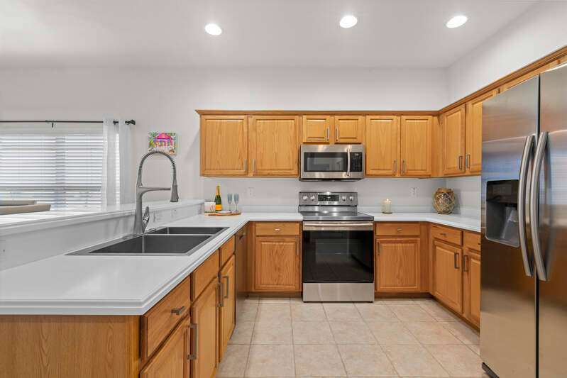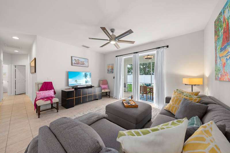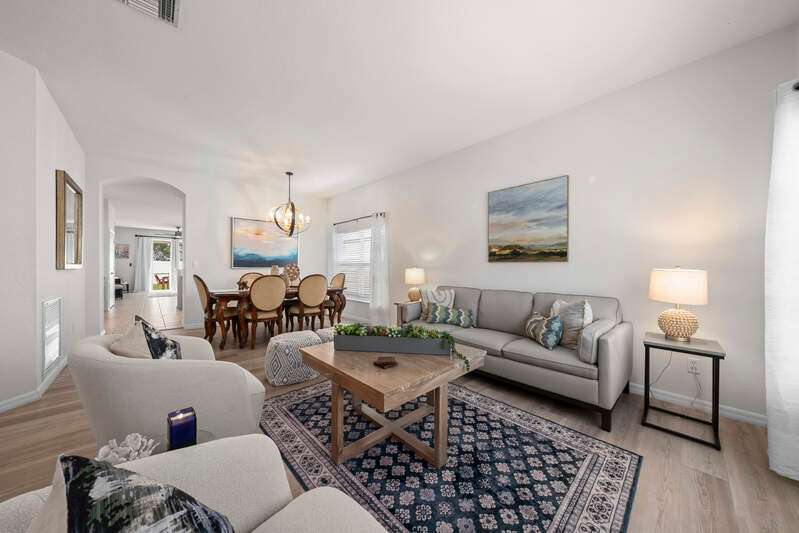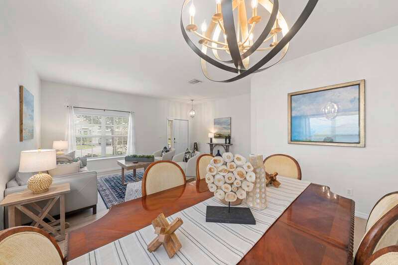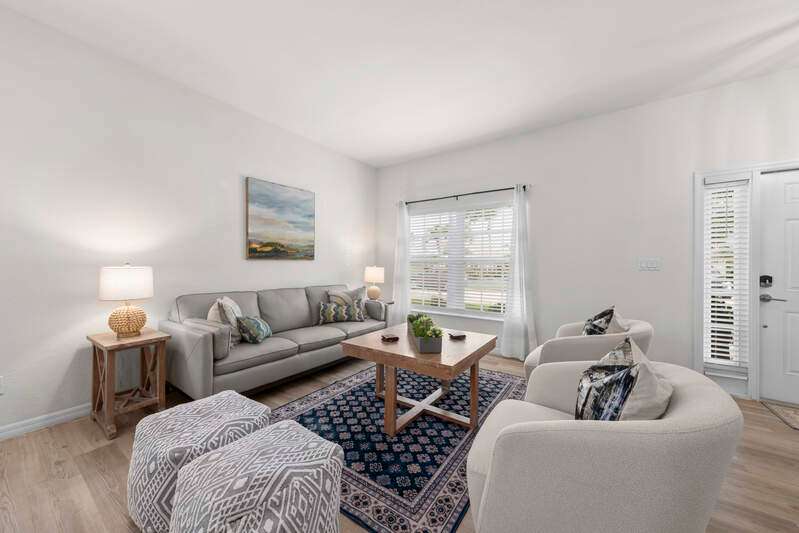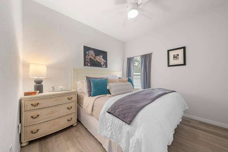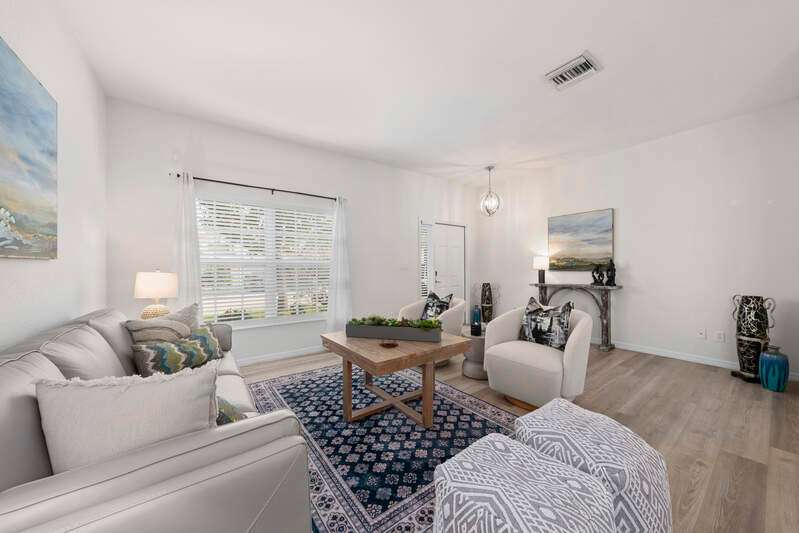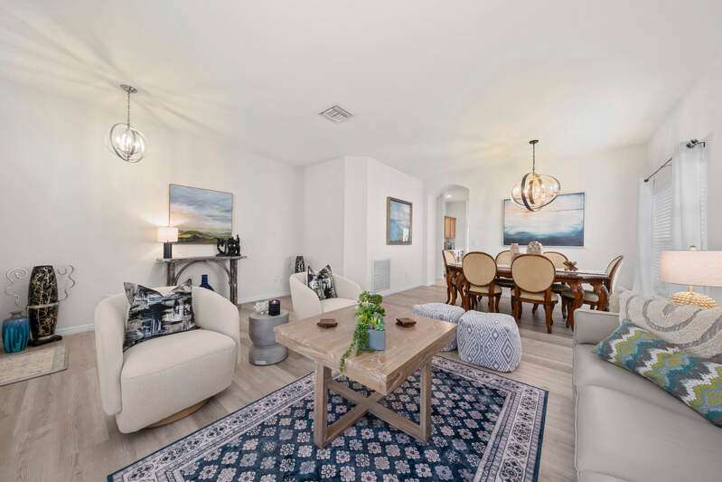Every Home Has a Story - Welcome to 9795 Gladiolus Bulb Loop, where thoughtful design meets everyday ease. Lovingly maintained and nearly 2,000 square feet, this home is perfectly positioned in Gladiolus Preserve's quiet southwest enclave. Located on the neighborhood's interior loop, its unique placement on the non-sidewalk side provides the rare bonus of an extended driveway-both practical and appealing. Step through the door and into a freshly painted 2025 interior that feels bright, inviting, and ready for your personal touch. The open-concept living and dining area is accented by bespoke lighting and luxury vinyl plank flooring throughout, creating a polished and modern flow. The kitchen-complete with solid-surface countertops, wood cabinetry, stainless steel appliances, and a breakfast nook-blends style and function. Just beyond, the spacious great room offers a comfortable retreat, perfect for gatherings or quiet evenings at home. A neutral palette sets the stage for your own decor, accented here and there by vibrant works of Florida's celebrated artist Leoma Lovegrove. The thoughtful floor plan includes a primary suite with an adjoining flex room, easily adapted into a fourth bedroom, office, wellness studio, nursery, or sitting area. Outside, you'll find a fully fenced yard and a two-car garage, adding both practicality and peace of mind. Gladiolus Preserve carries a unique history-once flower fields, now a gated community of 240 single-family homes surrounding a tranquil freshwater lake. Residents enjoy a clubhouse, resort-style pool, fitness center, playground, and cabana, all while being minutes from beaches, dining, and shopping. Here, the balance of vibrancy and tranquility sets the stage for your next chapter.