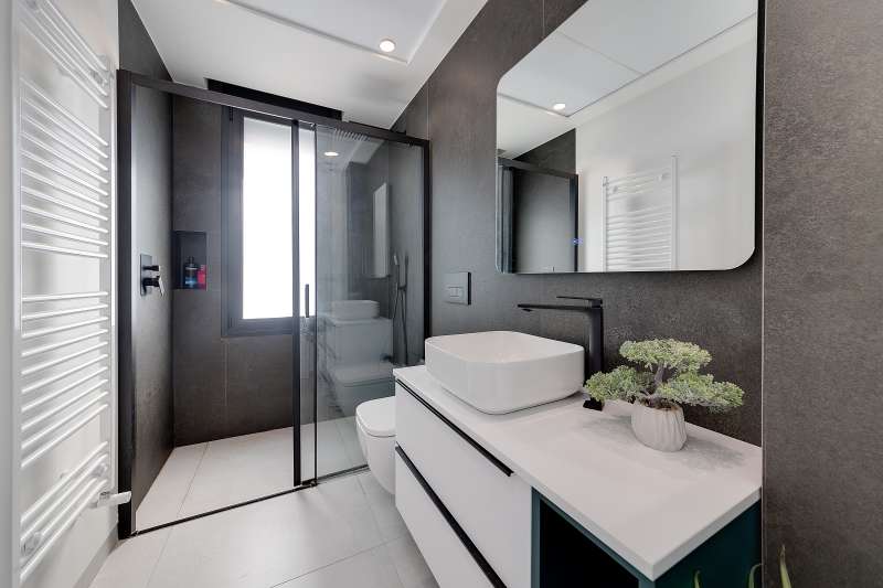 Inside the two-story villas on the ground floor, you have a sizable double bedroom with a fitted wardrobe and an en-suite bathroom with shower, a ground floor toilet room, a spacious open-concept kitchen featuring an island and an adjacent laundry room, a dining area designed with an open layout, and a living space boasting expansive windows that flood the room with natural light. Upstairs you have two large double bedrooms both with fitted wardrobes, a bathroom with a walk-in shower, and a large balcony with great views.