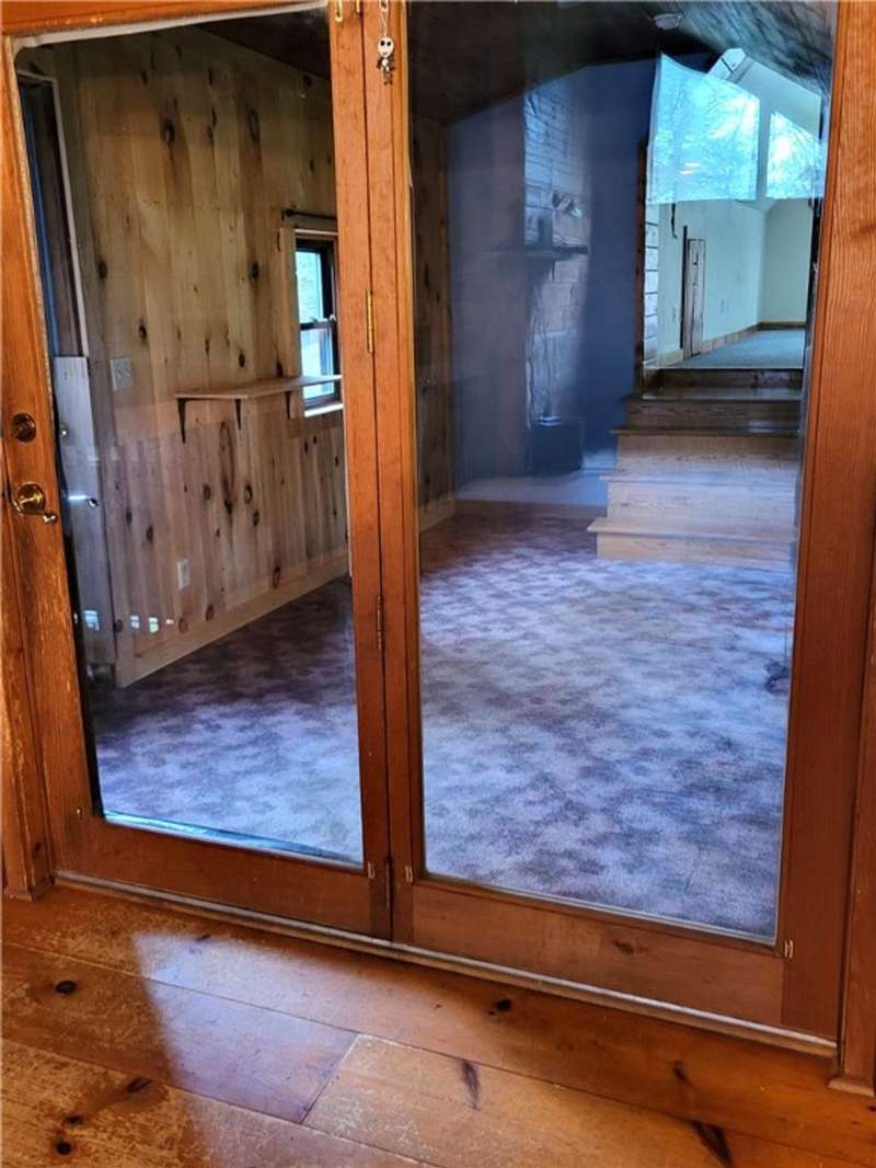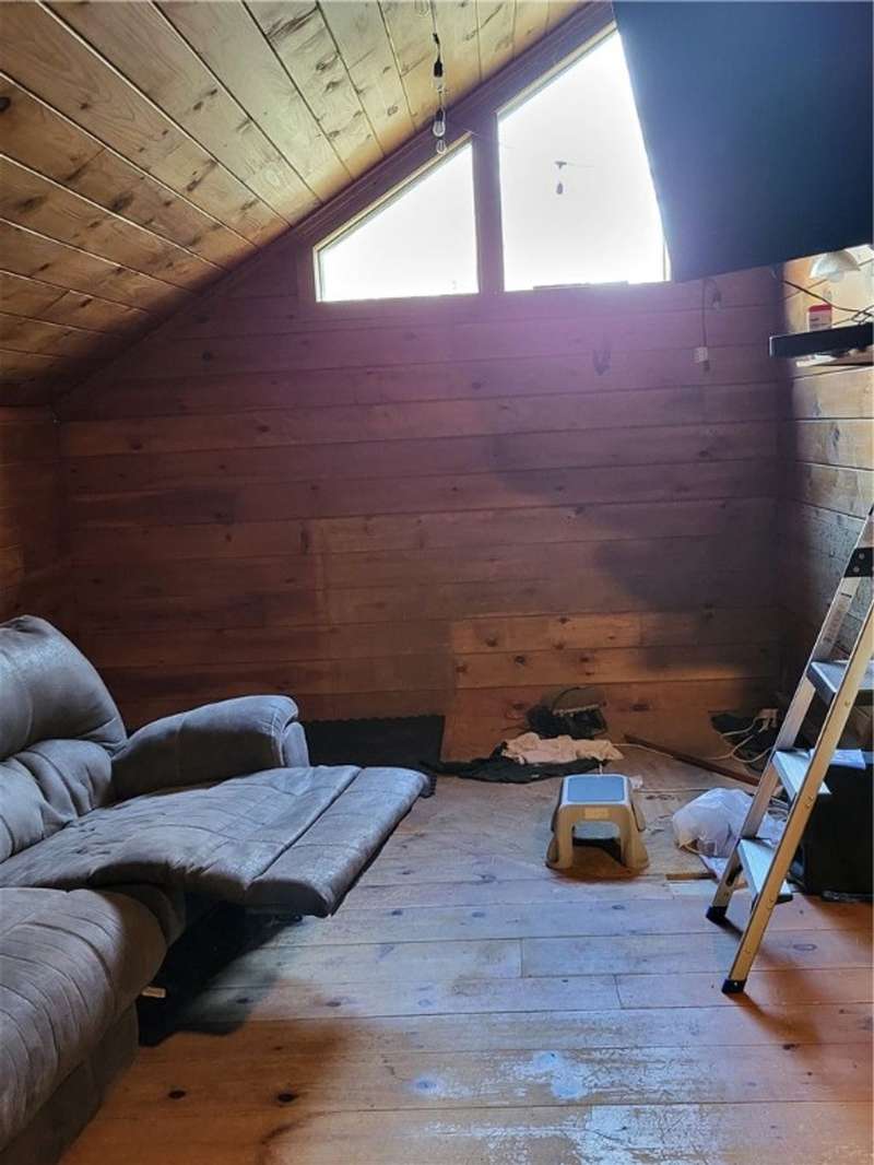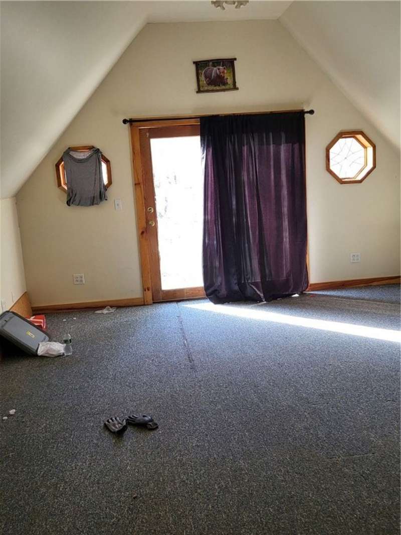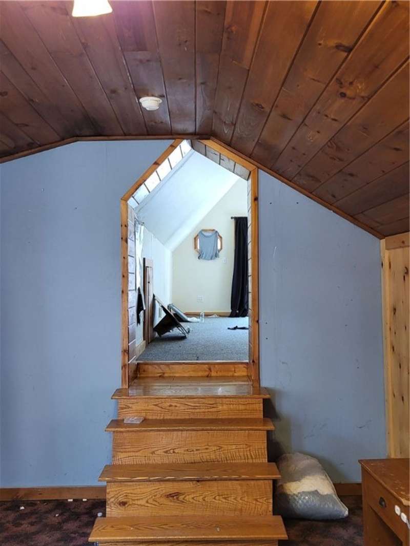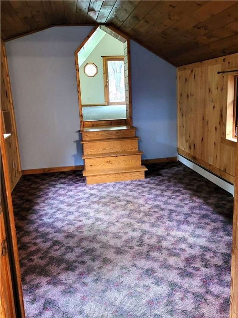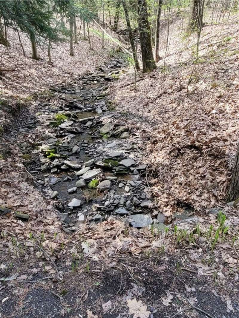 This 3 BR, 2 bath Contemporary is located in a quiet private setting with a small babbling brook running in front of home. The lot is mainly wooded with a nice open back and side yards. As you enter this home you go into a large living room with a stone wall, fireplace with wood burning insert, beamed cathedral ceiling. Overlooking this area is a loft area and on the main level is the kitchen and dining area. The main bath also contains the laundry hook-ups and a walk-in shower. The main floor bedroom is behind the dining area. Stairs to the upper level are in the living room and take you up to the loft. On the left is a doorway to a sitting room with a outdoor balcony (incomplete) and bedroom with sloped ceiling and French doors to a deck (that needs to be built). Straight ahead from the loft is a hallway that leads to the other bedroom, bath with tub, and storage room. There is closed-in storage in most of the walls where sloped ceilings exist.