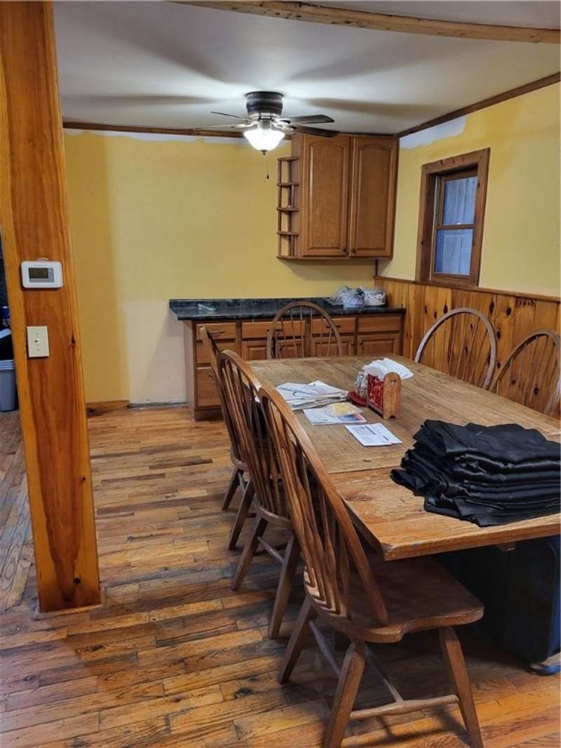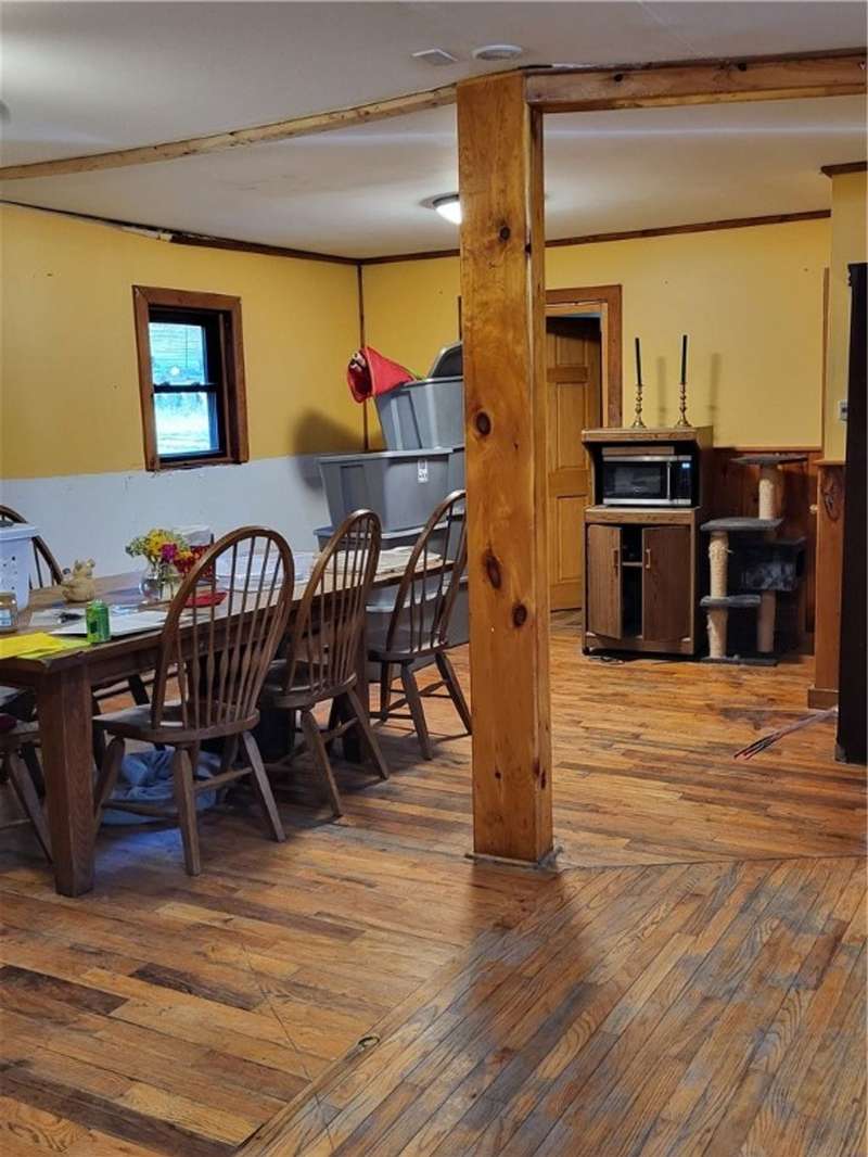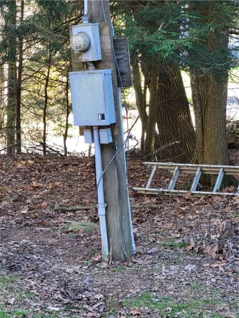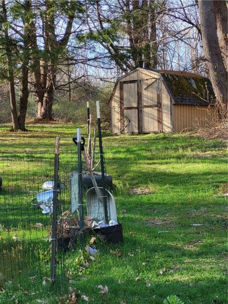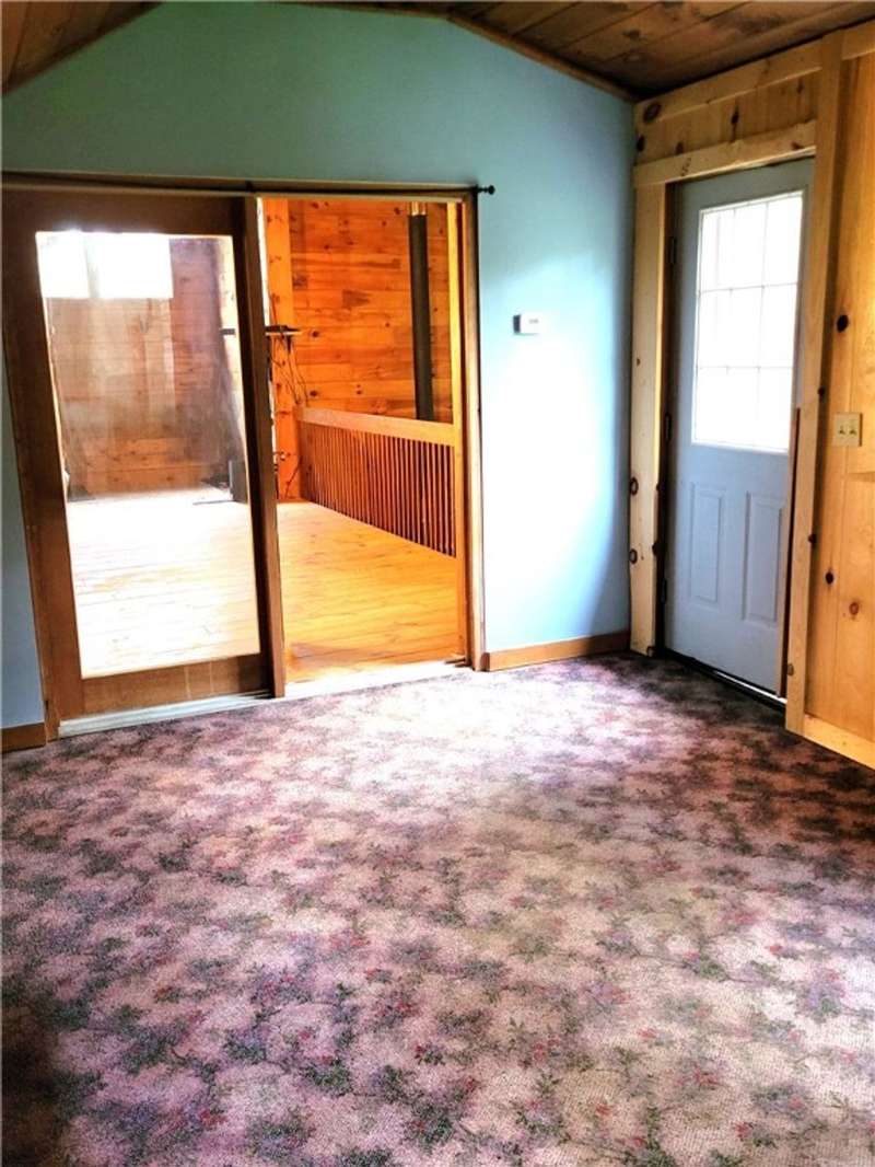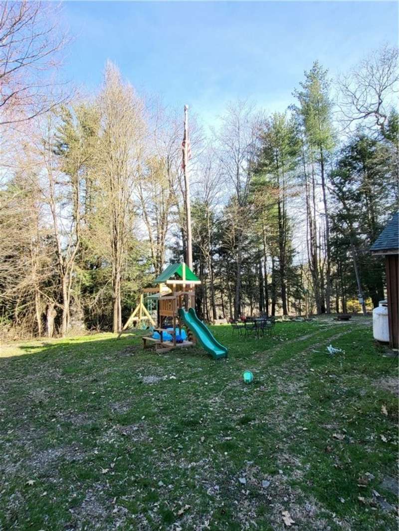 This 3 BR, 2 bath Contemporary is located in a quiet private setting with a small babbling brook running in front of home. The lot is mainly wooded with a nice open back and side yards. As you enter this home you go into a large living room with a stone wall, fireplace with wood burning insert, beamed cathedral ceiling. Overlooking this area is a loft area and on the main level is the kitchen and dining area. The main bath also contains the laundry hook-ups and a walk-in shower. The main floor bedroom is behind the dining area. Stairs to the upper level are in the living room and take you up to the loft. On the left is a doorway to a sitting room with a outdoor balcony (incomplete) and bedroom with sloped ceiling and French doors to a deck (that needs to be built). Straight ahead from the loft is a hallway that leads to the other bedroom, bath with tub, and storage room. There is closed-in storage in most of the walls where sloped ceilings exist.