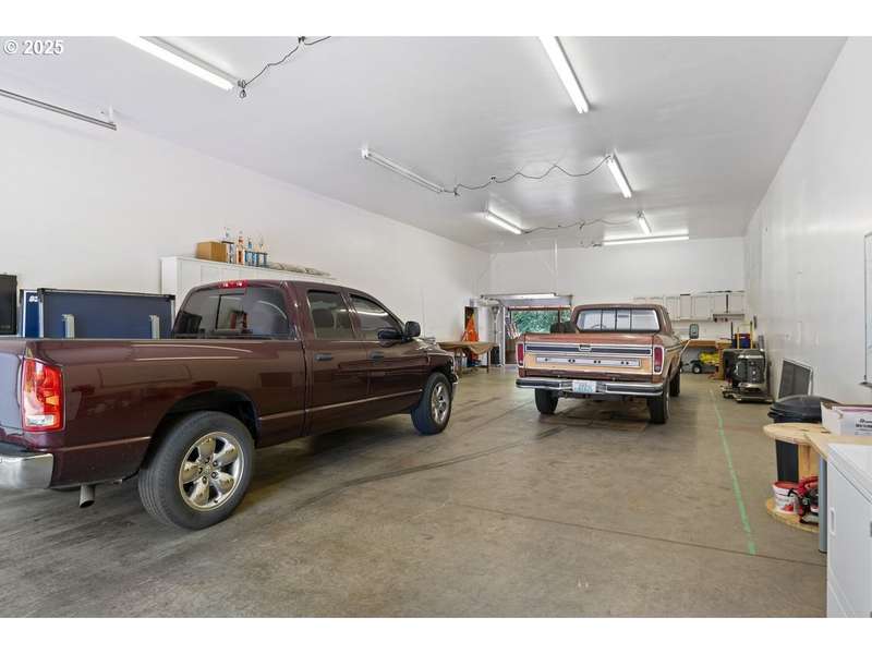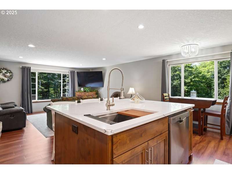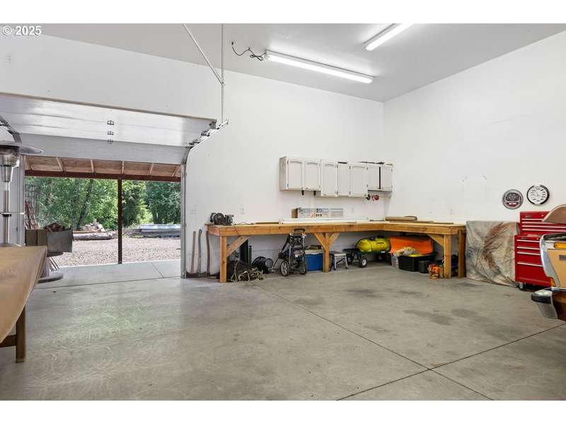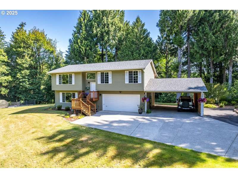 Country Living close to town! Completely remodeled 4 bedroom, 2.5 bath home with 1794 sf. Split level floor plan. Upper living room. Vinyl plank flooring throughout living area. Custom kitchen by Selix with knotty alder cabinets and quartz countertops, Title backsplash and undermount full size sink. Large island with seating and beverage fridge, Double ovens, wine fridge and island with seating. Renovated baths. Bedrooms have new plush carpet. Primary suite with private bath. Family room with 4th bedroom and bath on lower level. Double car garage, Double carport, fully finished 40 X 60 shop with overhead mezzanine storage and RV Parking all on 4.5 private wooded acres with a creek.