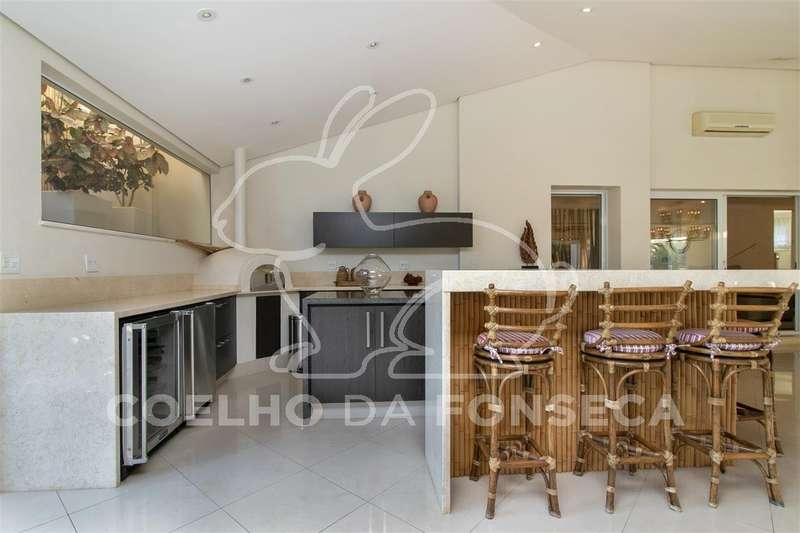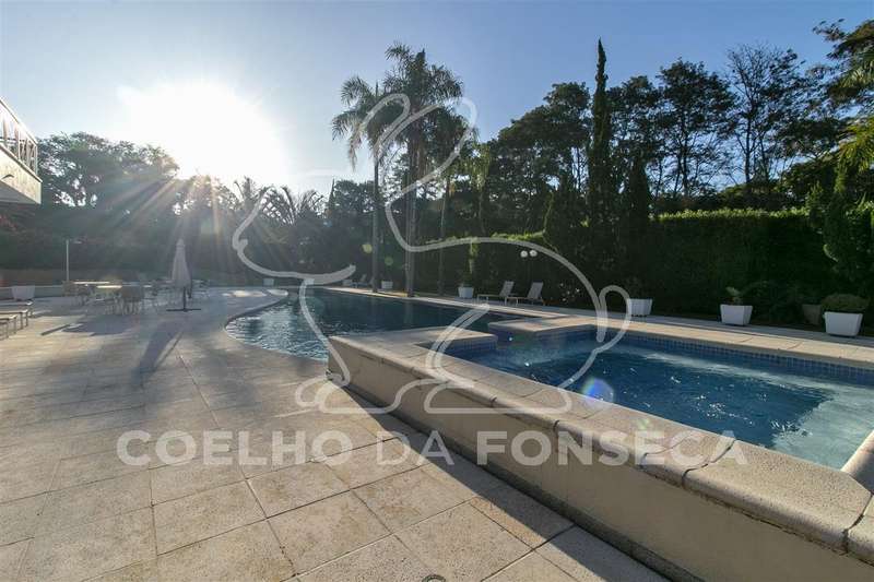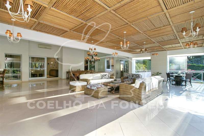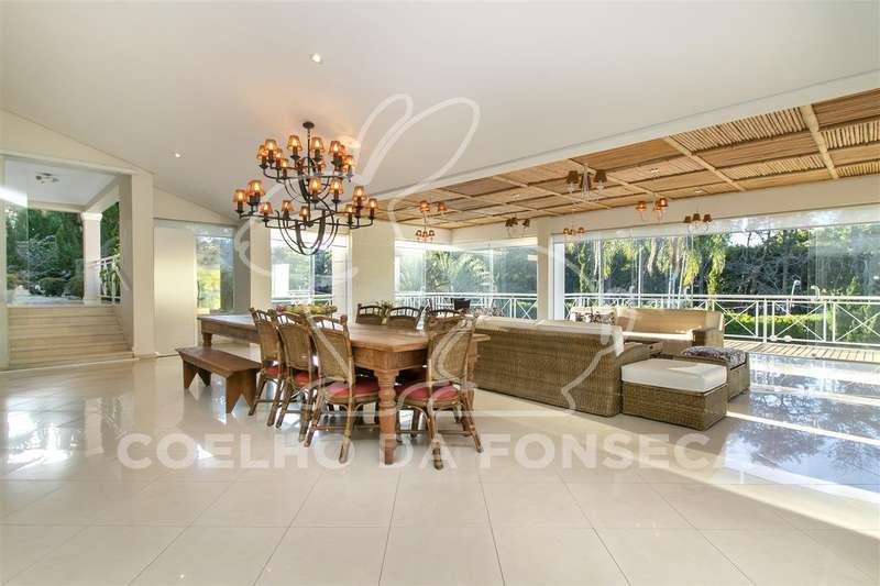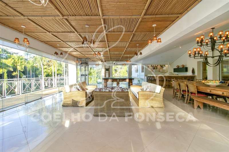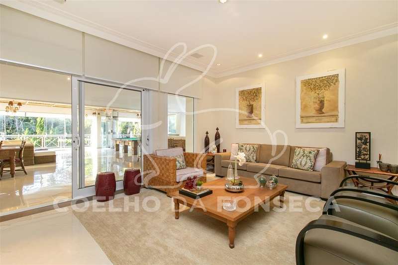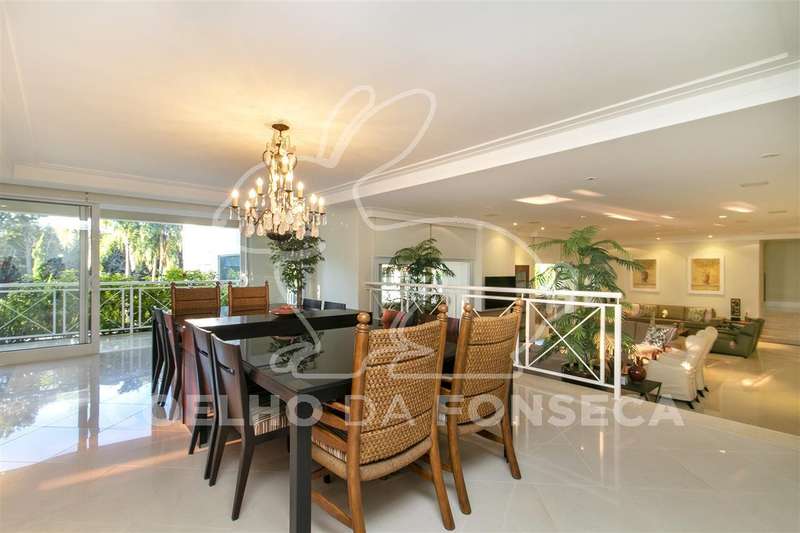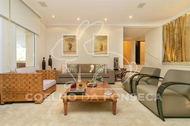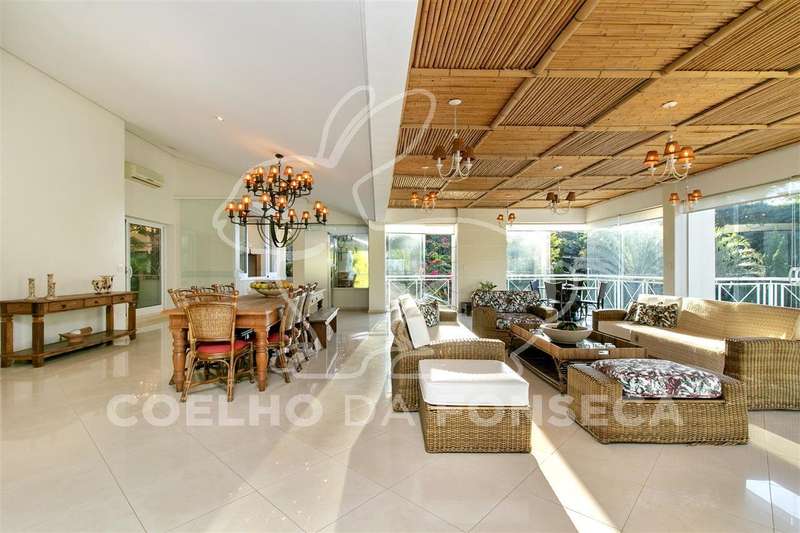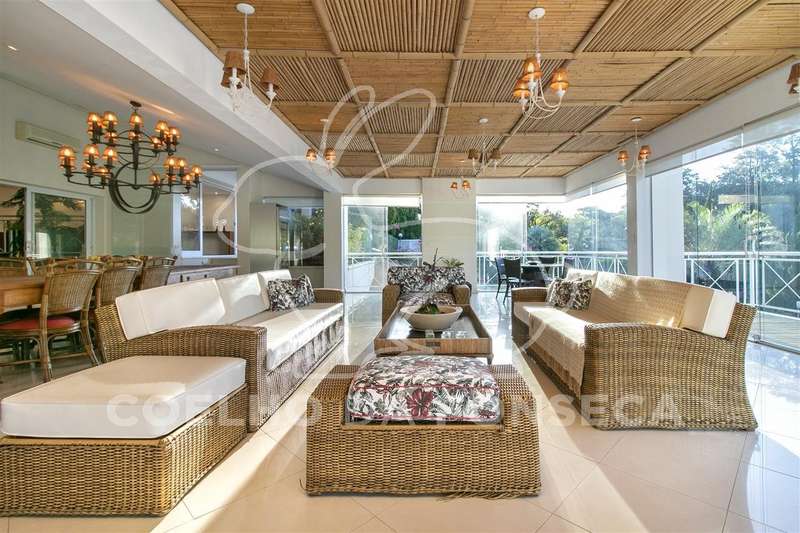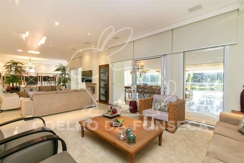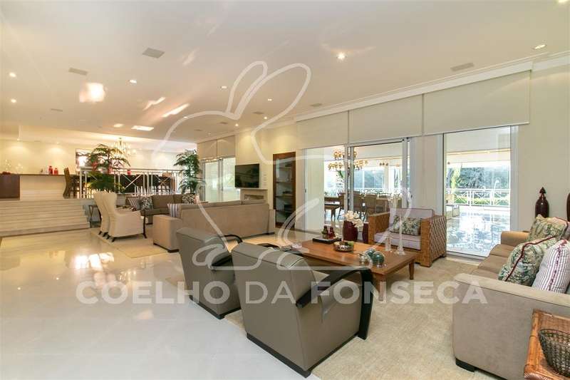 Living para quatro ambientes, com uma vista deslumbrante para a piscina climatizada, com raia de 25m, e para o jardim, com um projeto paisagístico belíssimo composto por palmeiras imperiais e um gramado muito bem cuidado.