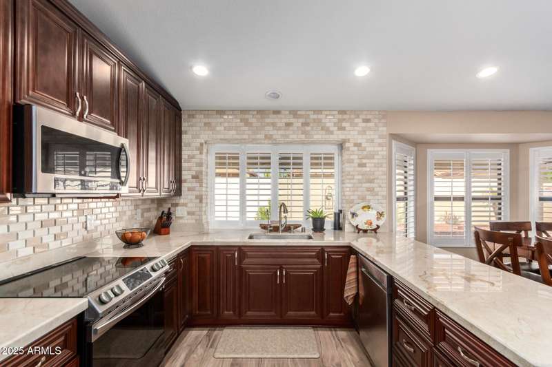From the moment you step inside, you're greeted by soaring vaulted ceilings and an expansive living area that flows seamlessly into the dining and kitchen spaces. The open concept design is anchored by a stylish bartop, creating the ideal setting for both casual mornings and evening gatherings. The kitchen is a true showstopper, featuring striking Quartzite countertops, modern finishes, and meticulous attention to detail throughout.