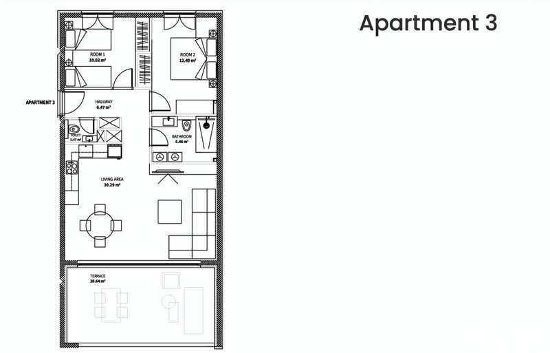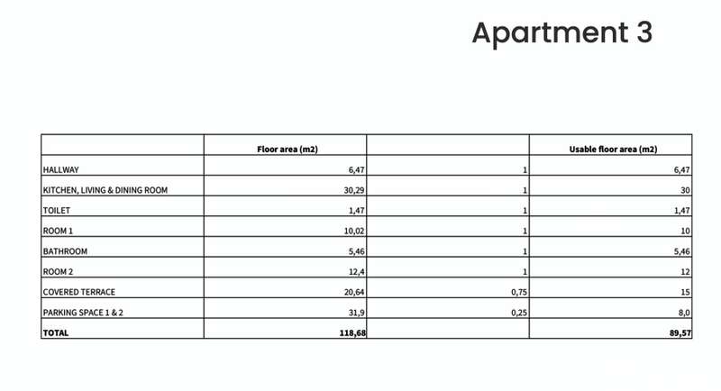 Apartment S-3A - 1st floor - living area 66.57 m2 (2 bedrooms + bathroom + WC) + covered terrace (20 m2) + two outdoor parking spaces no. 1 and 2; net calculated area 89.57 m2 = 685,000.00 EUR