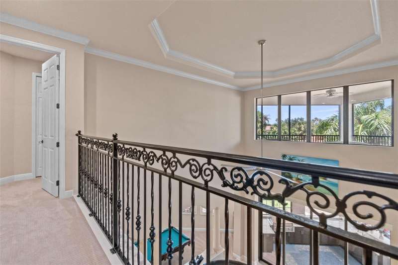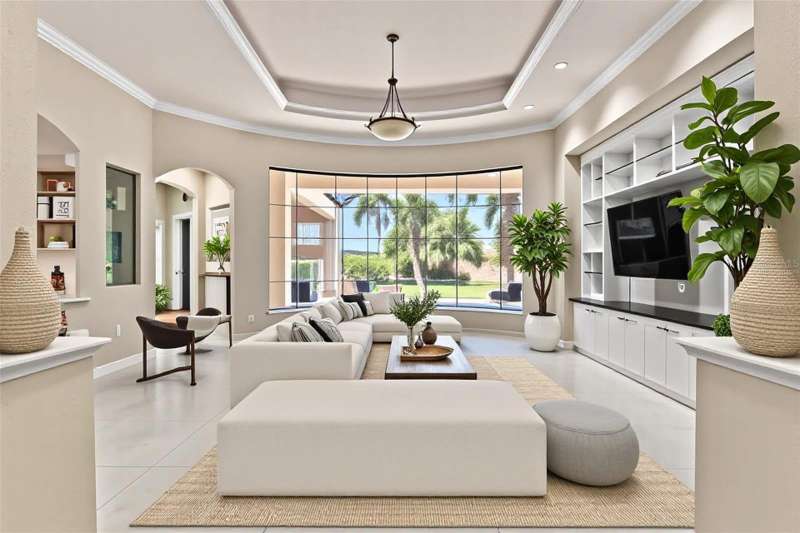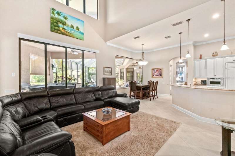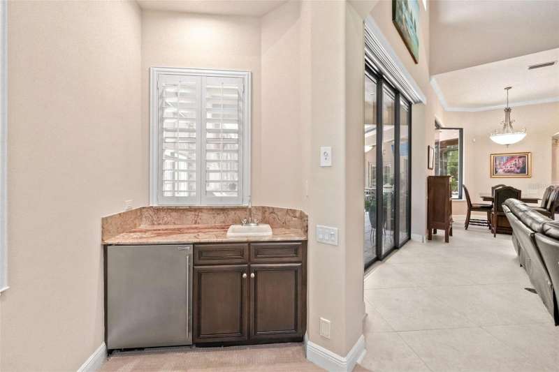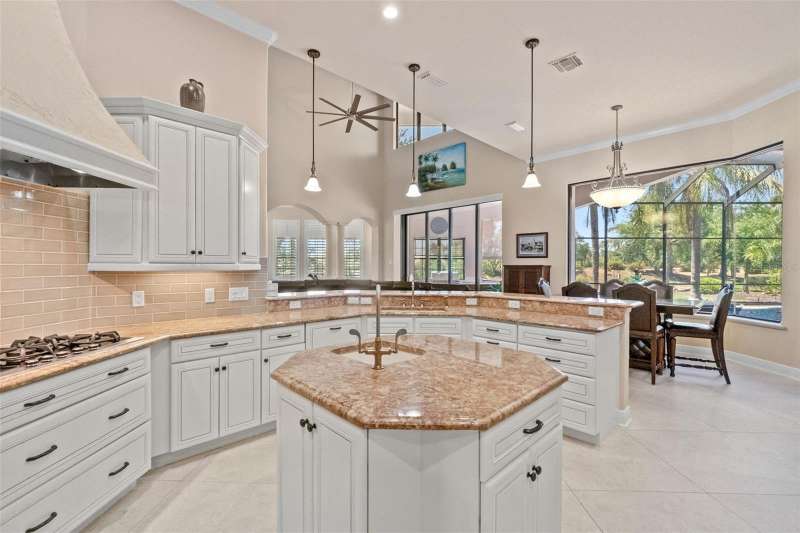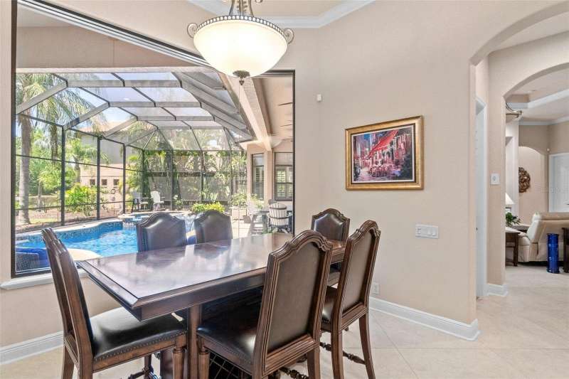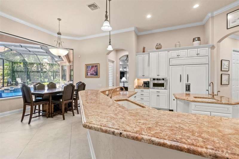 One or more photo(s) has been virtually staged. Welcome to the pinnacle of Florida luxury living on a premier cul de sac overlooking the prestigious Kings Dune’s 15th green in the heart of Lakewood Ranch. This exceptional estate, exquisitely crafted by John Cannon homes, combines elegant design, resort-style amenities and smart features to create a truly unforgettable home. Nestled on a premium half acre lot, the professional landscaping blends tropical palms and sophisticated oaks, setting the stage for the impressive elevation drawing your eye up the refined paver driveway to the substantial double front doors. Step inside to find a bright, open entryway enhanced by soaring 24’ ceilings and an expansive dining and gathering room framed by windows that flood the space with natural light. Feature your precious collectibles and artwork in the built-in entertainment center and multiple wall niches, creating easy displays to personalize your space and aesthetic. The aspiring chef will delight in the beautiful kitchen where crafting your culinary creations is a breeze with the help of high end appliances and a functional layout. The open concept affords effortless entertainment and promises that you never misses a moment or a memory whether your guests are seated at the counter, in the eat in kitchen area, the expansive living room with a warm gas fireplace or the bonus billiards room. Outdoor integration is seamless with collapsable glass doors to the expansive outdoor kitchen and screened oasis featuring a large, salt water pool and spa, comfortable ceiling fans, a television and a generous patio with ample seating and gathering areas. As days of adventures fade to peaceful evenings and sunsets, the first floor principal suite will be your personal retreat where a luxurious bath including a walk-in shower, soaking tub, double sinks and handsome travertine tile. This space is the perfect place to pamper and unwind while the custom owner’s closet will keep your fetching attire organized. This home offers three additional, generous bedrooms each with a private bath, a quiet office space, a second floor screened patio with pristine golf course views, multiple wet bars with wine storage, a water purification system, and 3 a/c units (each replaced since 2020). For those who love to tinker, the 3.5 car garage features epoxy flooring, it’s own a/c, new cabinets and shelves, upgraded electrical and an insulated attic space. Rest peacefully knowing your home is protected by waterproofed outdoor electrical, hurricane film on select windows and hurricane shutters, and a whole house gas generator. Located just minutes from world-class shopping, dining, top-rated schools and the vibrant culture and arts scene of Sarasota this home is ideal for a full time resident or an amazing seasonal escape. Experience the ultimate in Florida luxury living – where every detail is curated for comfort, style and relaxation. It’s more than a home, it’s a lifestyle!