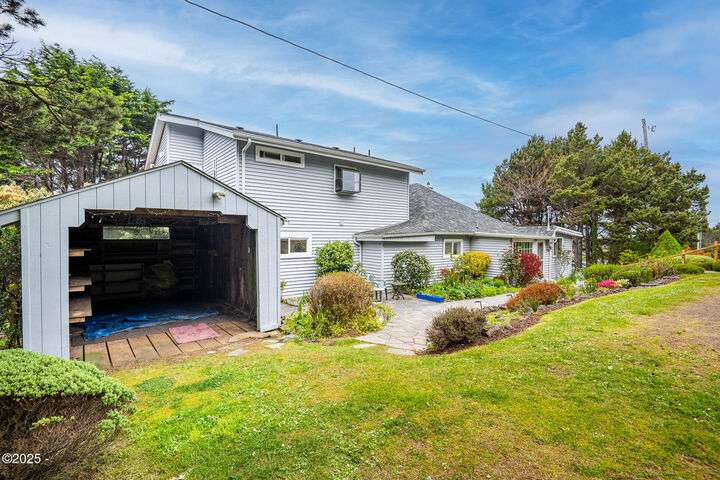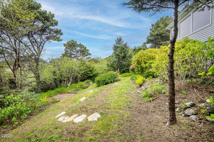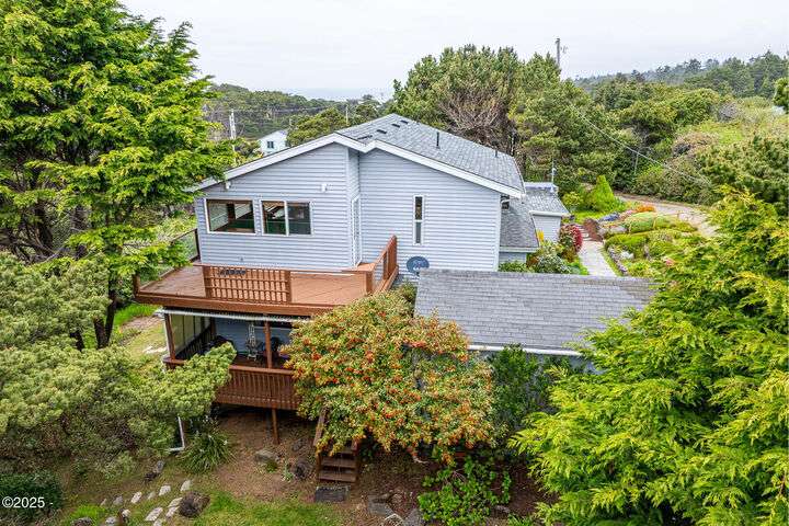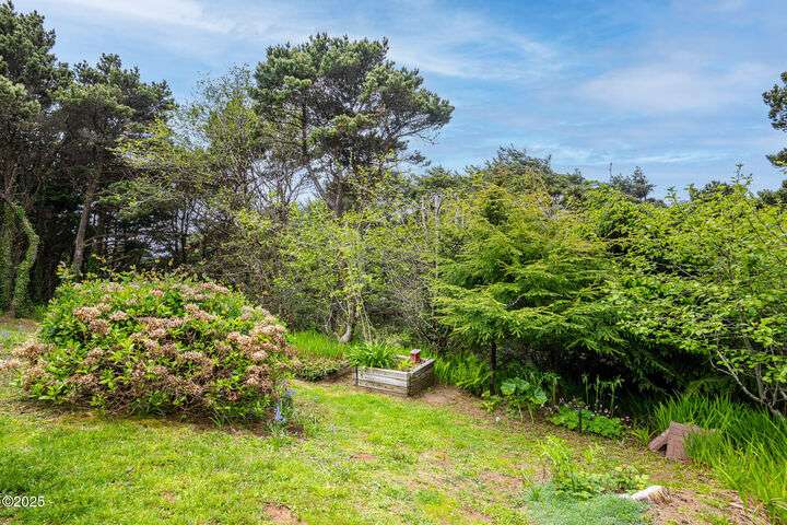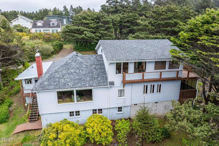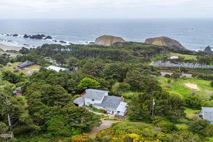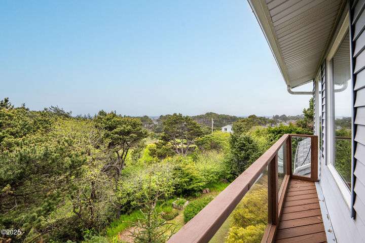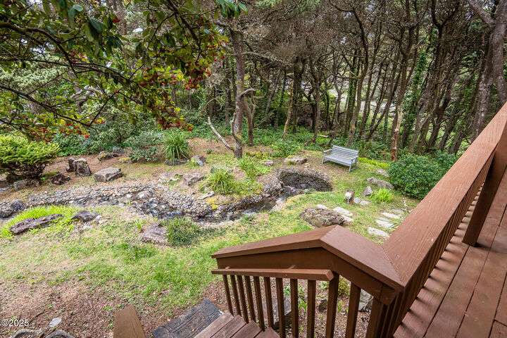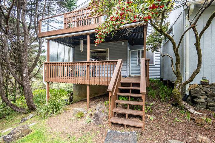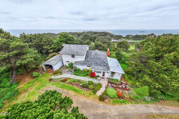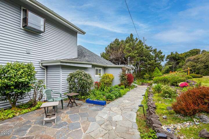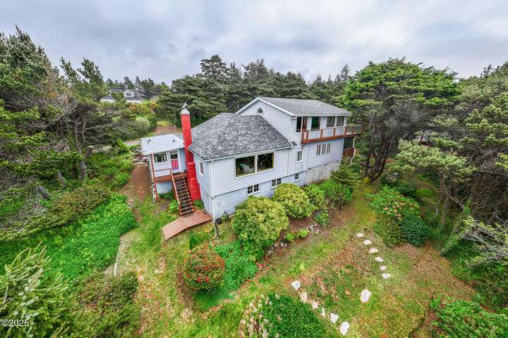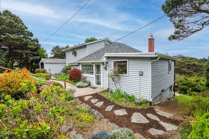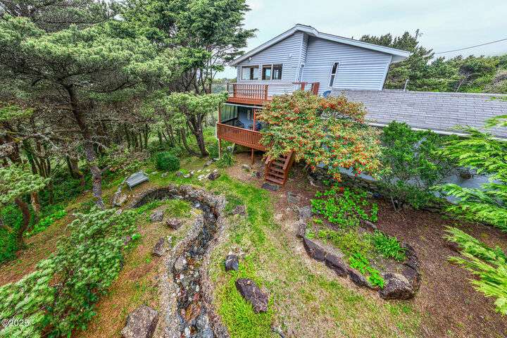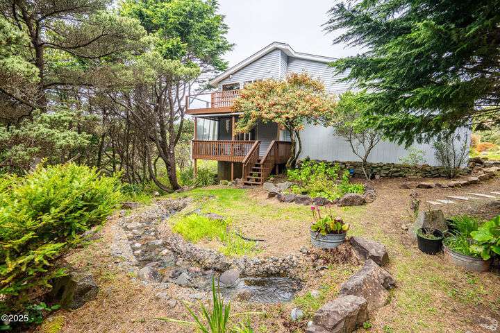 Seal Rock Treasure - Historic Coastal Home with Ocean Views & Garden Paradise! Two tax lots with Hwy 101 frontage provide optimal privacy for this one-of-a-kind property in the heart of Seal Rock, Oregon. Originally built in the 1890s—reportedly once serving as the local dance hall—this home has been thoughtfully transformed over the decades. A 1940s addition introduced a cozy kitchen and bedroom, while the 1980s brought a spacious upper-level primary suite with vaulted ceilings and sweeping ocean views. Today, the residence offers 3 bedrooms and 3 bathrooms, seamlessly blending historic charm with modern comfort. Highlights include a library finished in solid Blue Pine, creating a warm retreat. Living and dining rooms with exposed second-growth Hemlock beams and pristine solid wood floors beneath the carpeting. Numerous tasteful updates that reflect true pride of ownership. Outdoor living is equally enchanting. Relax on the welcoming porch, upper deck, or patio, then wander down flagstone steps to your own 50-foot man-made creek and waterfallan idyllic, private garden sanctuary. The property also includes an additional western-facing lot, further enhancing privacy and potential. And just a five-minute stroll brings you to the iconic Seal Rock Beach, where rugged coastline meets timeless Oregon beauty.