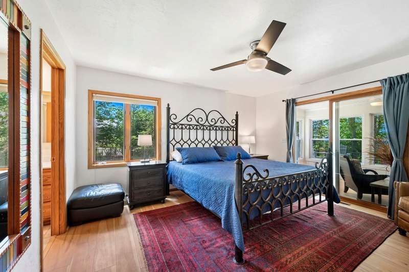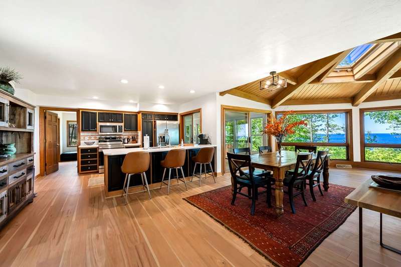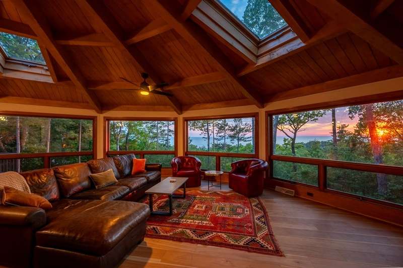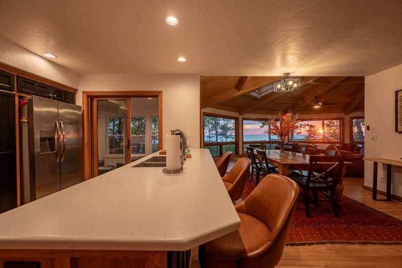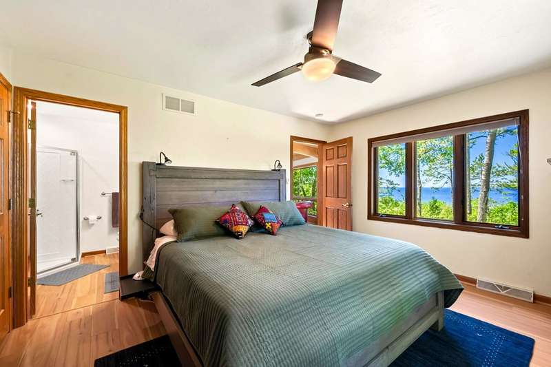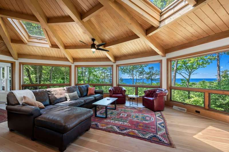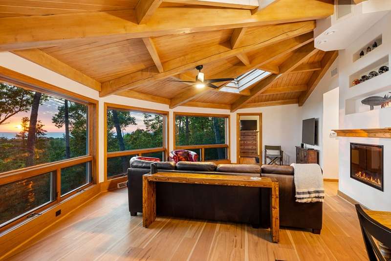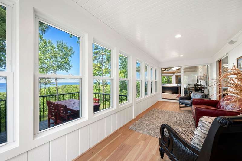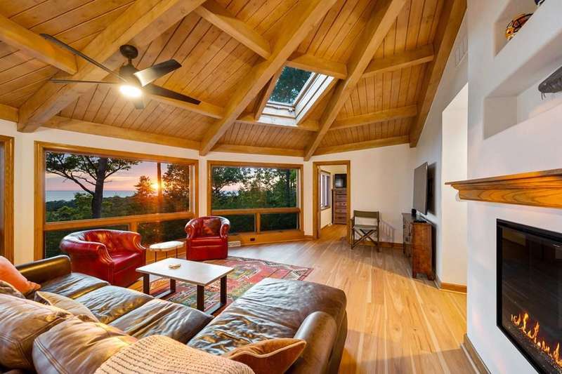 Perched atop a private bluff with sweeping bay views, this Door County retreat showcases unforgettable sunsets through floor-to-ceiling windows in the living room and four-season sunroom, as well as from the deck. Vaulted timber ceilings, skylights, and a cozy fireplace create a warm, inviting gathering space, while the kitchen and primary suite open directly to the sunroom for effortless indoor-outdoor living. With 3 bedrooms, 2 bathrooms, new flooring, a renovated guest bath, and over 2,100 sq ft of light-filled space just minutes from Sturgeon Bay and Egg Harbor, this home is the ultimate Door County sanctuary, where breathtaking views meet timeless design.