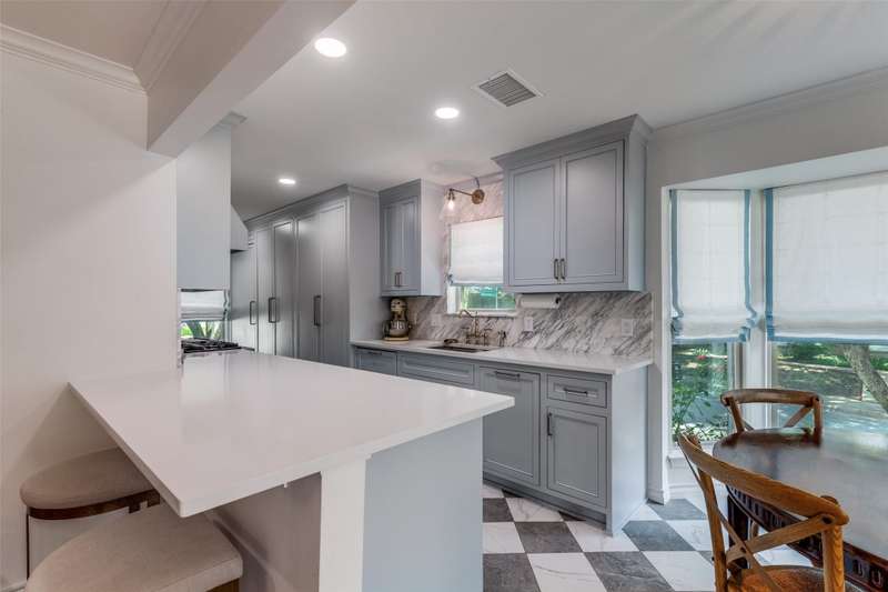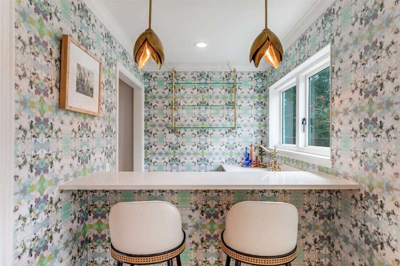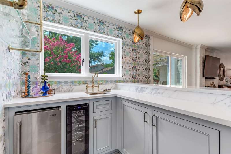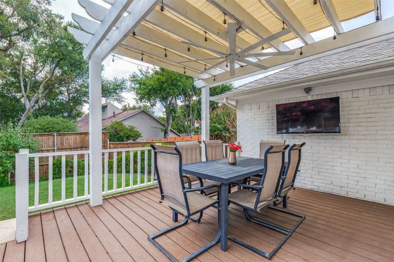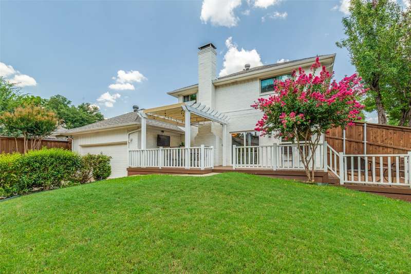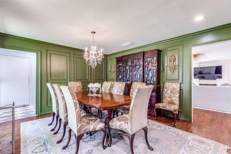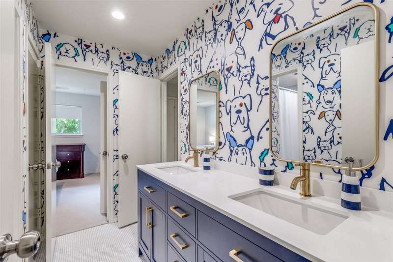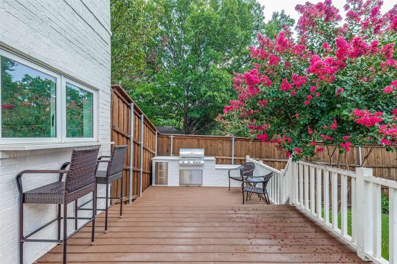 Welcome to this designer renovated Lake Highlands gem, a one of a kind home featured in design publications and curated by Emory McKim Design. Situated on a professionally landscaped and lighted quiet corner lot in the highly sought after, Moss Haven Elementary, this 4 bedroom, 2.5 bath property blends family functionality with elevated style and finishes. Offering an open floor plan and fully renovated in 2023, this special home boasts a custom kitchen with granite tops, Italian marble backsplash, Zline gas range, Bosch dishwasher, Monogram refrigerator, custom built cabinetry and window treatments. Open wet bar wrapped in iconic Laura Park wallpaper with icemaker and pass through window to custom Trex deck, grill, outdoor living area with pergola. Spacious first floor Primary suite with marble bath and custom tile and wallpaper, Formal Dining Room with avocado color walls and custom drapes, has pocket door to kitchen. Every space in this designer home is move in ready and thoughtfully designed. This home is the perfect blend of comfort, character and curb appeal.