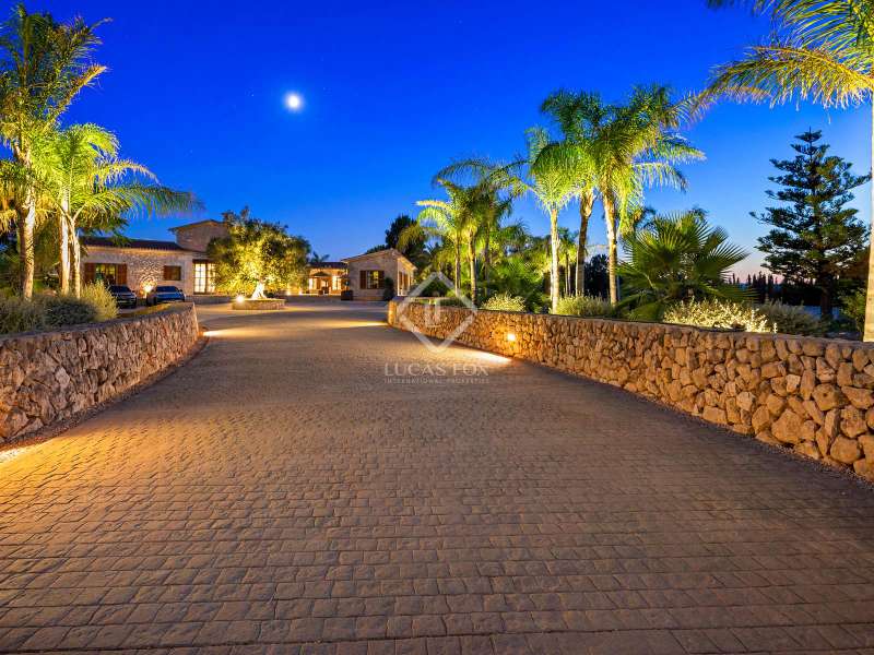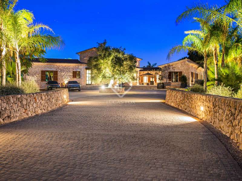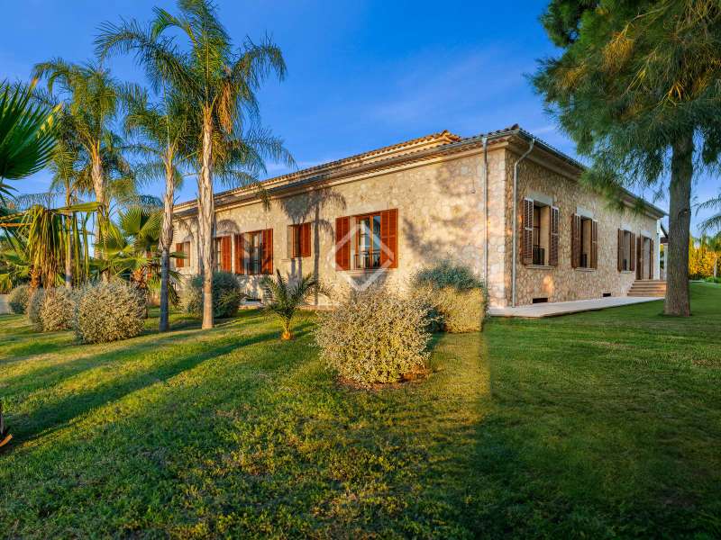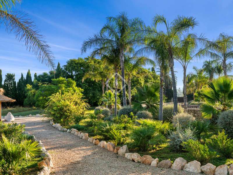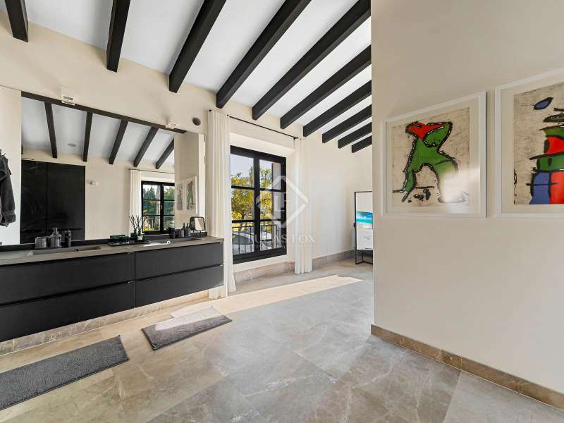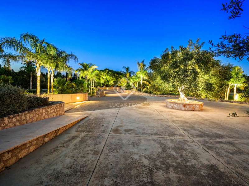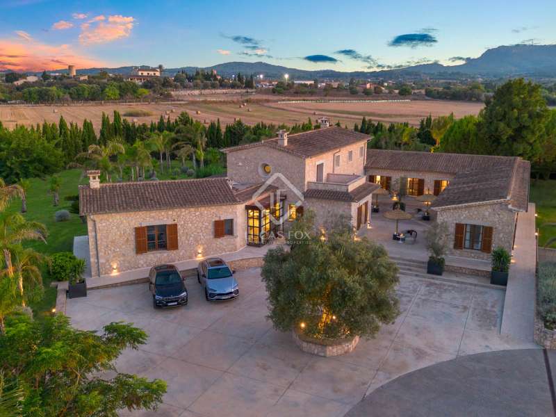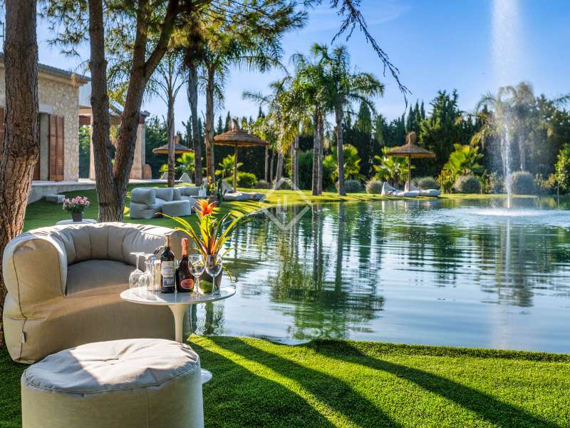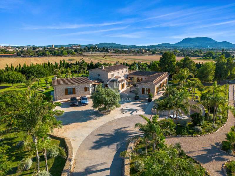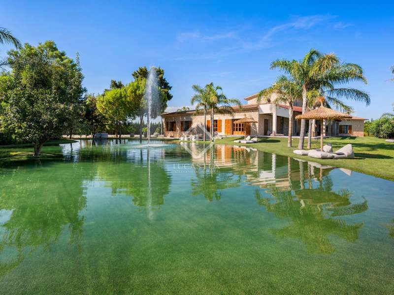 An extraordinary finca set within lush, sub-tropical gardens that envelop the entire estate, creating the atmosphere of a private park complete with a serene lake and inviting swimming pool. This remarkable property sits on a generous plot of 20,899 m², with a constructed area of 1,166 m². It offers 6 spacious bedrooms and 6 bathrooms, including a separate guest apartment. The open-plan design features high vaulted ceilings, while the expansive living room includes a mezzanine-level office. The modern kitchen, fully equipped with a central island, flows seamlessly into the dining areas on covered terraces. Additional amenities include a wine cellar, an extensive garage accommodating up to 10 cars, a separate laundry room, and technical/storage areas. The finca is fitted with premium features, such as hot and cold air conditioning, underfloor heating, an Ecodan heat pump, and a natural water well. Energy-efficient additions include 21 solar panels. The interiors are adorned with Binissalem stone floors, wooden beams, and a sound system in every room. For those seeking a profitable investment, the property comes with a coveted vacation rental ETV license, making it the perfect secluded retreat for holidays in Mallorca. With total privacy and no close neighbors. Located just a 25-minute drive from Palma city center.