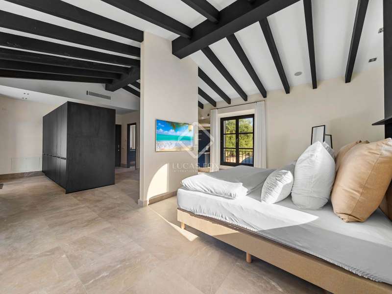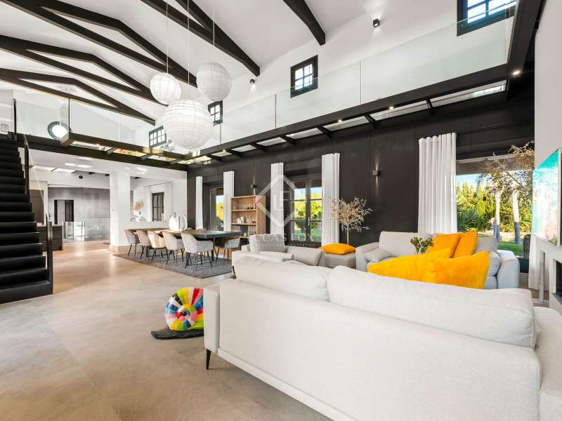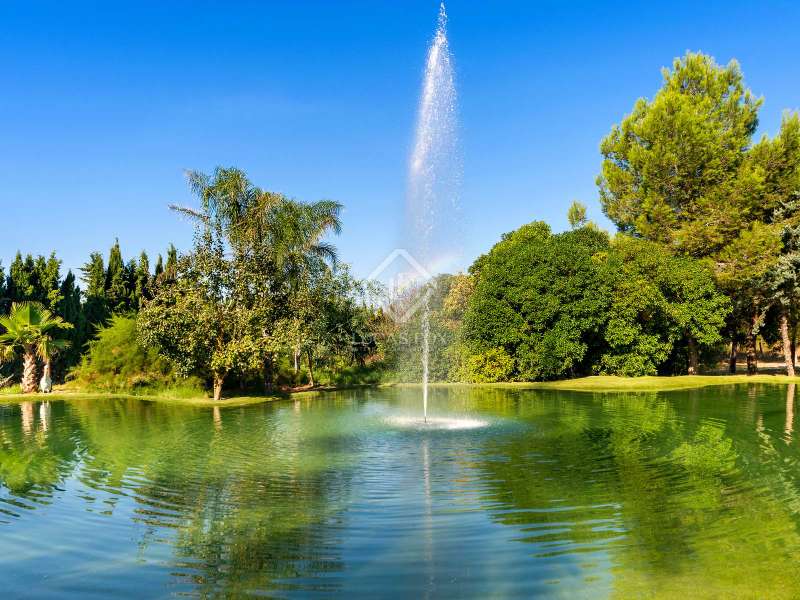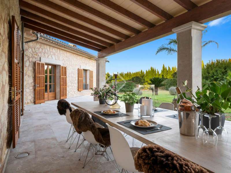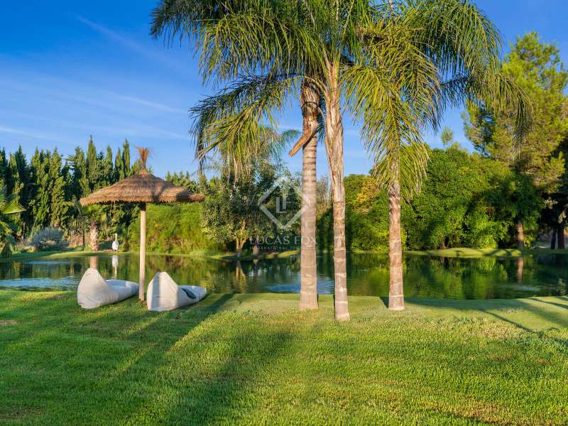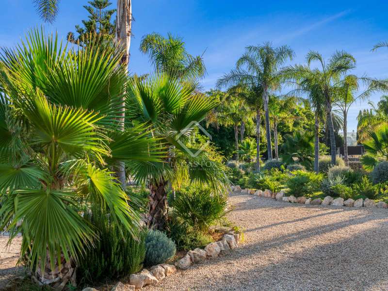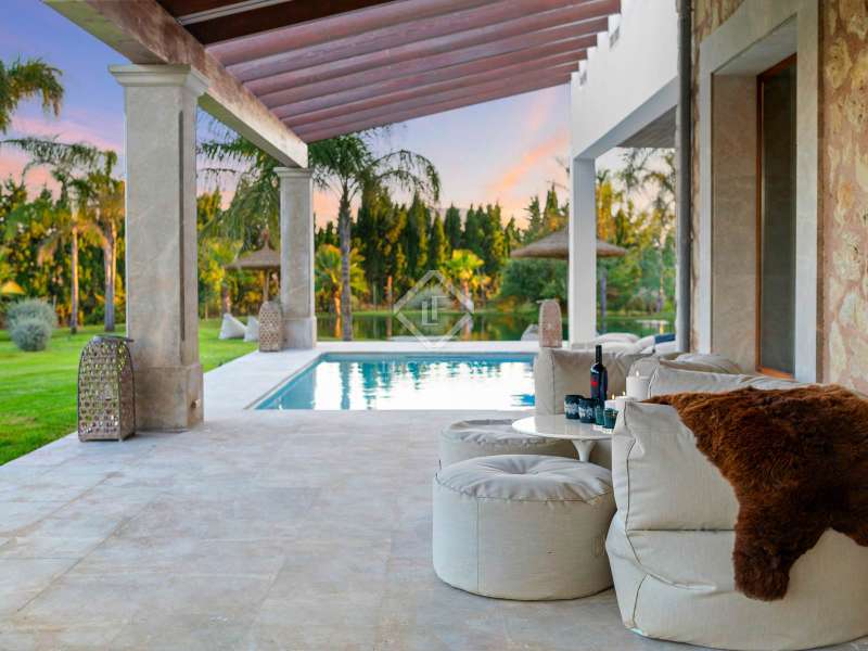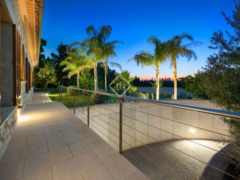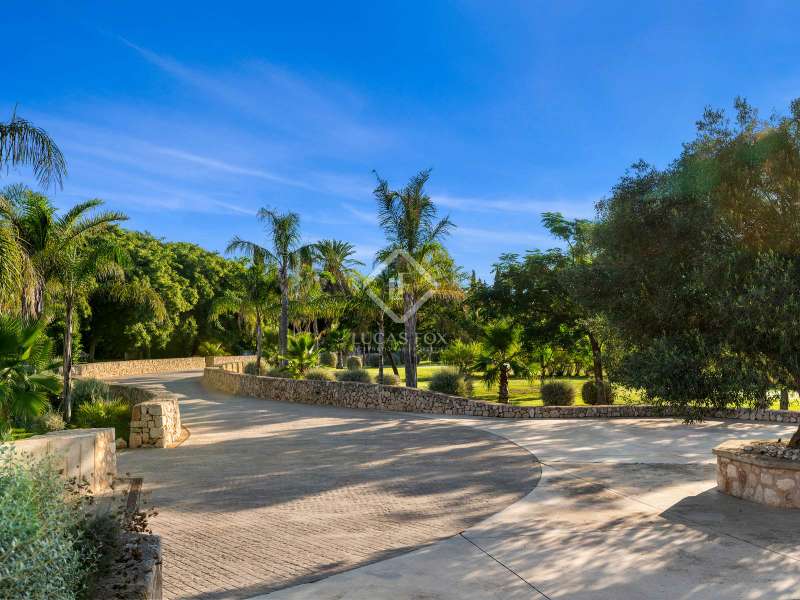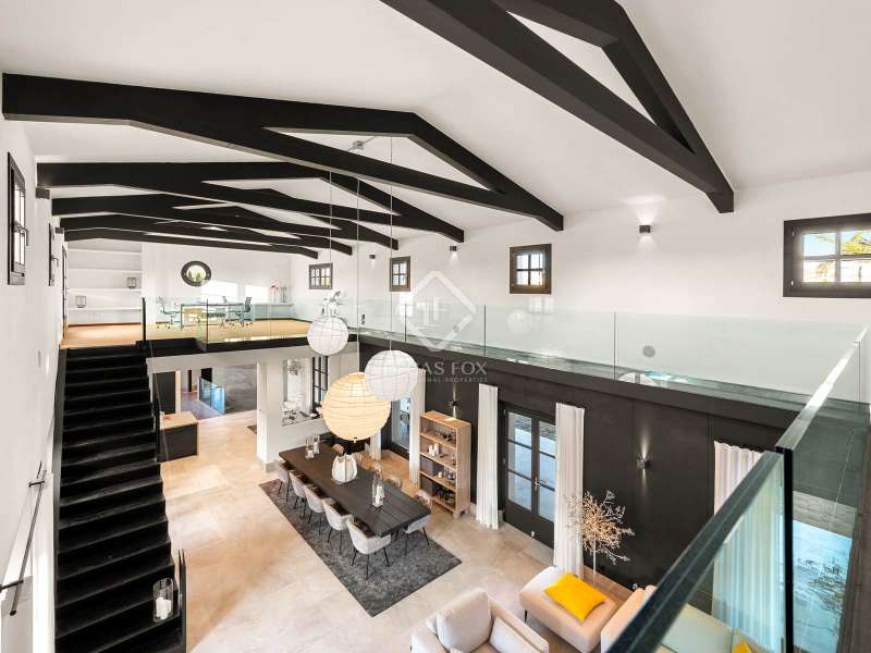 An extraordinary finca set within lush, sub-tropical gardens that envelop the entire estate, creating the atmosphere of a private park complete with a serene lake and inviting swimming pool. This remarkable property sits on a generous plot of 20,899 m², with a constructed area of 1,166 m². It offers 6 spacious bedrooms and 6 bathrooms, including a separate guest apartment. The open-plan design features high vaulted ceilings, while the expansive living room includes a mezzanine-level office. The modern kitchen, fully equipped with a central island, flows seamlessly into the dining areas on covered terraces. Additional amenities include a wine cellar, an extensive garage accommodating up to 10 cars, a separate laundry room, and technical/storage areas. The finca is fitted with premium features, such as hot and cold air conditioning, underfloor heating, an Ecodan heat pump, and a natural water well. Energy-efficient additions include 21 solar panels. The interiors are adorned with Binissalem stone floors, wooden beams, and a sound system in every room. For those seeking a profitable investment, the property comes with a coveted vacation rental ETV license, making it the perfect secluded retreat for holidays in Mallorca. With total privacy and no close neighbors. Located just a 25-minute drive from Palma city center.