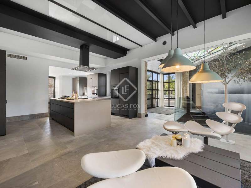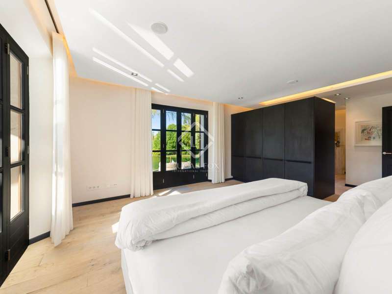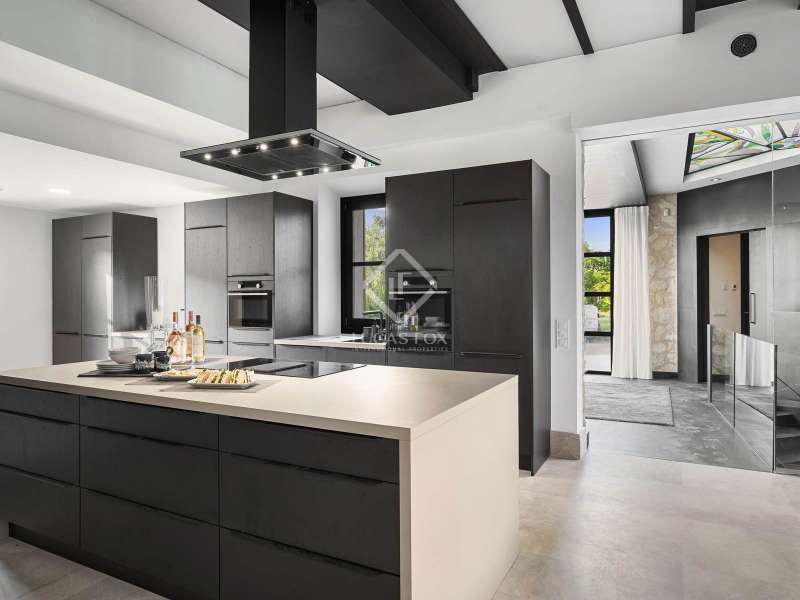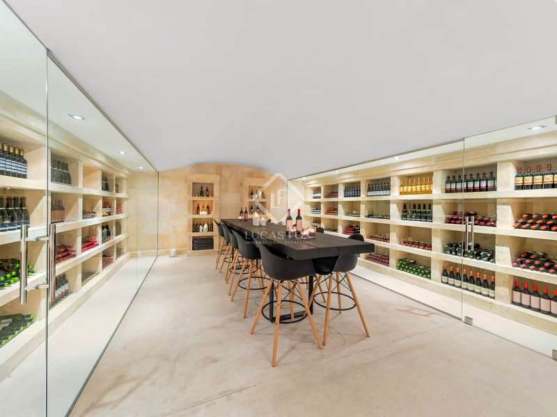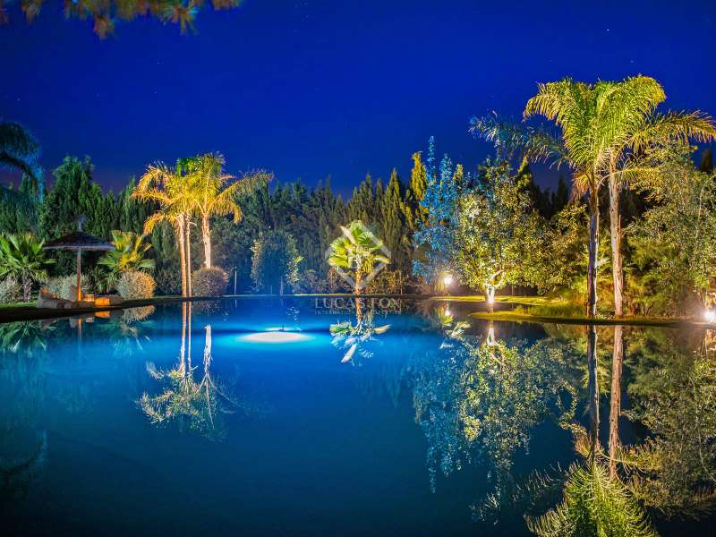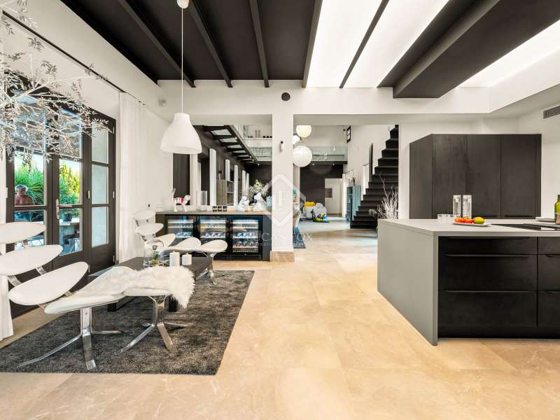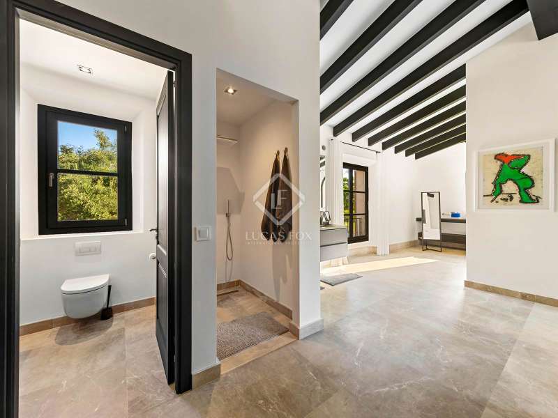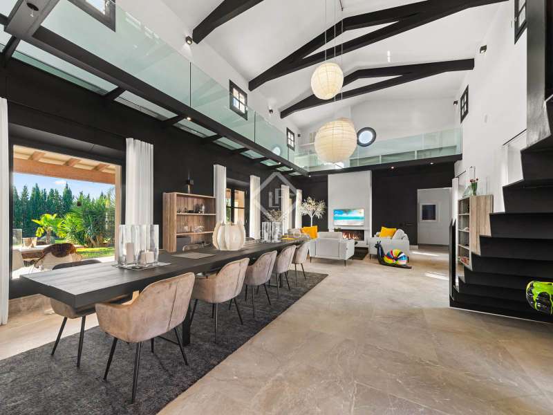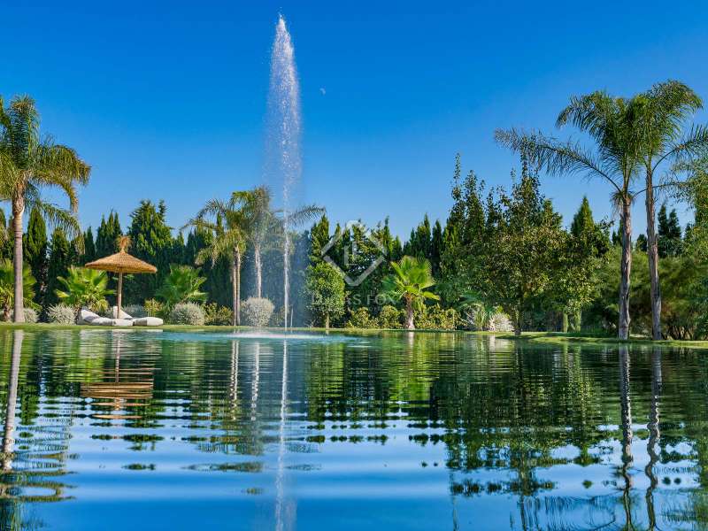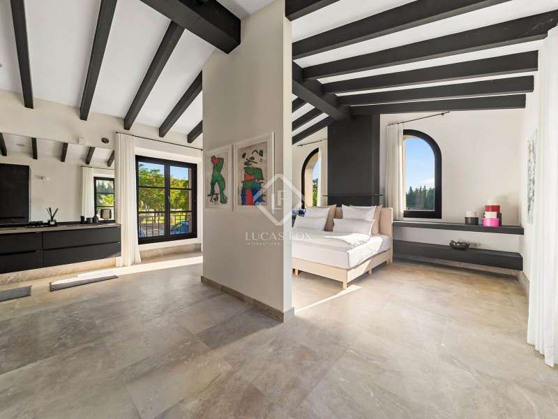 An extraordinary finca set within lush, sub-tropical gardens that envelop the entire estate, creating the atmosphere of a private park complete with a serene lake and inviting swimming pool. This remarkable property sits on a generous plot of 20,899 m², with a constructed area of 1,166 m². It offers 6 spacious bedrooms and 6 bathrooms, including a separate guest apartment. The open-plan design features high vaulted ceilings, while the expansive living room includes a mezzanine-level office. The modern kitchen, fully equipped with a central island, flows seamlessly into the dining areas on covered terraces. Additional amenities include a wine cellar, an extensive garage accommodating up to 10 cars, a separate laundry room, and technical/storage areas. The finca is fitted with premium features, such as hot and cold air conditioning, underfloor heating, an Ecodan heat pump, and a natural water well. Energy-efficient additions include 21 solar panels. The interiors are adorned with Binissalem stone floors, wooden beams, and a sound system in every room. For those seeking a profitable investment, the property comes with a coveted vacation rental ETV license, making it the perfect secluded retreat for holidays in Mallorca. With total privacy and no close neighbors. Located just a 25-minute drive from Palma city center.