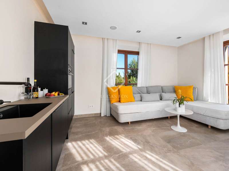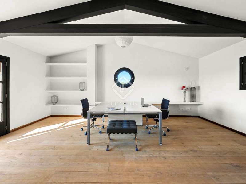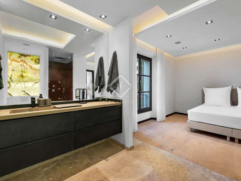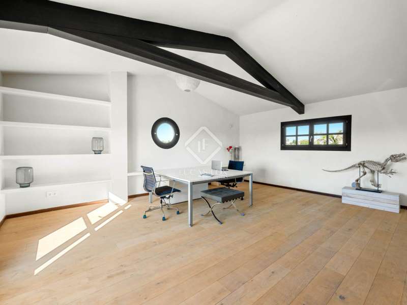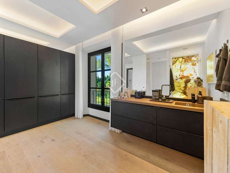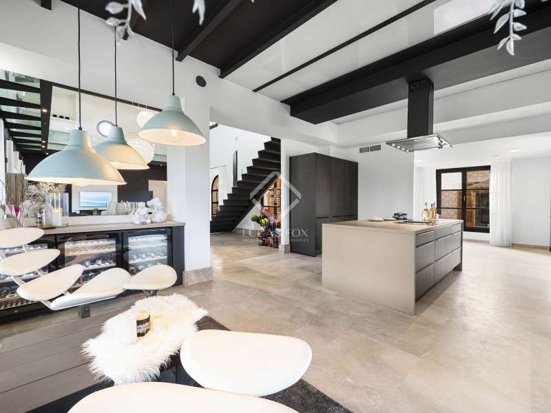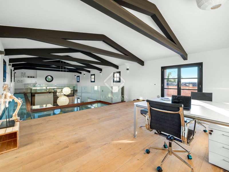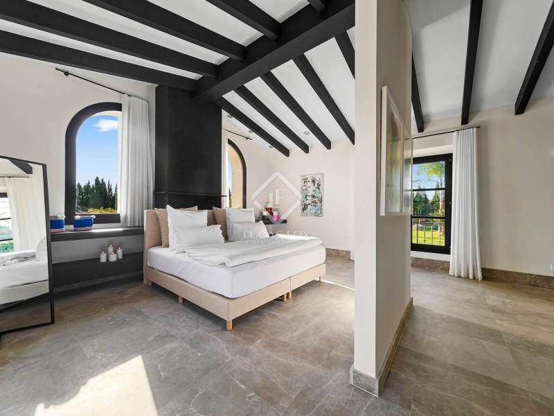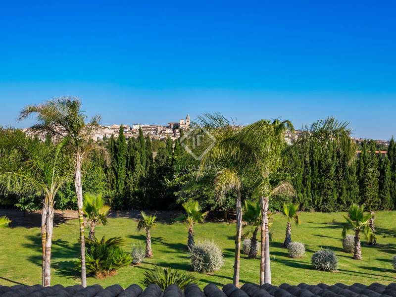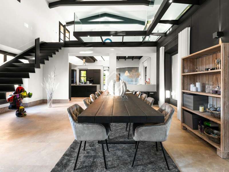 An extraordinary finca set within lush, sub-tropical gardens that envelop the entire estate, creating the atmosphere of a private park complete with a serene lake and inviting swimming pool. This remarkable property sits on a generous plot of 20,899 m², with a constructed area of 1,166 m². It offers 6 spacious bedrooms and 6 bathrooms, including a separate guest apartment. The open-plan design features high vaulted ceilings, while the expansive living room includes a mezzanine-level office. The modern kitchen, fully equipped with a central island, flows seamlessly into the dining areas on covered terraces. Additional amenities include a wine cellar, an extensive garage accommodating up to 10 cars, a separate laundry room, and technical/storage areas. The finca is fitted with premium features, such as hot and cold air conditioning, underfloor heating, an Ecodan heat pump, and a natural water well. Energy-efficient additions include 21 solar panels. The interiors are adorned with Binissalem stone floors, wooden beams, and a sound system in every room. For those seeking a profitable investment, the property comes with a coveted vacation rental ETV license, making it the perfect secluded retreat for holidays in Mallorca. With total privacy and no close neighbors. Located just a 25-minute drive from Palma city center.