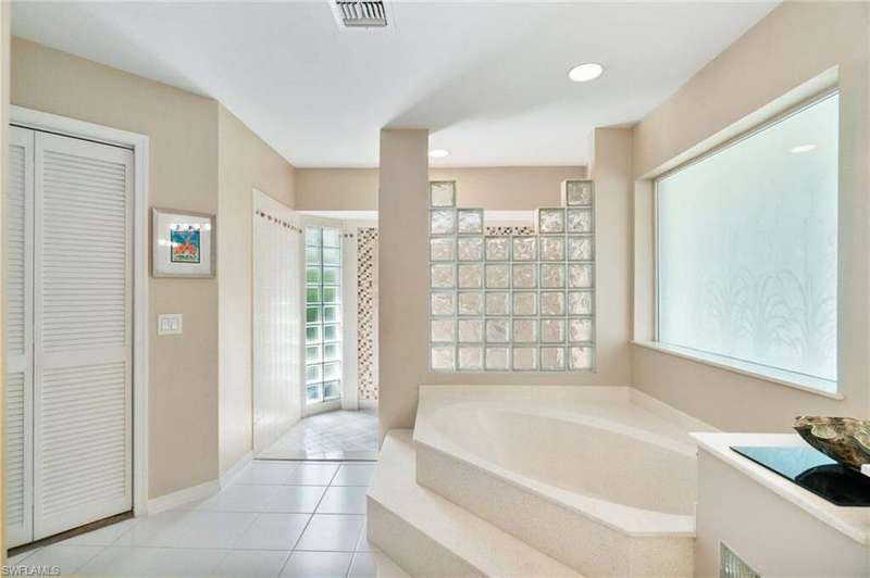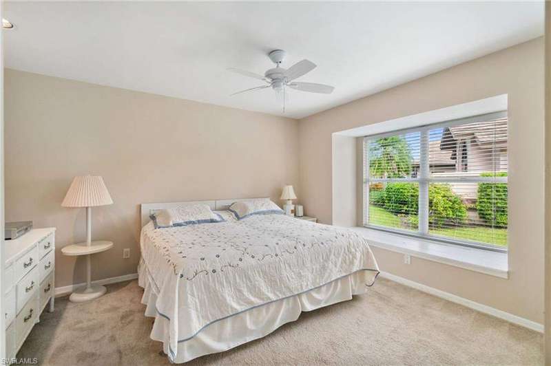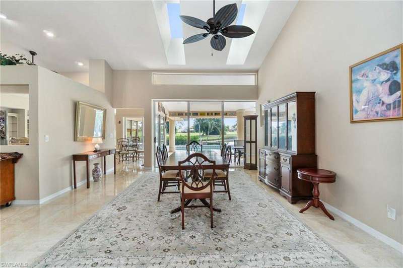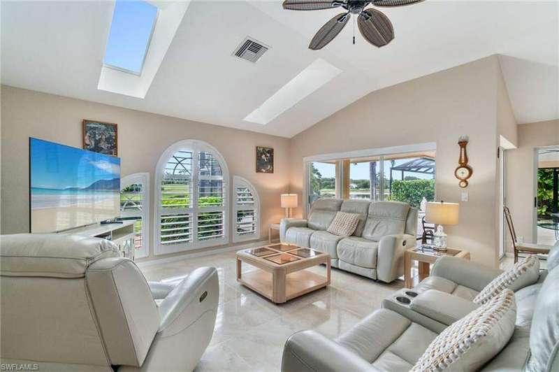 Excellent Floor plan with a Central Kitchen surrounded by a Large Family Room, Formal Living Room, Dining Room, Breakfast Nook, and easy access to a Large 689 sq ft. Covered Lanai for both Indoor and Outdoor Entertaining. This 3 bedroom, 2 bath, Pool Home is located on a Prime Lot offering Privacy and Southeast Views of the Lake and Golf course. The Vaulted Ceilings and Skylights, along with multiple sliders provides an abundance of natural lighting, and the split floor plan offers ideal privacy for guests. For increased safety and security, this house in located in an X-500 Flood Zone where Flood Insurance is Not Required. A New Tile Roof and large Picture Window Screen Enclosure were installed in 2023. Current Homeowners insurance is below $5,000 per year. The 600 sq ft garage has ample room for two passenger vehicles and a golf cart. Spanish Wells Country Club (membership is optional) offers a 27-hole golf course, tennis, fitness, bocce, and a variety of activities. This is an Ideal Location where community amenities, and ease of access to Barefoot Beach, Bonita Beach, RSW airport, Fine and Casual Dining, Coconut Point Mall, Mercato and Waterside Shops makes Living in SWFL a dream of a lifetime. Come see your little piece of paradise for yourself.