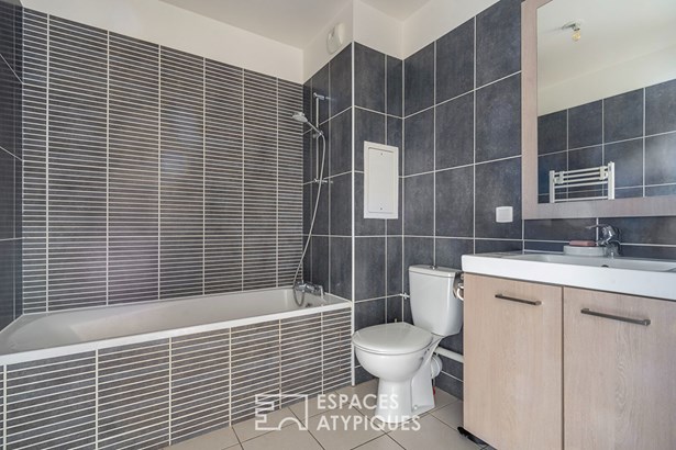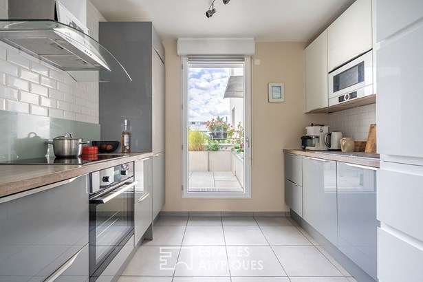 An entrance hall with a walk-in closet opens onto a 26 m2 (280 sq ft) living room extended by a semi-open fitted kitchen. This living space benefits from a 10 m2 (110 sq ft) south-facing terrace and an 8 m2 (80 sq ft) loggia.