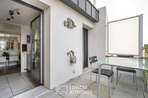 On the sleeping side, off the living room, an en-suite bedroom with a shower room opens onto a terrace. Two other bedrooms share a bathroom with a toilet.