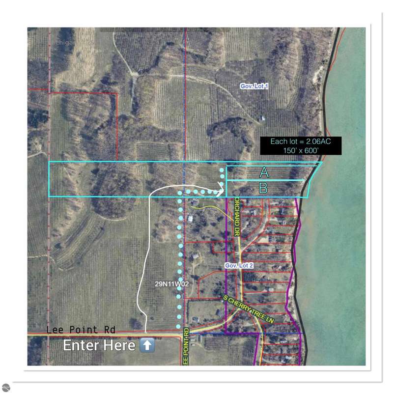 Premium location on the Stony Point peninsula off desirable Lee Point Rd. A shared drive to this private parcel with 150' frontage on West Bay with a path to water from the bluff site. Sunrise views over the Bay and you can even hear the Lee Point Buoy ding. Level building site with 2 acres to build any size home and accessory buildings for your toys/cars/shop. Sellers will clear cherry trees. Seller met with Robin from EGLE Oct. 15, 2025 = 50' setback from bluff for non permanent structures including a deck added on from house; 85' setback from bluff for permanent structures. This is part of a larger parcel being split off (Owners farm 200+ acres with over 100 acres in conservancy) This property is Not in conservancy. Access directions in associated documents. Use CAUTION; working farm & farm 2-track is best for pick up truck or vehicle w/higher clearance. Sellers clearing and making shared drive/easement to the building sites off Lee Point Rd. See associated docs. Subject to final land division approval (prelim ok)