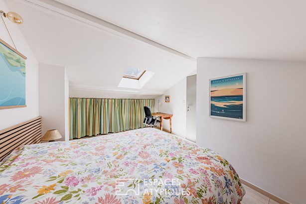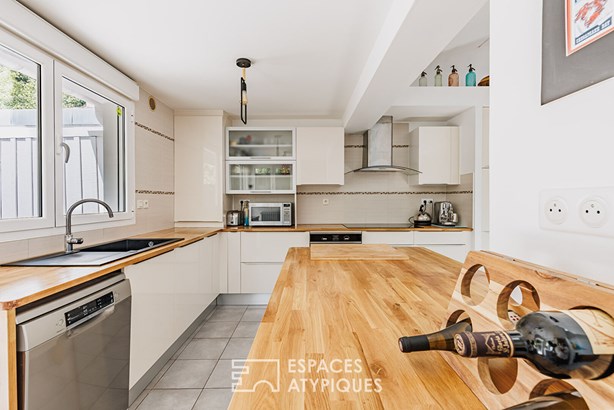 The ground floor reveals a generous living room bathed in light. The open kitchen harmoniously interacts with the living room, in a friendly and contemporary spirit. The whole opens onto a suspended terrace overlooking a green setting: an unexpected and soothing tree-lined panorama, all the more precious since it is located in the heart of the city.