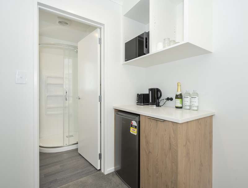 Each unit in this block features four spacious studio bedrooms, complete with en-suite bathrooms, kitchenettes, desks, and TVs.