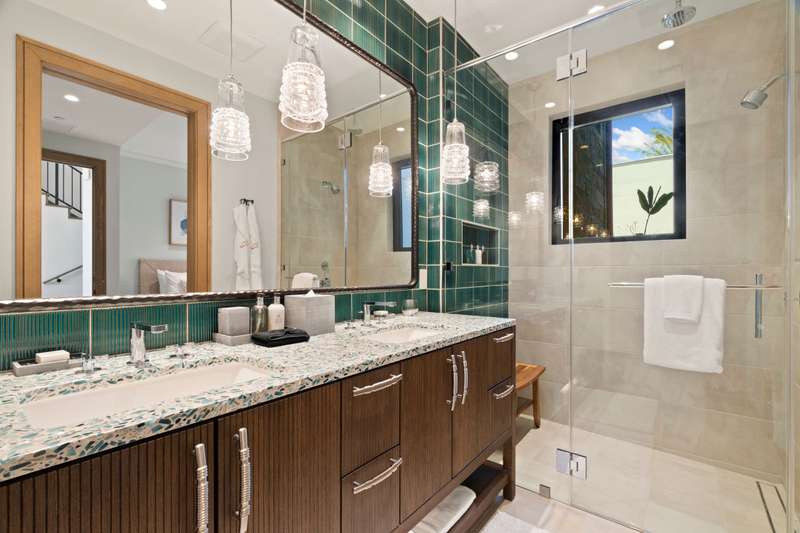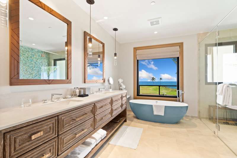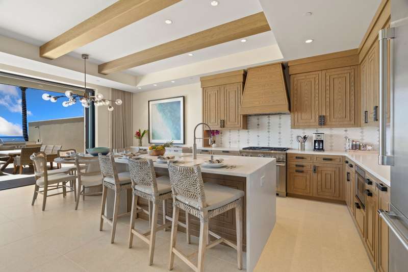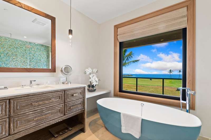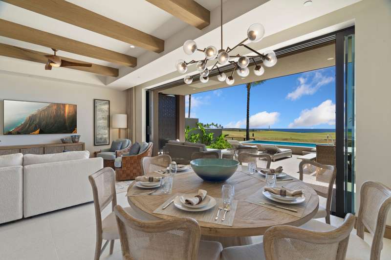 Laola Nani 3003 at Timbers Kauai is a breathtaking 2-story, 4-bedroom, 4.5-bath ocean-view townhome overlooking the 15th hole of the prized Ocean Course at Hokuala - a signature Nicklaus designed course. The furnished villa features a bright contemporary design which seamlessly blends indoor & outdoor living. The great room has high, floor-to-ceiling glass doors which open to a generous lanai and a private plunge pool, built in BBQ, and sweeping views of the sea and coastline beyond. The kitchen is a chef's dream with Thermador Pro Grand Series appliances, wine/beverage cooler, quartz countertops and custom tile backsplash. Each bedroom features an en suite bathroom, top-of the line finishes, and a lovely outdoor shower in the lower primary suite. This is the only 4-bedroom unit that is currently available with a desirable fenced-in yard.