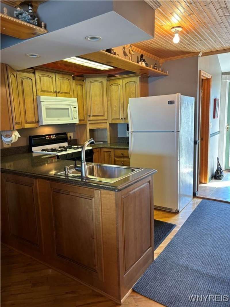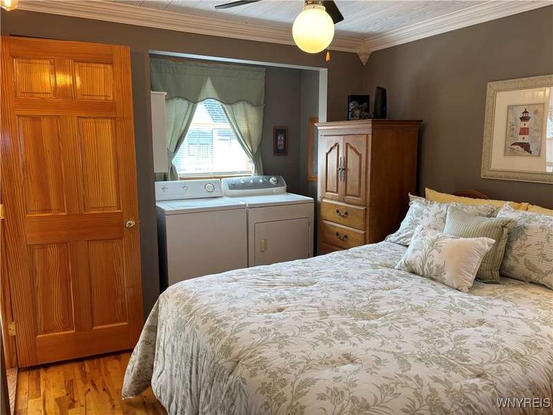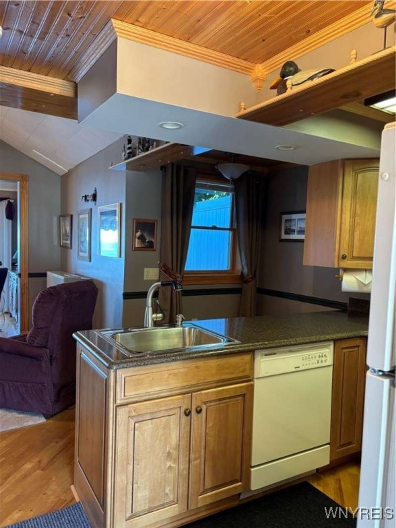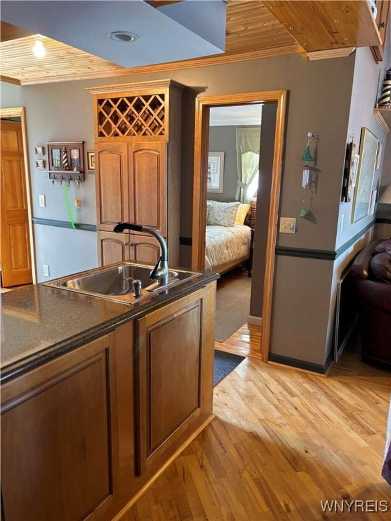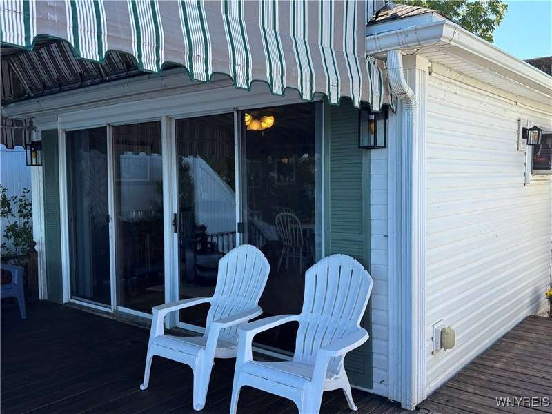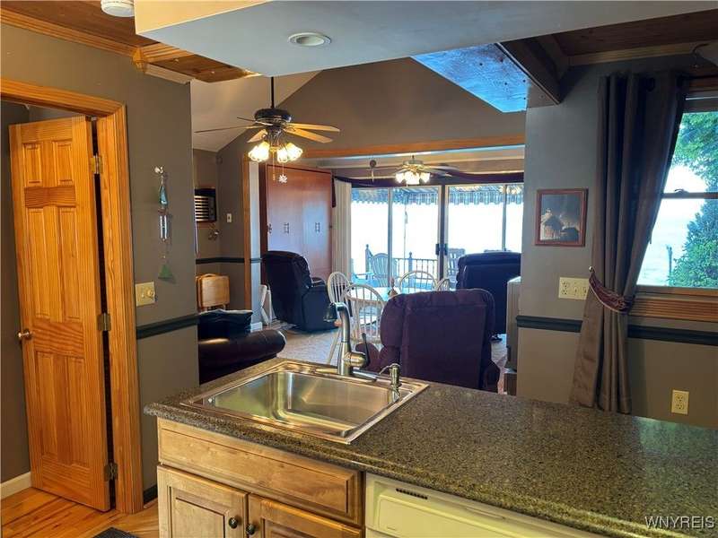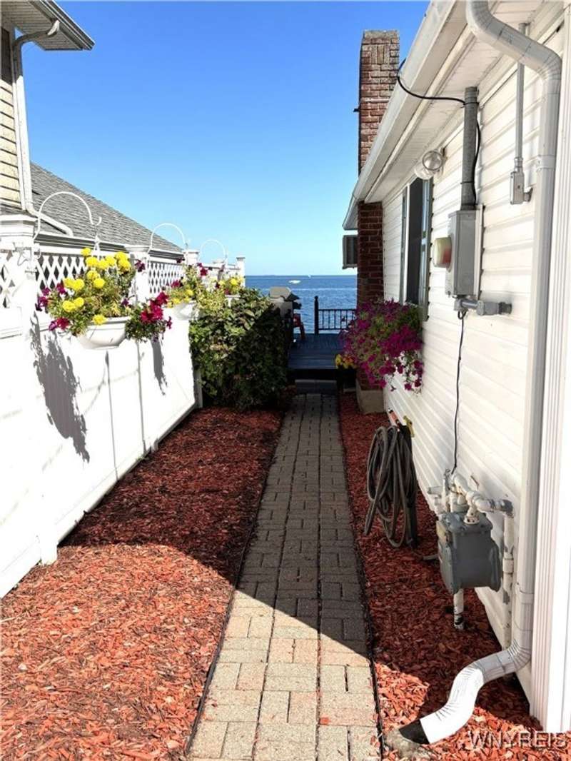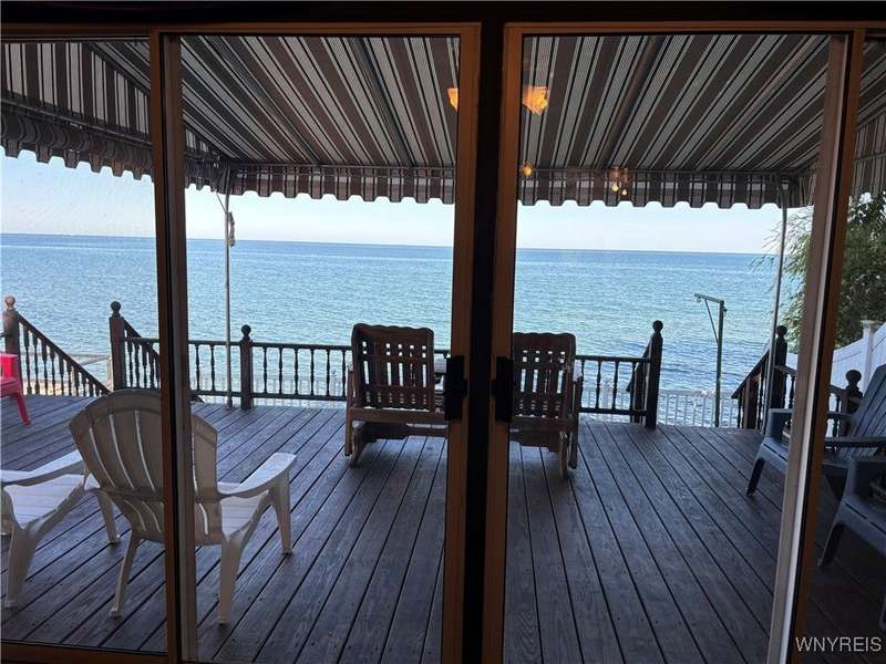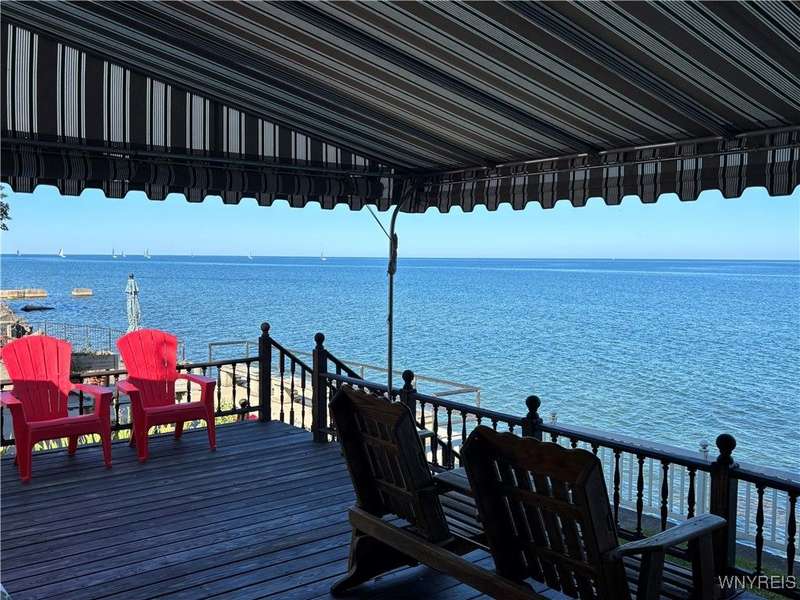 This is Bluff Living and a "Million-Dollar" view of Lake Ontario can be yours for a fraction of the cost! This year-round ranch home has all you ever want in a lakefront home. It has been spoiled...lovingly and meticulously maintained for the past 31 years. The newly added insulated 1.5 car garage (12x24) with power and workshop area and driveway lead to a private paver courtyard which has a table/chairs/storage sheds, all tastefully organized for plenty of storage. The beautiful lighted 56' retaining wall creates a beautiful ambiance. 35' of 6Ft. privacy fence on east side. Upon Entering the lead glass door a tiled foyer greets you. Pella windows in home. Left to the spacious bedroom with wood floor and 2 storage areas as well as a large closet. This is also where your washer/dryer are. To the right of the foyer is a spacious bath (6.8X5.10) with plenty of tasteful storage with a walk-in shower and heated tile floor. Continue to the kitchen which has Kraft-Maid cabinetry and solid surface counters. It's equipped with DW, Gas Range, Microwave and Refrigerator. Plenty of storage and cabinetry up lights. The bright living area with wood floors and vaulted ceiling has a dining area as well as natural gas wall heater and a gas fireplace, this LR area leads to the attached sunroom area with two 6-foot sliders. The sunroom area has a queen murphy bed for additional guest space. The view from LR/Sunroom area is fantastic. The 12x24 well maintained deck, with included gas grill and stairs lead to a grassy area overlooking the lake. The deck has a Kohler awning measuring 12x15. The paver walkway from the gas grill area lead to a beautiful paver walkway to the spacious courtyard to the front of the home. Every inch of this home has been tended to. Come see it - we think you will agree.