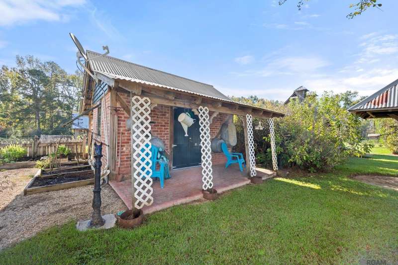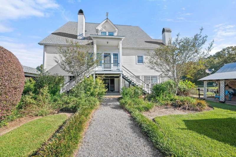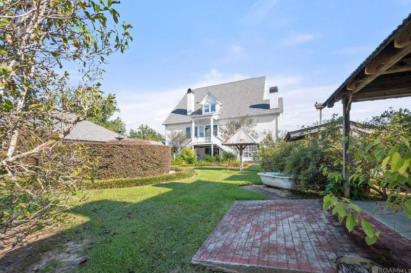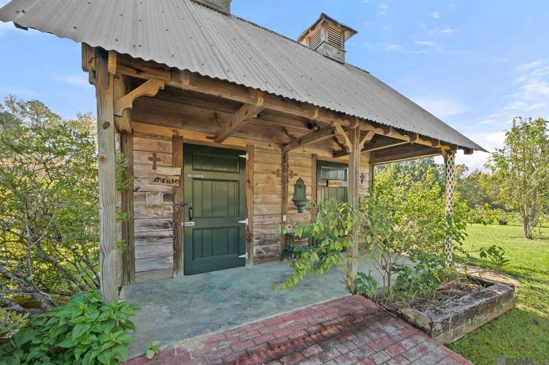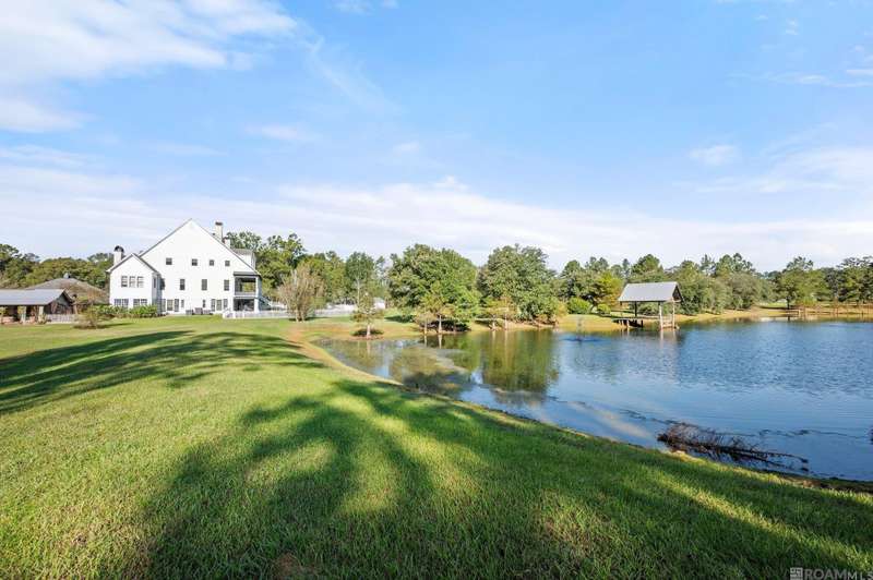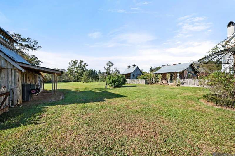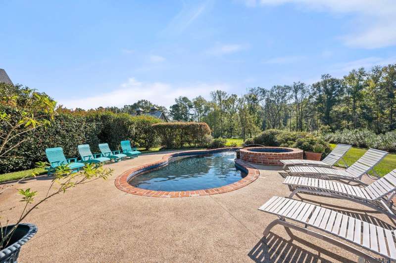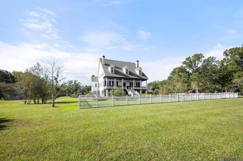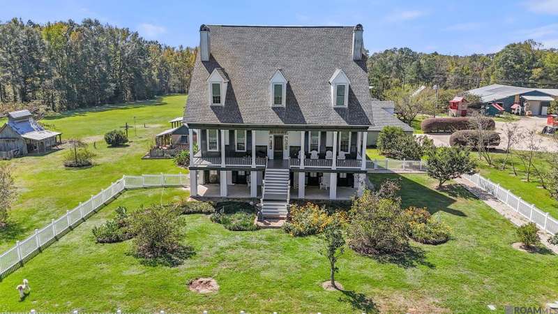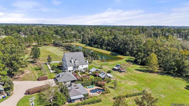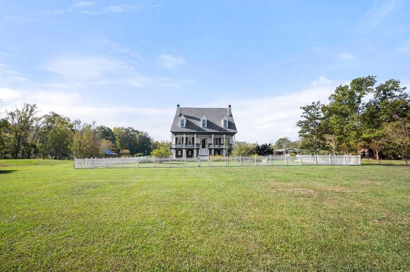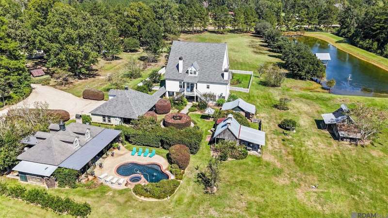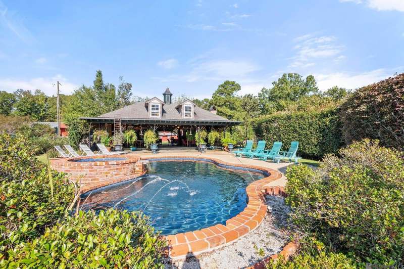 Nestled in Pine Grove's tranquil countryside, this sprawling 6,000+ sqft Acadian Style home offers grand living and natural beauty combined with the comfort of a family home. Attention to detail is evident throughout, from stacked crown molding and antique chandeliers to three fireplaces and wood and brick floors. The large kitchen overlooks the rear and side grounds, while a grand curved staircase leads to the third floor. The six bedrooms, each with ample closet space, and multiple living areas ensure comfort and privacy. The primary bedroom features an ensuite bathroom with a soaking tub, separate shower, and walk-in closet. Outside, the pool area includes an outdoor pavilion with a kitchen, dining and living space, and a fireplace, perfect for entertaining. Auxiliary buildings include a bath and outdoor shower near the pool and formal garden. The semi-detached garage has two enclosed bays and a center carport. A pond borders the left side of the home, adding to the serene setting. This luxurious property offers a peaceful country lifestyle amidst stunning natural surroundings.