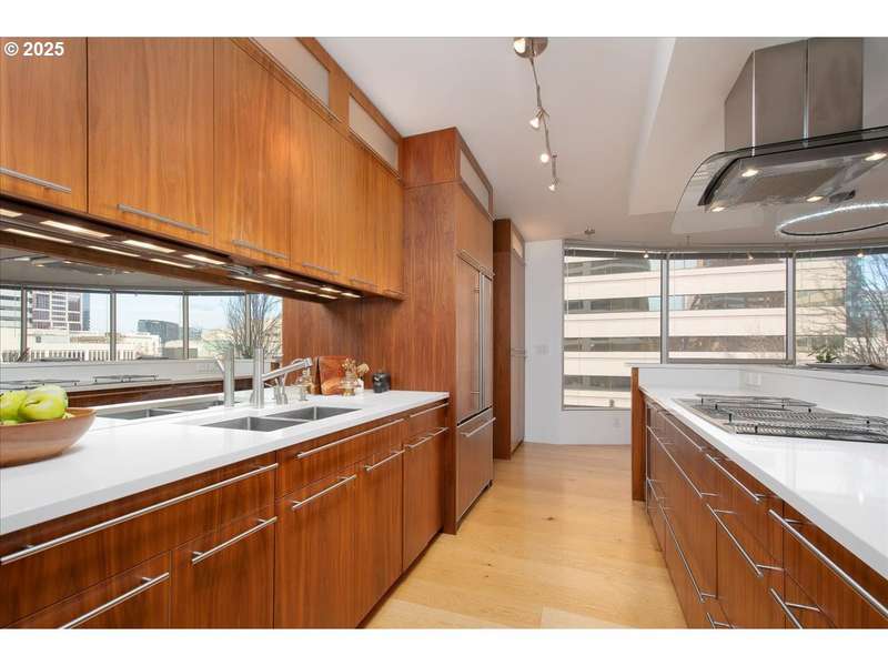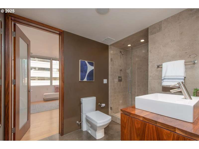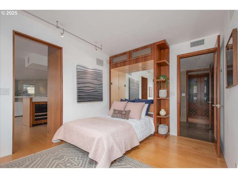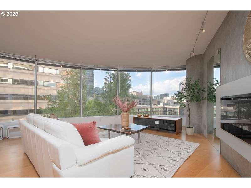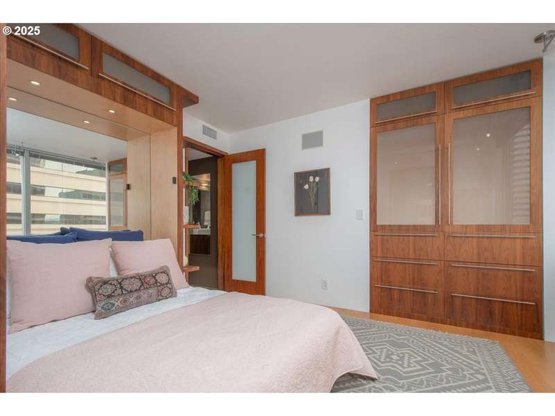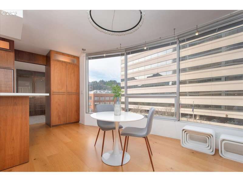 Originally recreated by designer Fritz Junker as his personal residence; this unit was a stud's out remodel. Contemporary yet classic luxury living. Nestled in the heartbeat of downtown Portland, this 2-bedroom, 2-bathroom condo within the steel and glass embrace of a modern high-rise tower presents a lifestyle of urban luxury and convenience.Bathed in abundant natural light, the interior is a design sophistication, boasting luxurious high-end finishes at every turn. The warmth of white oak floors pairs exquisitely with the rich, dark grain of walnut doors and panels, while custom lighting casts an inviting glow over the space. A chef's culinary kitchen outfitted with top-tier appliances where one can craft gourmet meals surrounded by the views through sweeping windows.The second bedroom/office is fitted with a space-saving Murphy bed and caters to guests with an adjoining bath. The sanctuary of the primary suite is defined by the custom walnut platform bed and built-in closet with TV. The primary luxury bath offers an indulgent steam shower experience, heated floor plus a TV embedded within the bathroom mirror adds a touch of modernity.The concierge is located in the recently renovated lobby with the main floor library, gym, and meeting area. The private outdoor space has an extensive patio area, complete with barbecues and a pool, ideal for social gatherings or serene afternoons alike. The light rail ensures seamless connection to the wider city, while the intellectual and cultural buzz of nearby universities, theatres, arts venues, and restaurants offer endless opportunities.
