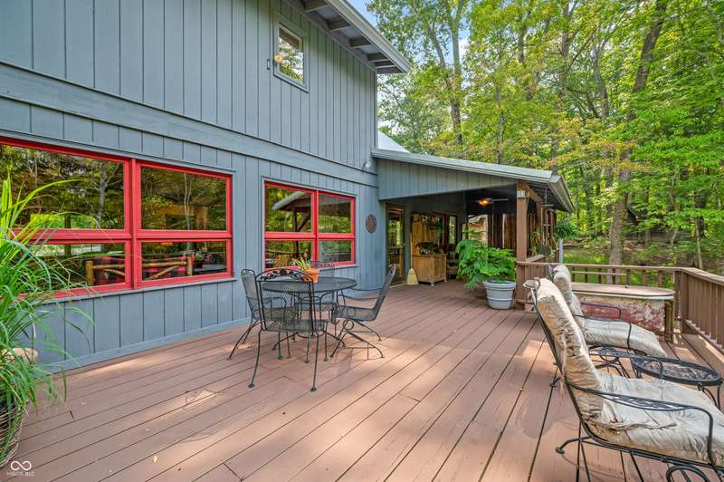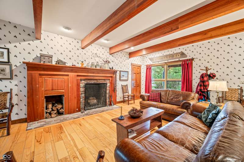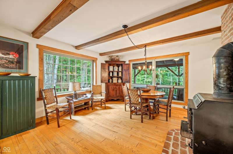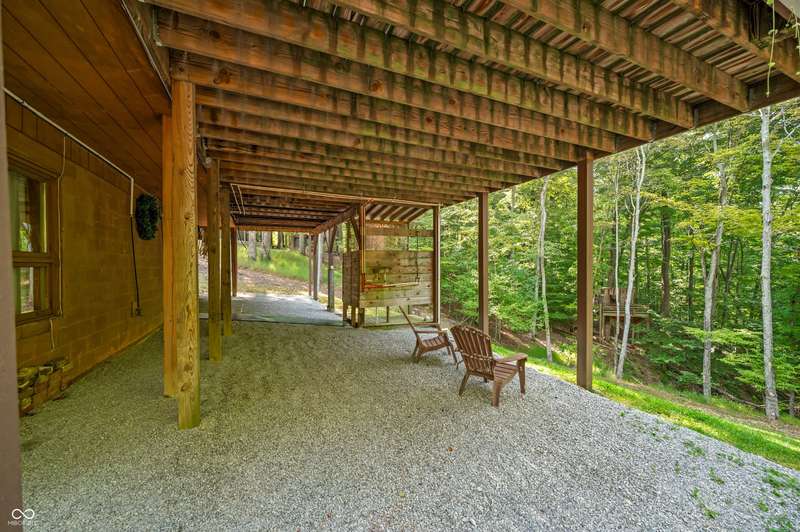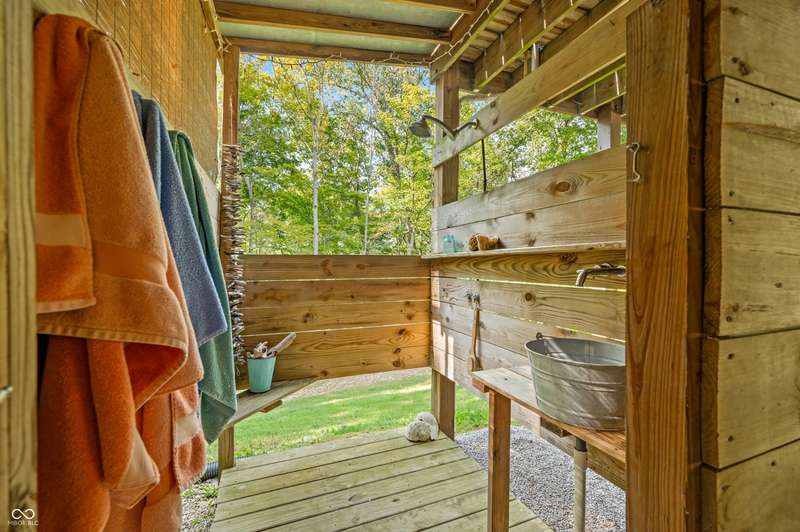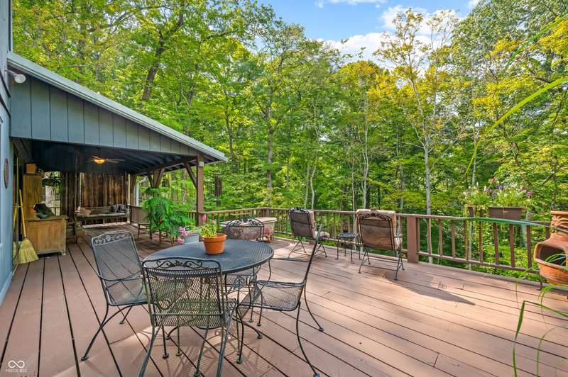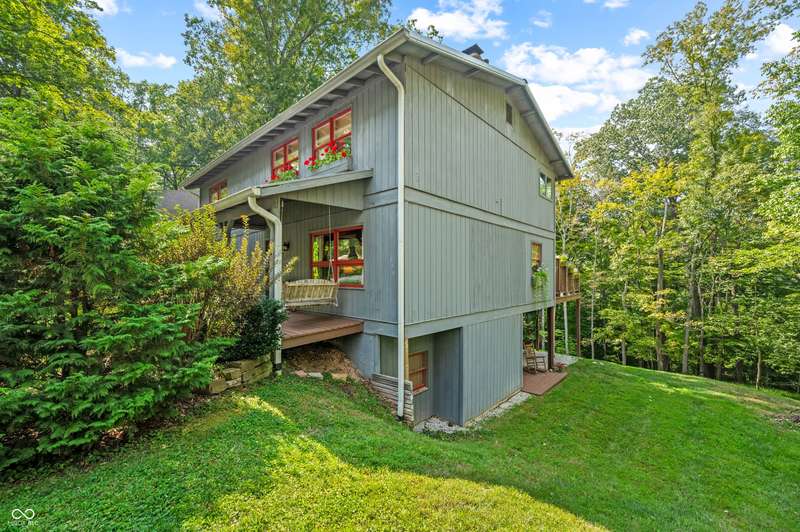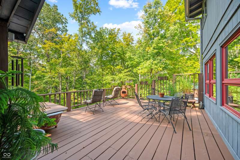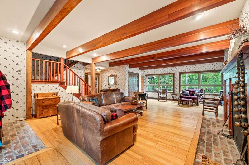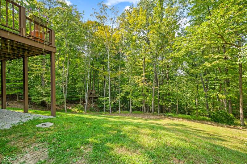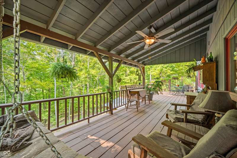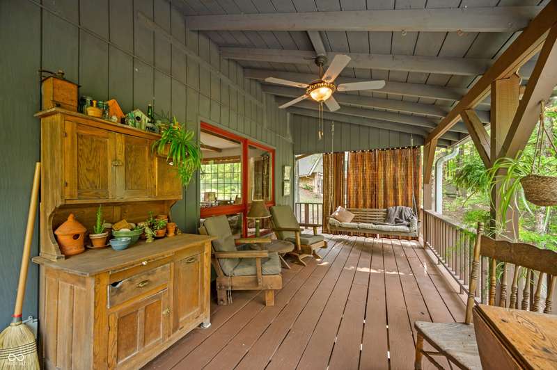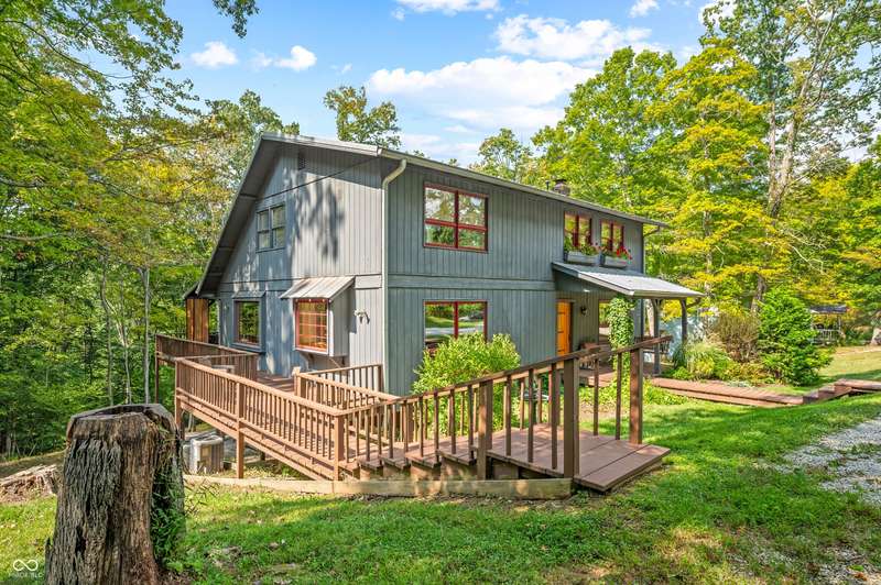 Nestled in the serene Annandale Estates of Brown County, just minutes from downtown Nashville, this rustic, bi-level home exudes warmth and character. Brown County craftsmanship is evident throughout, from the sassafras doors, cherry and sassafras beams to the custom maple countertops & cabinets in the kitchen, adding a touch of natural elegance. The living room welcomes you with the hardwood Ash floors & a Rumford fireplace, complete with a gas starter, custom-built mantel & integrated wood storage. Designed for comfort & style, the space includes a cozy seating area, perfect for enjoying quiet moments in a setting that puts you close to nature. The spacious kitchen & dining room blend seamlessly, creating an inviting heart of the home where the hardwood floors continue to flow. The dining area is anchored by a wood stove set against a beautiful brick hearth, offering warmth and ambiance. The kitchen is open with large windows that bathe the space in natural light. Custom cabinets & maple countertops add a touch of elegance & practicality. With 3 bedrooms and 3.5 baths, this home offers flexible living arrangements to suit a variety of needs. The main bedroom suite is a bright & airy retreat designed for relaxation. This spacious sanctuary offers a tranquil atmosphere, perfect for unwinding. The ensuite bath features a 2-person, jetted soaker tub, a separate shower, & a private water closet, providing a spa-like experience. On the lower level, a well-appointed guest suite offers privacy & comfort, complete with its own living area, full bath, & a private entrance. Each bedroom is designed with comfort & versatility in mind, providing ample space & unique character, while the bathrooms offer both style & function. Enjoy outdoor living space on the main deck that provides both sun & shade and is plumbed and ready for an outdoor clawfoot tub. The lower level features an outdoor shower, ideal for rinsing off after exploring the beautiful surroundings.