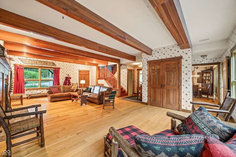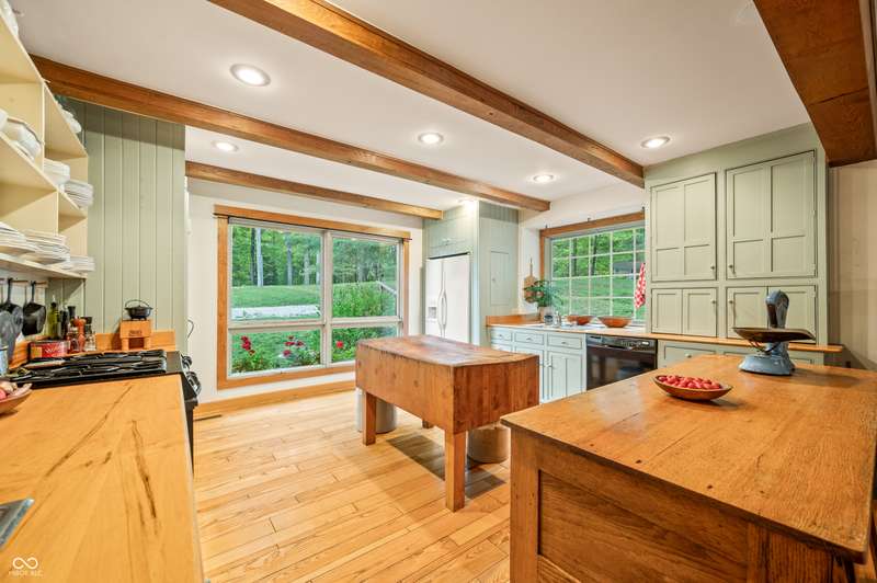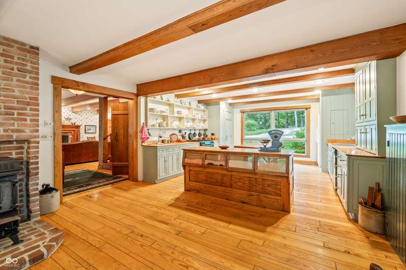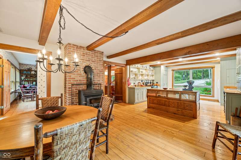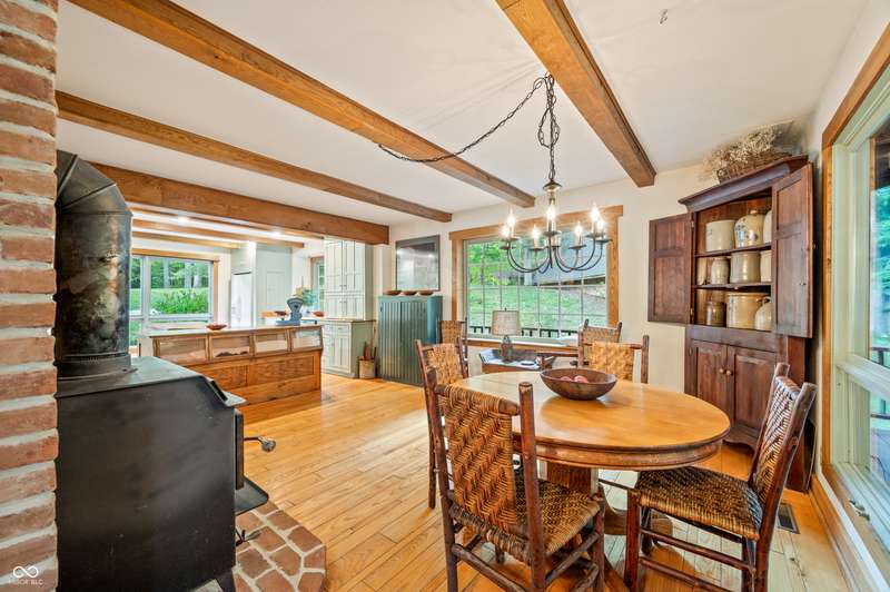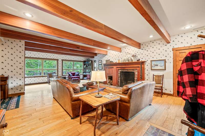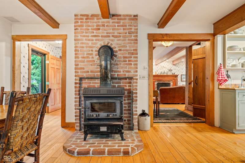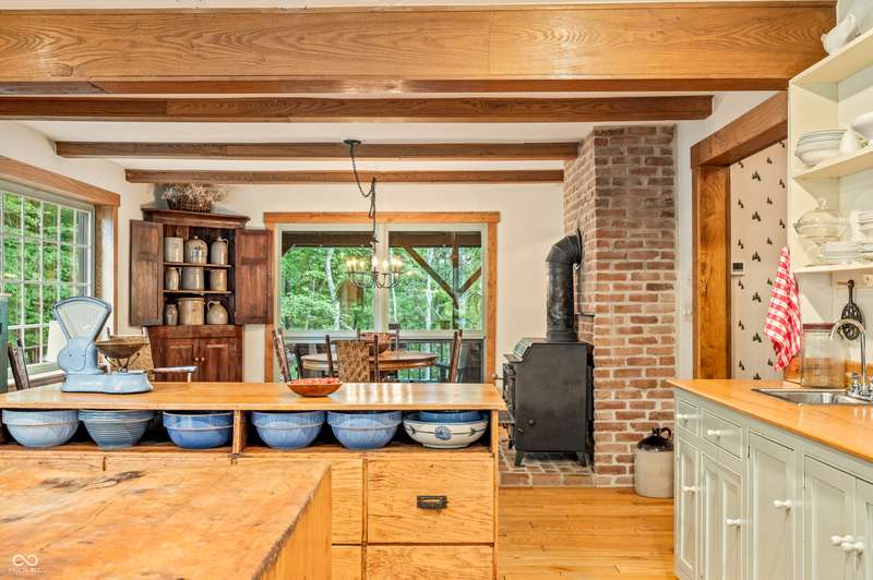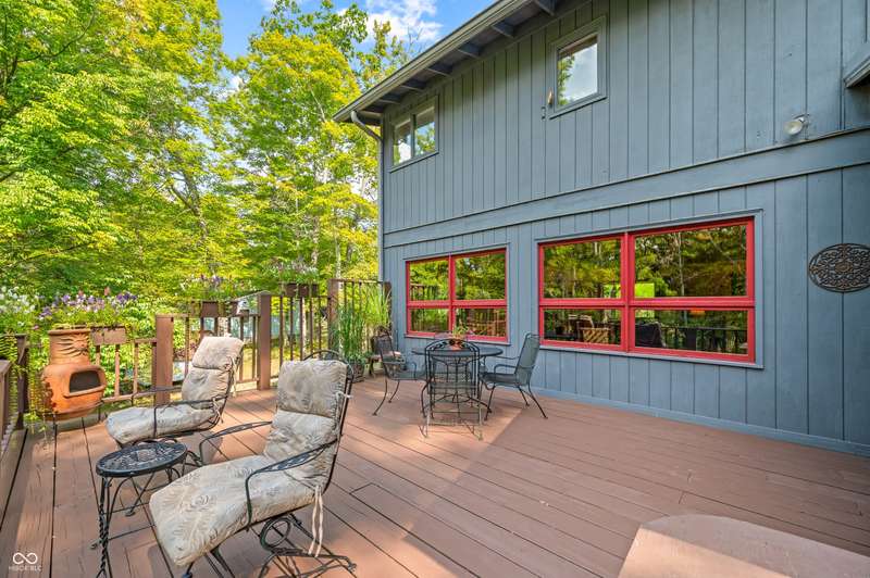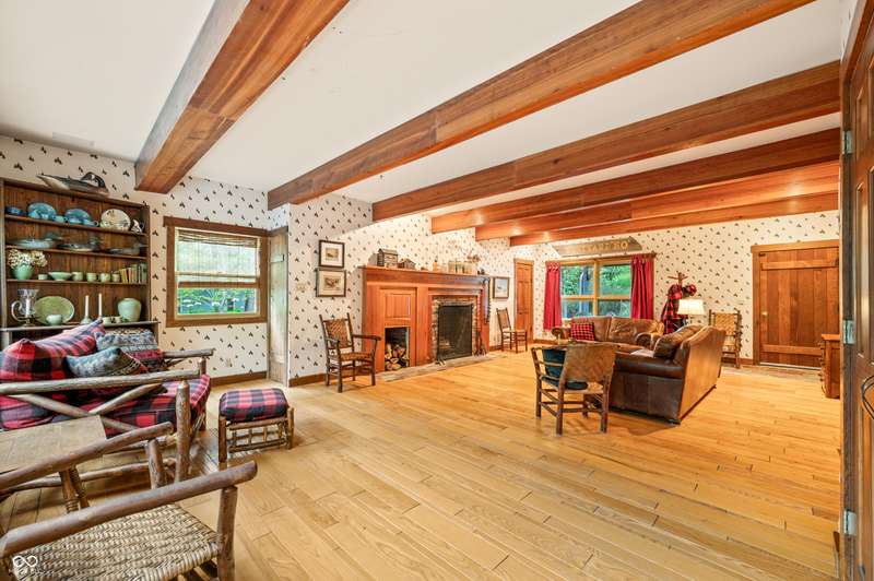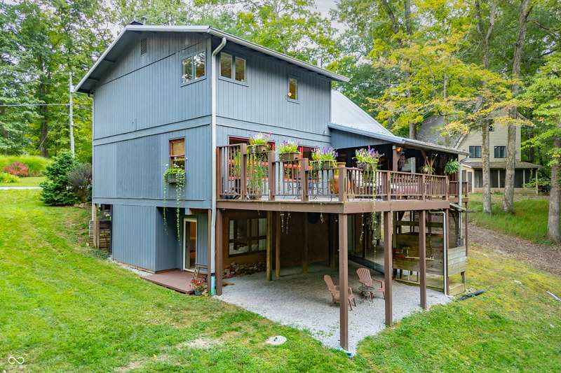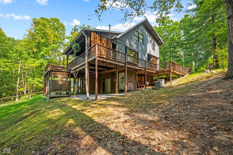 Nestled in the serene Annandale Estates of Brown County, just minutes from downtown Nashville, this rustic, bi-level home exudes warmth and character. Brown County craftsmanship is evident throughout, from the sassafras doors, cherry and sassafras beams to the custom maple countertops & cabinets in the kitchen, adding a touch of natural elegance. The living room welcomes you with the hardwood Ash floors & a Rumford fireplace, complete with a gas starter, custom-built mantel & integrated wood storage. Designed for comfort & style, the space includes a cozy seating area, perfect for enjoying quiet moments in a setting that puts you close to nature. The spacious kitchen & dining room blend seamlessly, creating an inviting heart of the home where the hardwood floors continue to flow. The dining area is anchored by a wood stove set against a beautiful brick hearth, offering warmth and ambiance. The kitchen is open with large windows that bathe the space in natural light. Custom cabinets & maple countertops add a touch of elegance & practicality. With 3 bedrooms and 3.5 baths, this home offers flexible living arrangements to suit a variety of needs. The main bedroom suite is a bright & airy retreat designed for relaxation. This spacious sanctuary offers a tranquil atmosphere, perfect for unwinding. The ensuite bath features a 2-person, jetted soaker tub, a separate shower, & a private water closet, providing a spa-like experience. On the lower level, a well-appointed guest suite offers privacy & comfort, complete with its own living area, full bath, & a private entrance. Each bedroom is designed with comfort & versatility in mind, providing ample space & unique character, while the bathrooms offer both style & function. Enjoy outdoor living space on the main deck that provides both sun & shade and is plumbed and ready for an outdoor clawfoot tub. The lower level features an outdoor shower, ideal for rinsing off after exploring the beautiful surroundings.