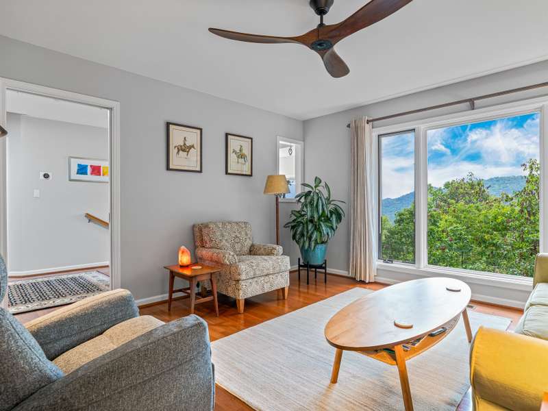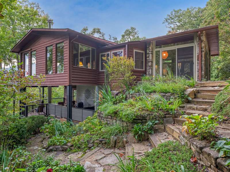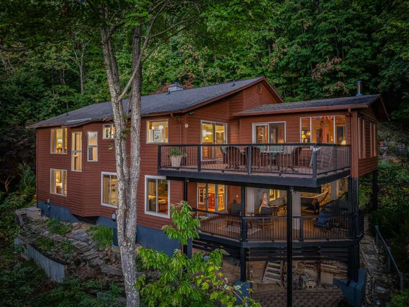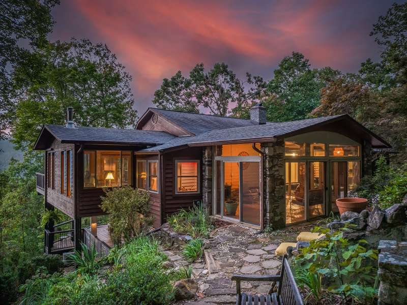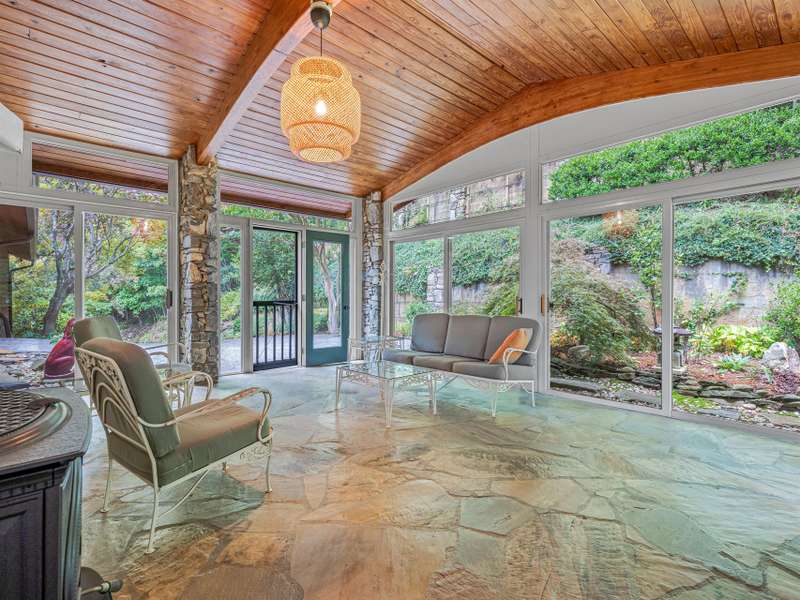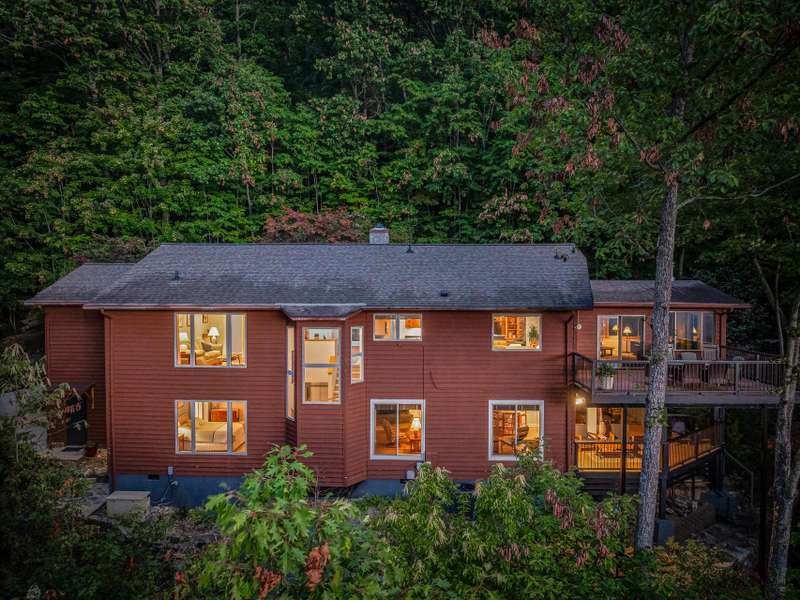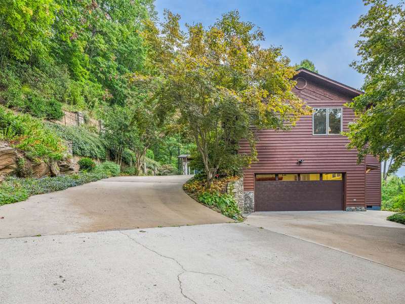 Contemporary design meets mountain luxury at this stunning mountain retreat in the coveted Sondley Estates. Perched on a private, elevated lot just minutes from downtown Asheville, you'll quickly be swept away by the long-range, west-facing views of the Blue Ridge Mountains. The perfect blend of modern comfort and natural serenity. Step inside to discover an open-concept main level featuring vaulted ceilings, expansive windows, and stunning oak wood floors. A custom stone fireplace anchors the living room, while clean architectural lines and natural materials throughout reflect a refined, mid-century-inspired aesthetic that echo its breathtaking surroundings. The chef's kitchen is a standout?equipped with high-end appliances, cherry wood cabinetry, granite countertops, and elegant stone-tiled floors. Flow into the spacious sunroom, where a J?tul wood stove, wood-paneled ceilings, and wraparound views create the ultimate space to relax as the sun sets behind the mountains. The lower level offers flexible living space with abundant natural light and a ?treehouse? feel?perfect for hosting guests, creating a studio, or relaxing in total privacy. Sliding glass doors lead to an expansive covered deck that extends the living space outdoors where you'll be greeted with intimate mountain vistas across the French Broad River valley. Recent updates include a new HVAC system, new garage door, and new mini-split units for added comfort throughout. The oversized two-car garage provides tall ceilings and ample storage. Nature lovers will appreciate the convenient access to recreation as this property backs-up directly to the Blue Ridge Parkway?offering easy connection to the Mountains-to-Sea Trail via nearby access points on Upper Sondley Drive. Steps from the garden area of this home lead directly to the Blue Ridge Parkway providing a timely commute to incredible hiking or biking options. Whether you're seeking a refined second home or a peaceful escape in one of Asheville's most sought-after communities, this is luxurious mountain living at its finest.