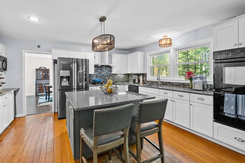 This elegant all-brick Colonial style home offers timeless style w/over 3,300 finished SF. Inside, the formal Living Room and Dining Room feature rich bamboo wood flooring, w/a cozy gas fireplace in the LR. The completely updated kitchen showcases new cabinets, quartz countertops, glass tile backsplash, a large pantry, island seating and top-of-the-line appliances.. including a 5 burner gas stove, double oven and wine fridge. Next to the kitchen is the informal eating area with sliders to a large deck where you can enjoy views of the impressive back yard framed by mature trees and the scenic Gun River. The inviting family room with solid oak floors and lovely brick wood burning fireplace rounds out the main floor. The elegant winding staircase leads to 4 oversized bedrooms , all with stunning hickory wood flooring. The primary suite is a true retreat featuring dual closets, double sinks, tile flooring and walk in shower. Come take a tour, and envision yourself in this beauty