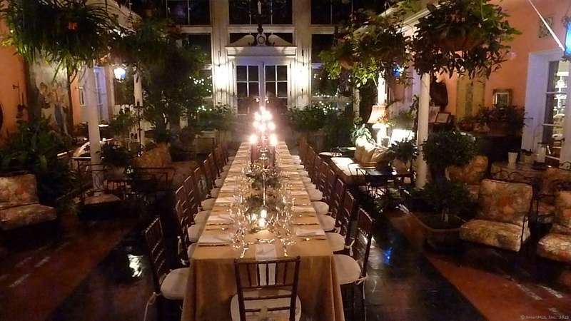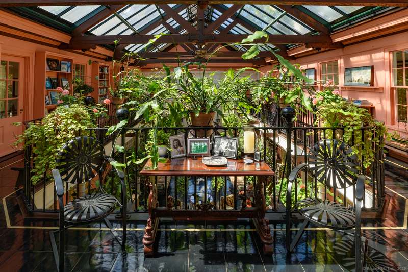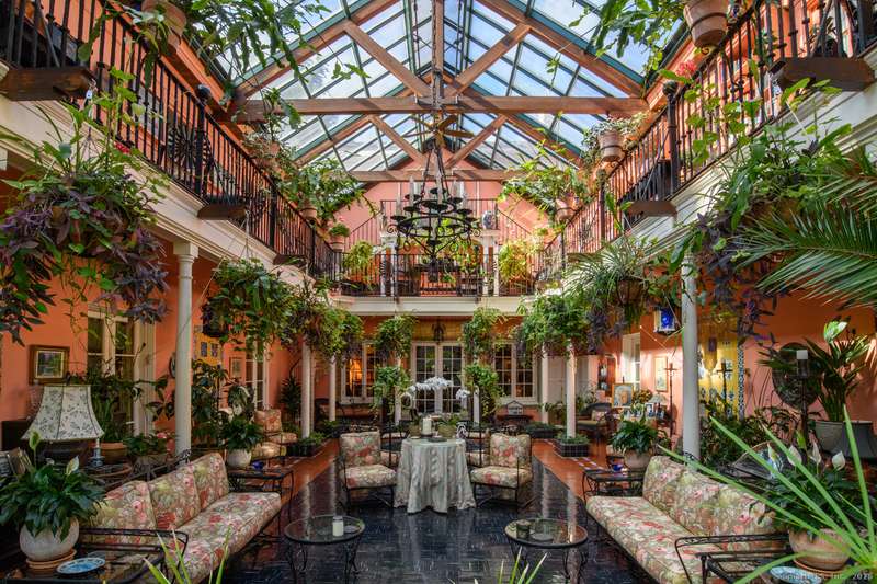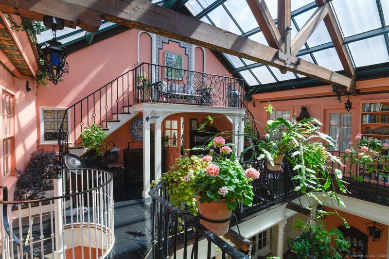 Enjoy estate living with the convenience and ease of a shared community. Amenities include a 70ft heated pool, tennis and separate paddle/pickle courts. Owned by a noteworthy family for over 100 years, this is a rare opportunity to reside in one of Sharon's most treasured properties. The home encompasses the majority of the original mansion and was thoroughly renovated in 2013 with tasteful choices that maintain and enhance the original character. 2 wings which once surrounded a courtyard are now covered with a magnificent 3 story glass ceiling and heated for year-round use. This New Orleans style atrium is adorned with wrought iron bannisters, stenciled beams, romantic tile fountain, and antique lanterns all accentuated by an exquisite array of plants/trees. The atrium is the highlight and heart of the home, hosting many elegant dinners and weddings. The plants have been thriving for decades and can be included in a sale. There is a plant caretaker in place. 8 total bedrooms include p