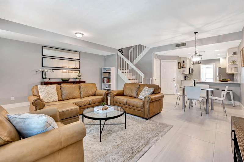 Beautifully updated 3-bedroom, 2-bathroom townhouse in a prime location just steps from the Abacoa Golf Course. This home features elegant tile flooring on the main level and warm wood floors upstairs, blending style with comfort. The modern kitchen and bathrooms are finished with sleek quartz countertops, creating a contemporary yet inviting feel. Enjoy the convenience of being close to restaurants, shops, the Abacoa Amphitheatre (host to numerous concerts) and Roger Dean Chevrolet Stadium (the spring training home of the Marlins and Cardinals). Experience the best of Jupiter living in one of the area's most desirable communities. New roof 2021, Water Heater 2023, AC 2018.
